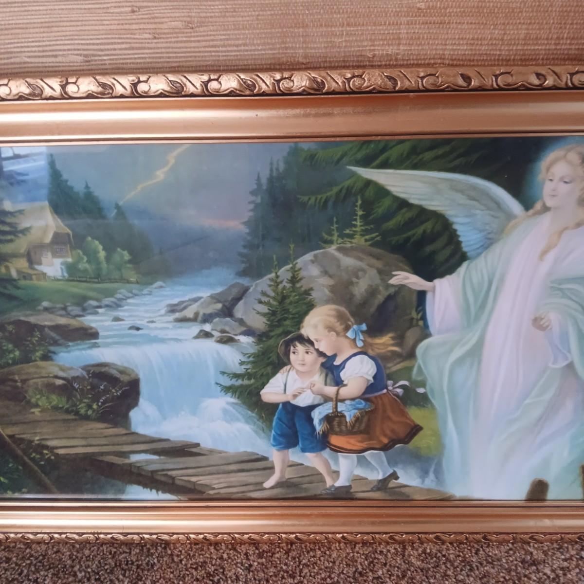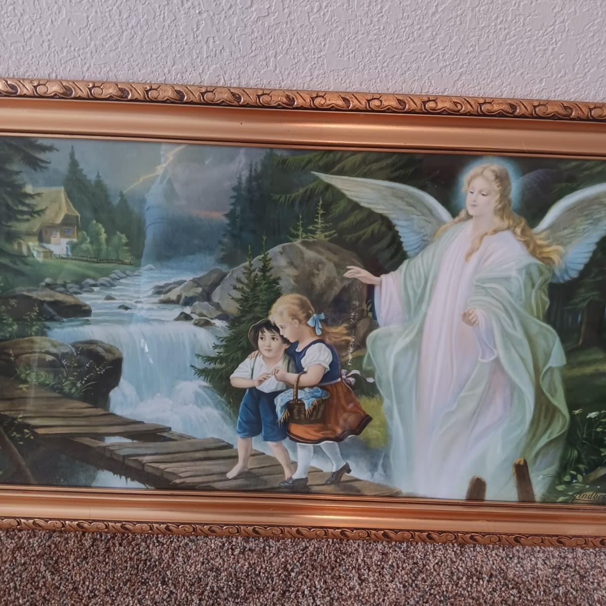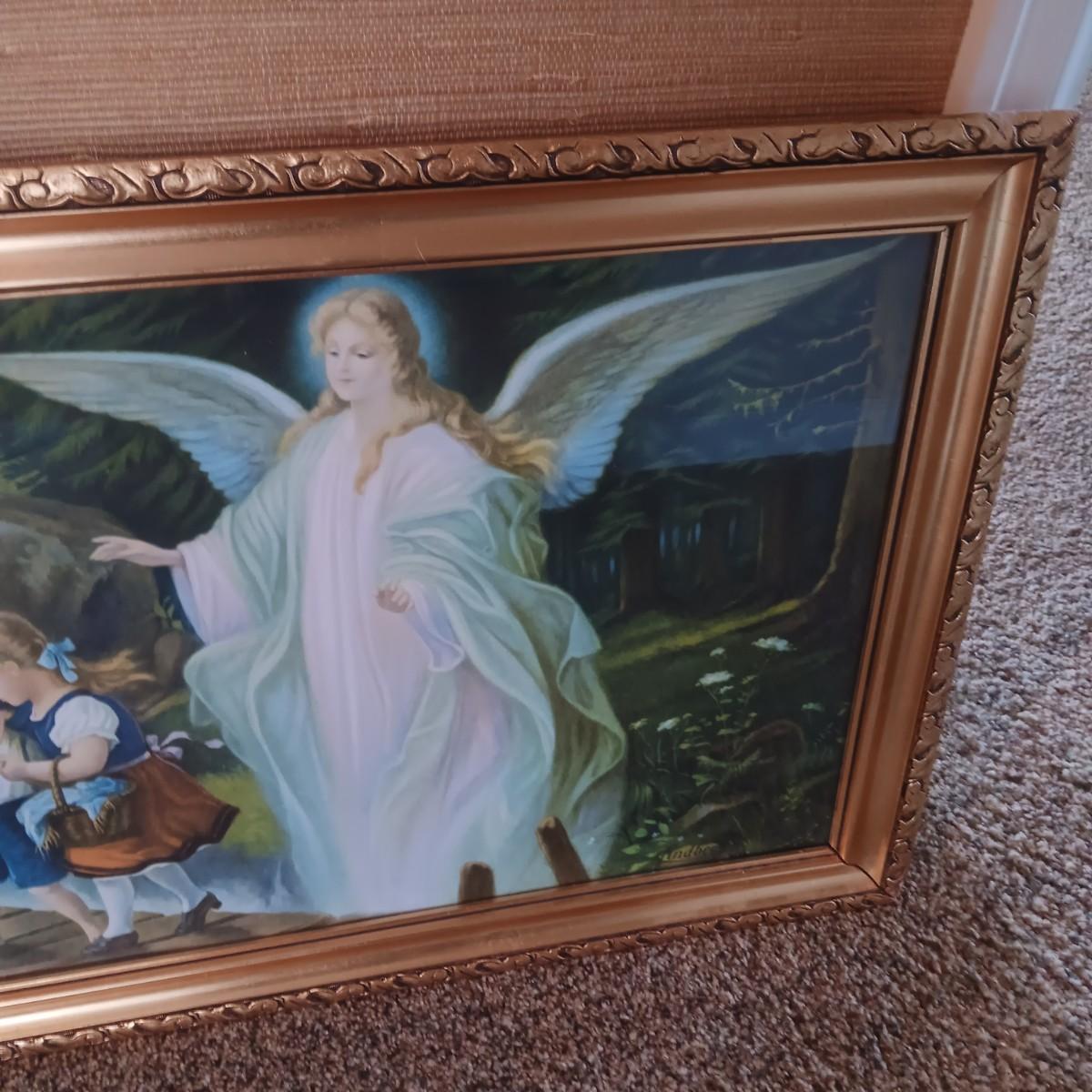 LINDBERG GOLD FRAMED PICTURE OF AN ANGEL WATCHING OVER 2 CHILDREN