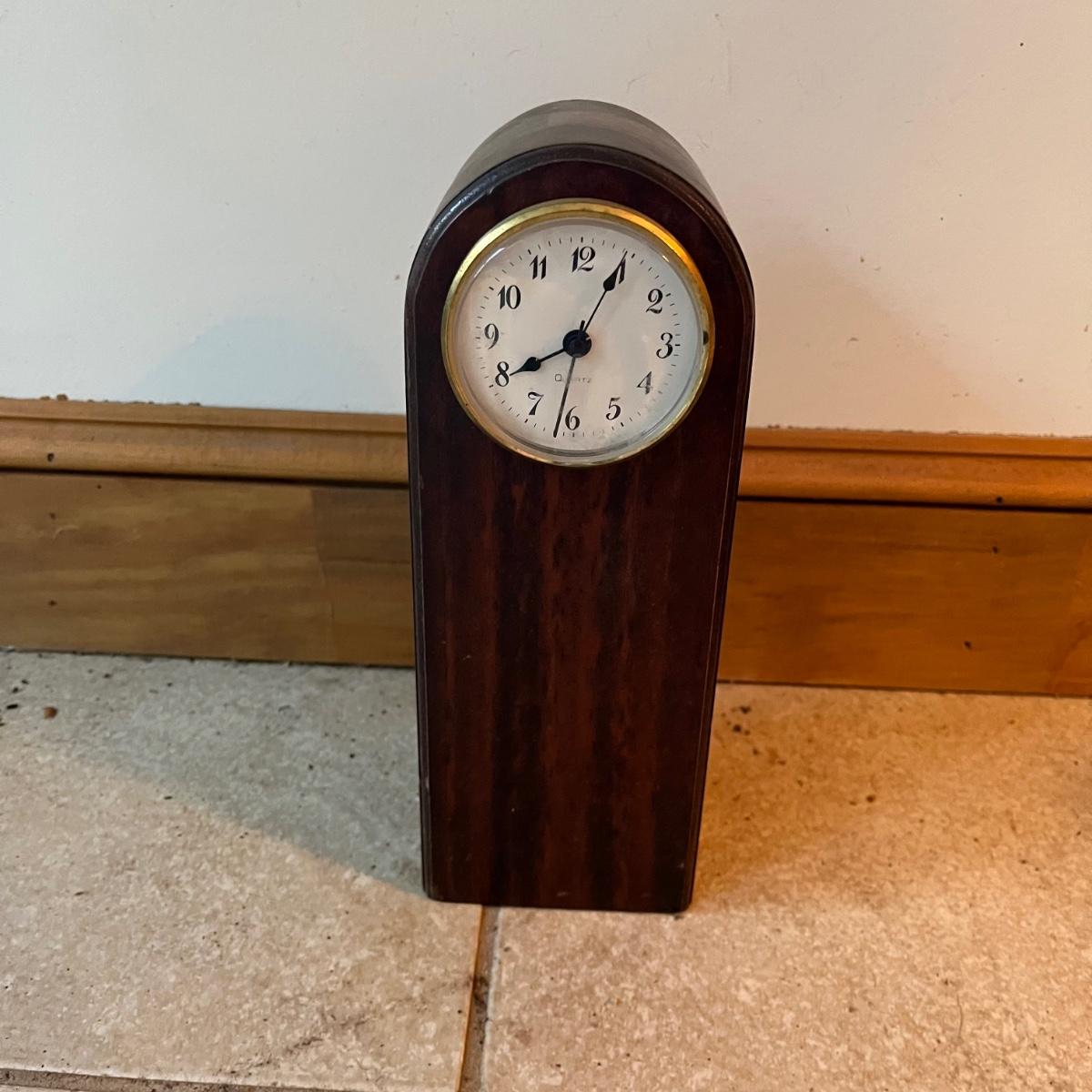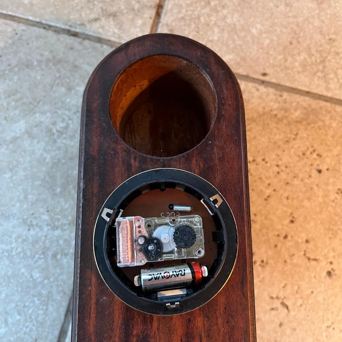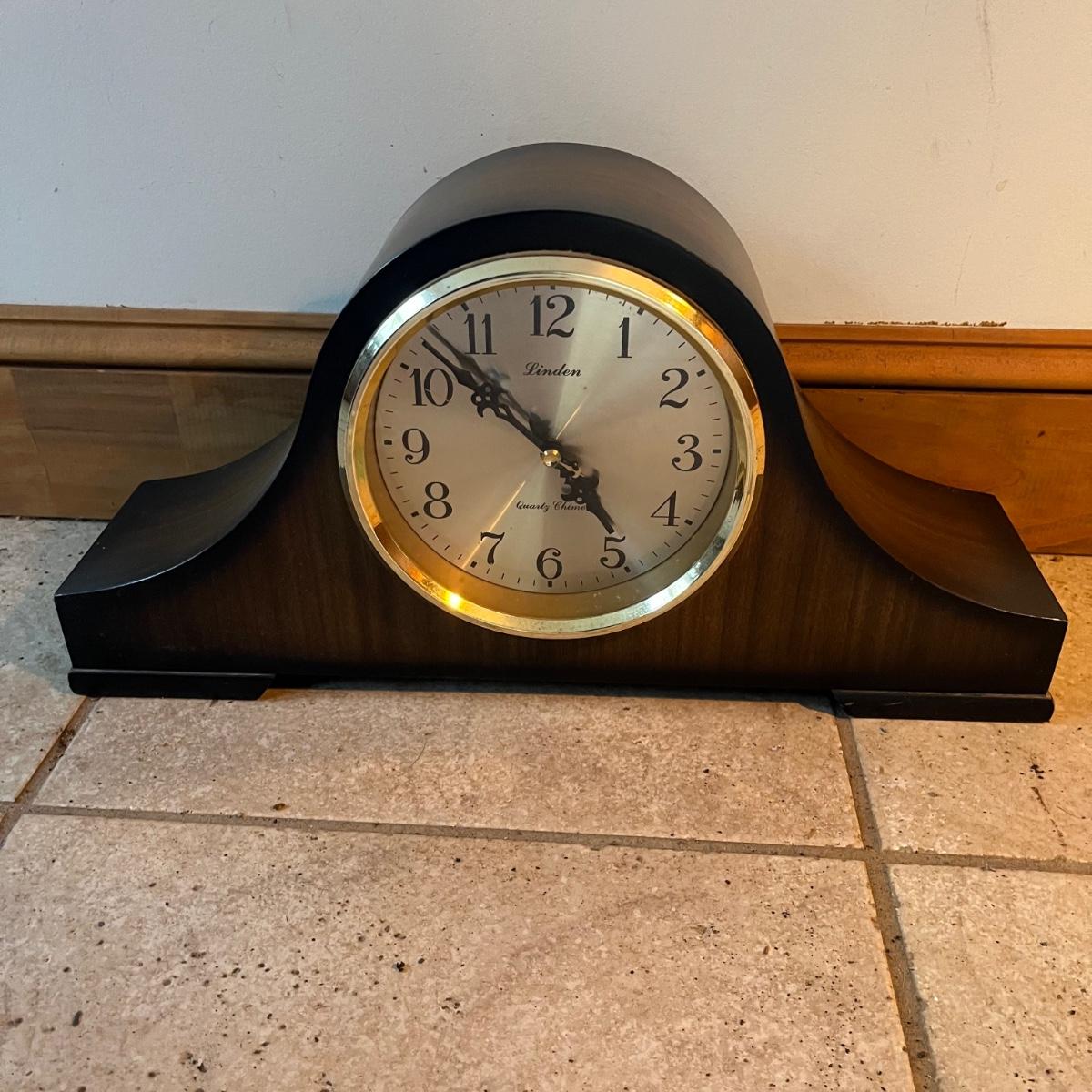 Two clocks here that includes a signed wooden Beehive clock and a wooden Linden mantle clock. Both clocks need batteries and were not tested. Mantle clock clock measures 4” x 16.5” x 8.5”.