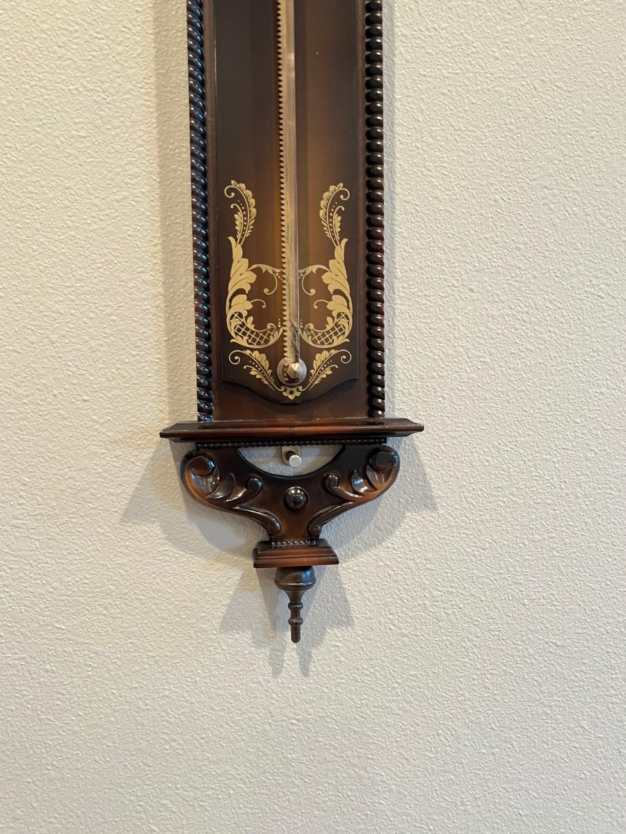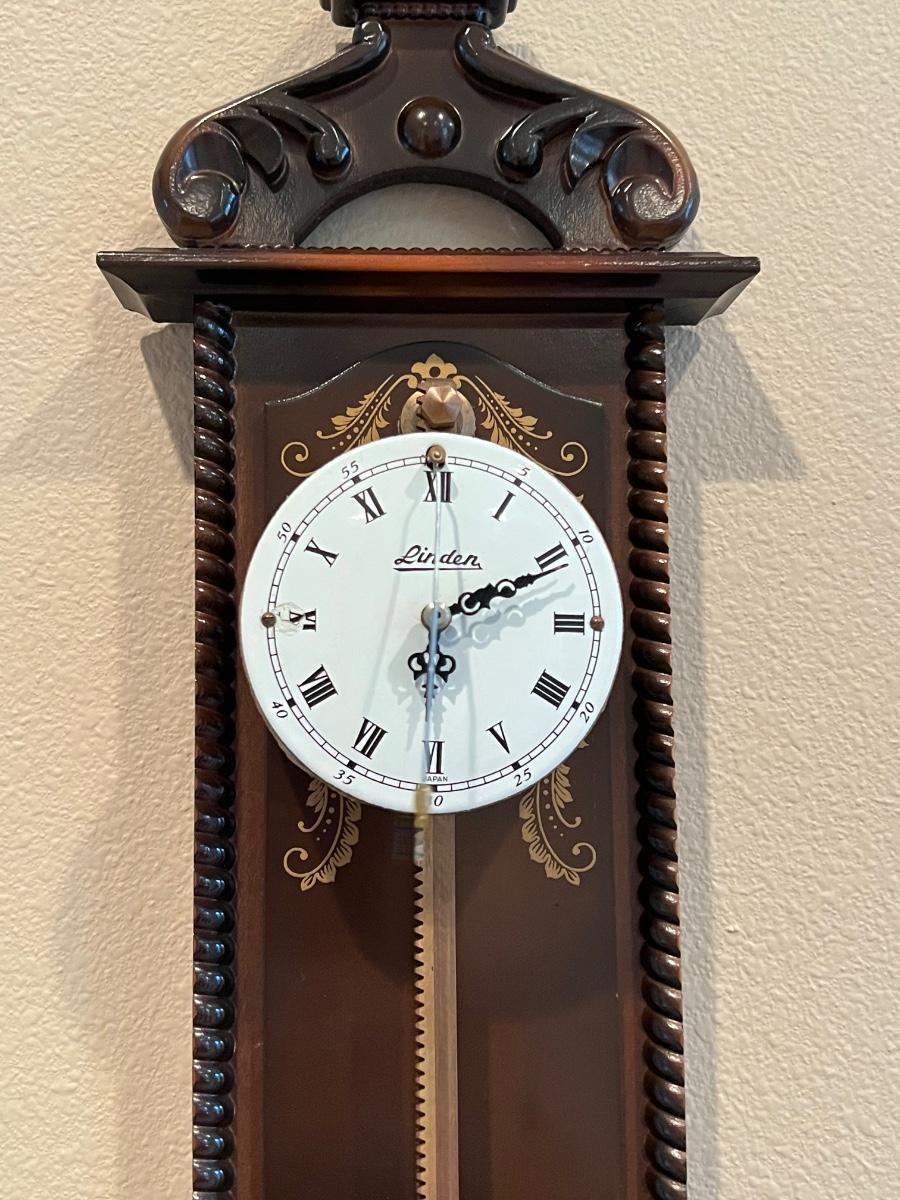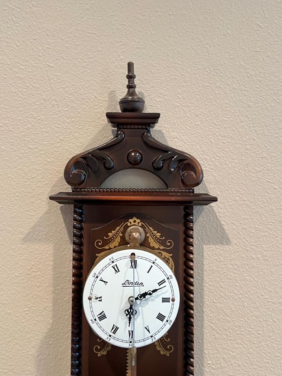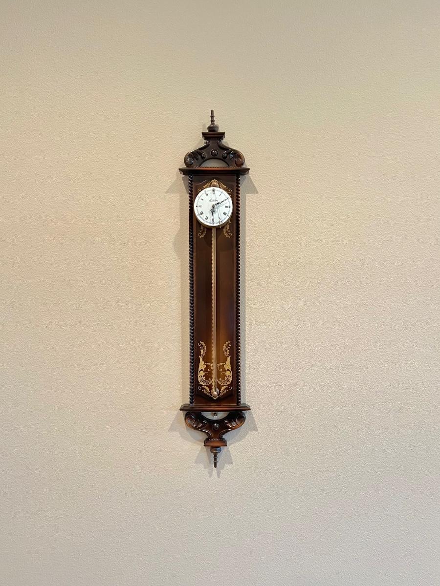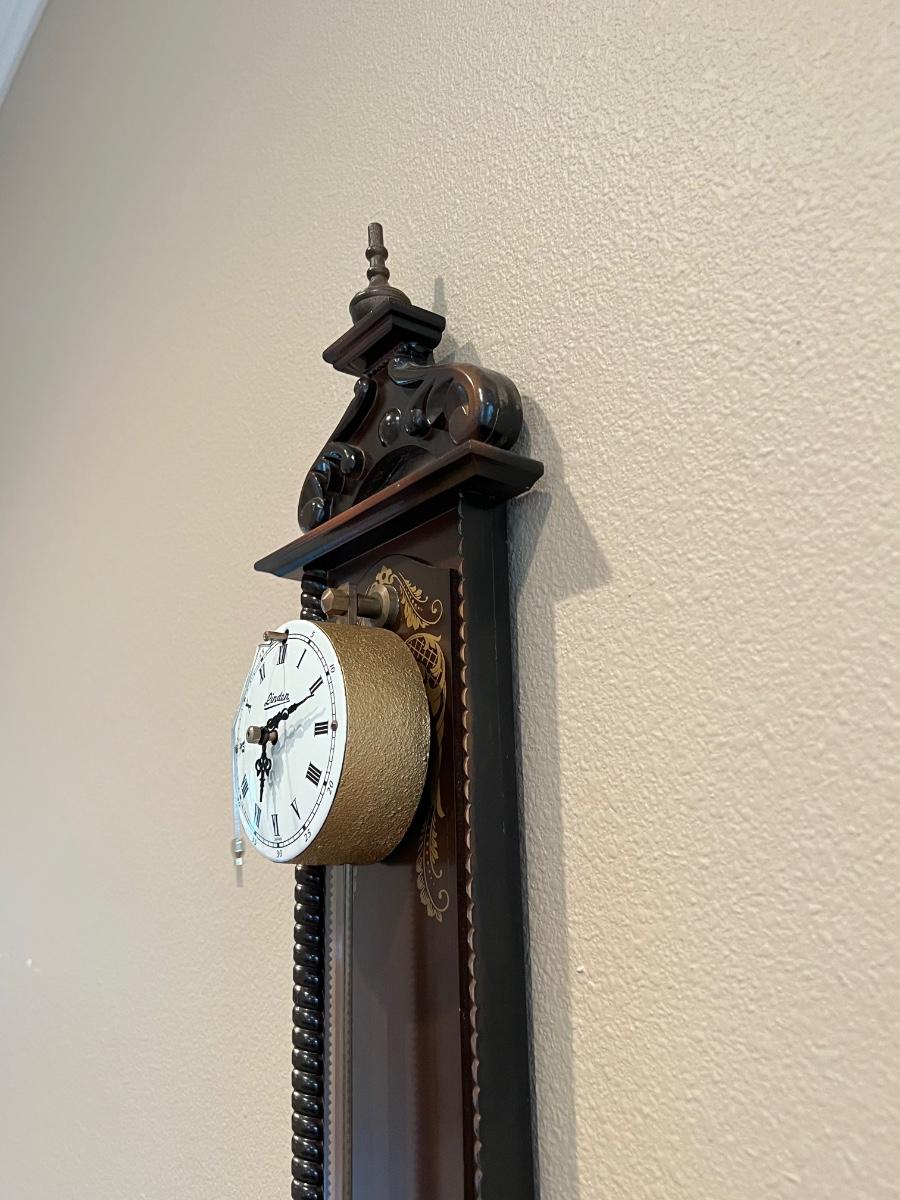 34” H x 6.75” W x 4” D ~ Runs perfectly and keeps accurate time.