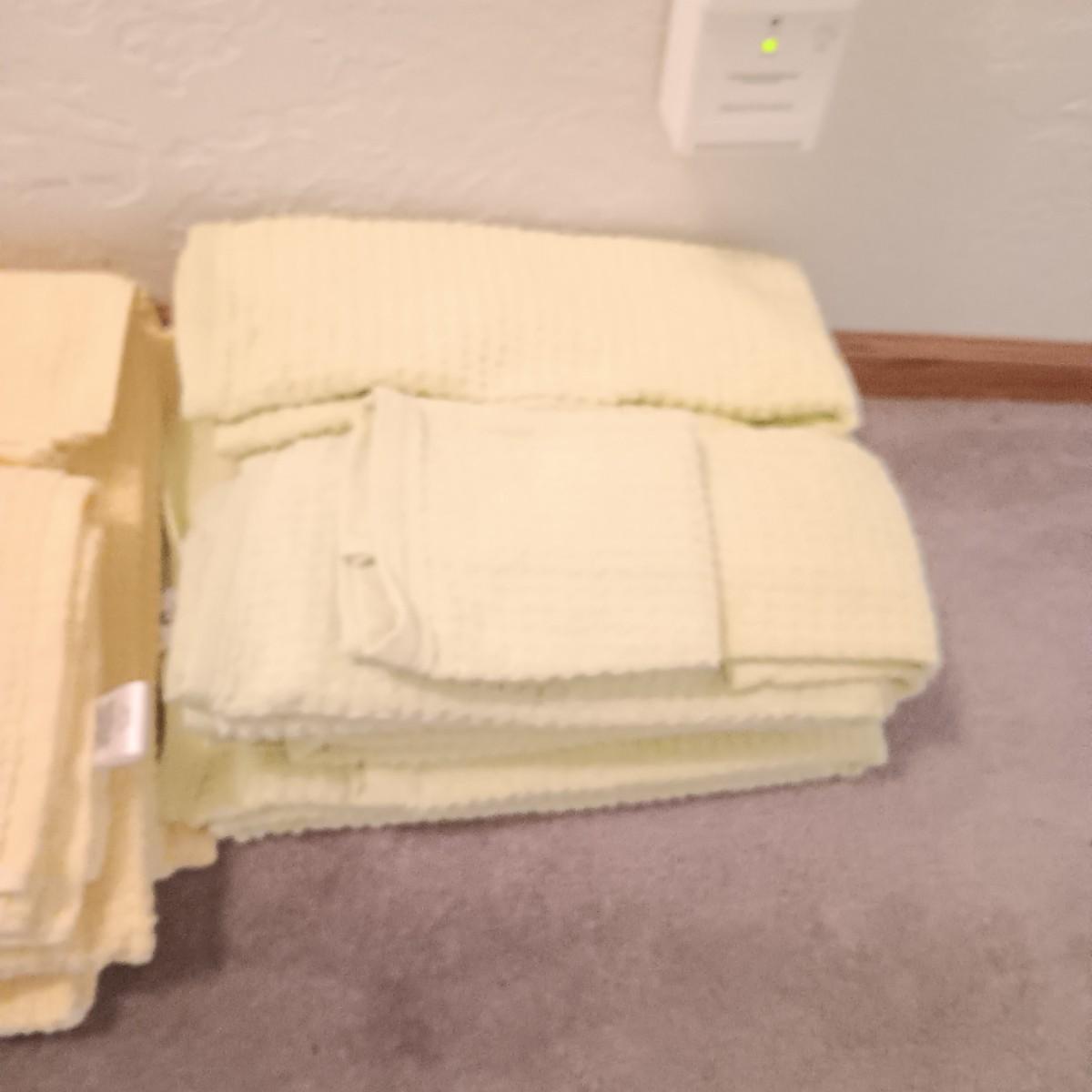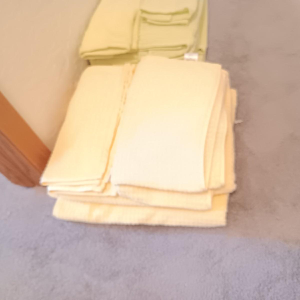 WICKER LAUNDRY HAMPER WITH LIME GREEN AND YELLOW BATH TOWEL SETS