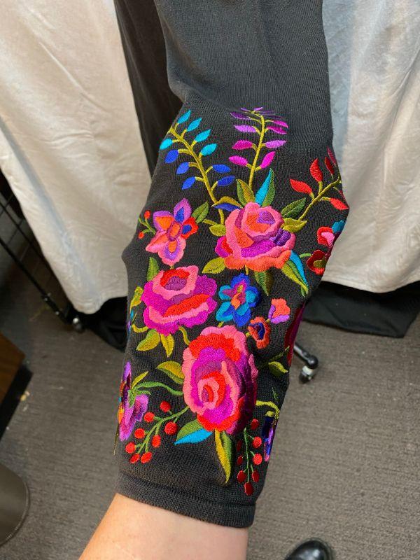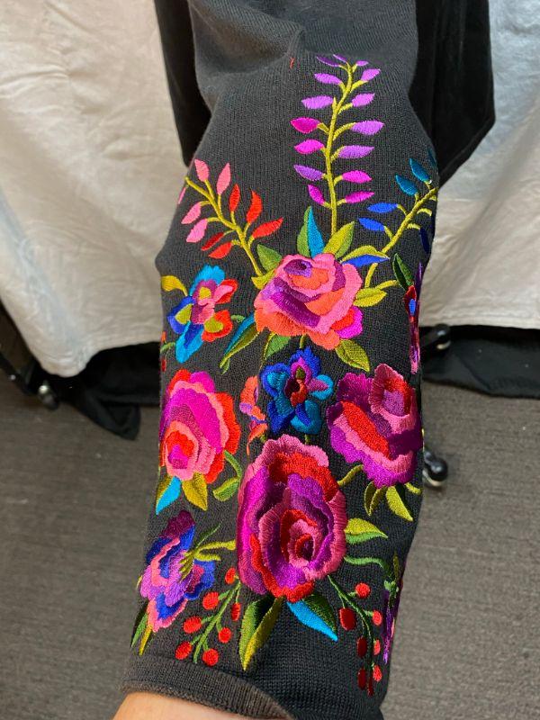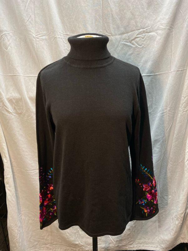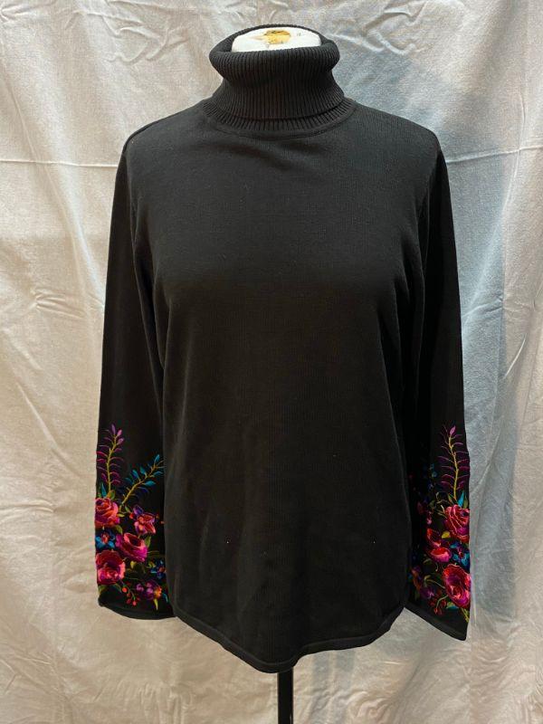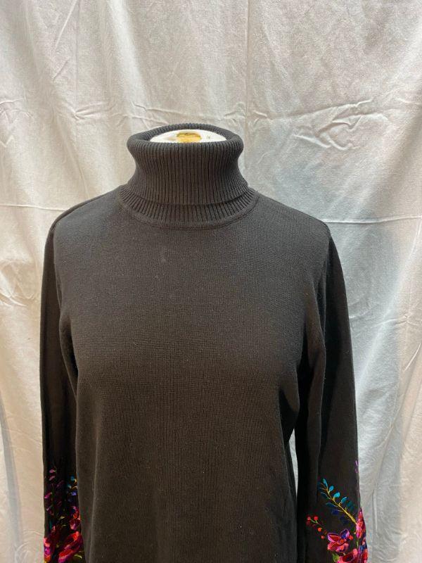 Linea by Louis Dell'Olio Black turtleneck sweater tunic. Brightly colored floral pattern embroidered at the lower end of sleeves. Good condition. Size Large.