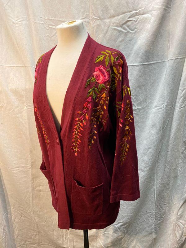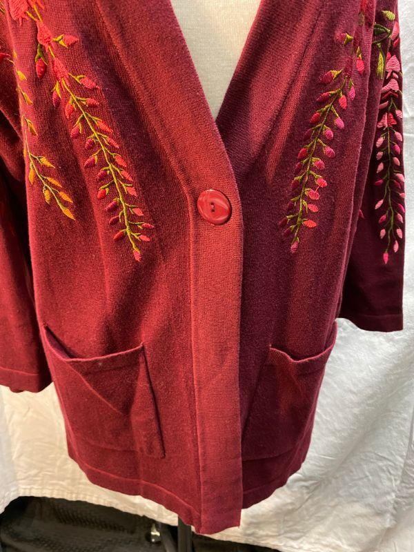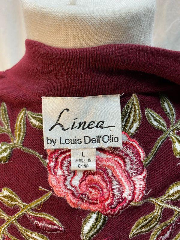 Linea by Louis Dell'Olio embroidered cardigan sweater. Dark brick red color. Front pockets and single button closure. Beautiful floral design embroidered from shoulders down front, sleeves and center of back. Size large. Good Condition.