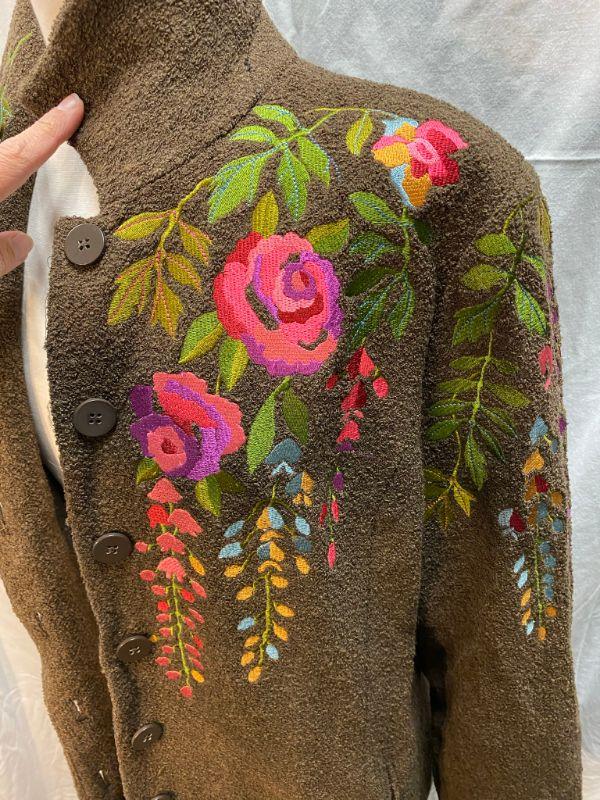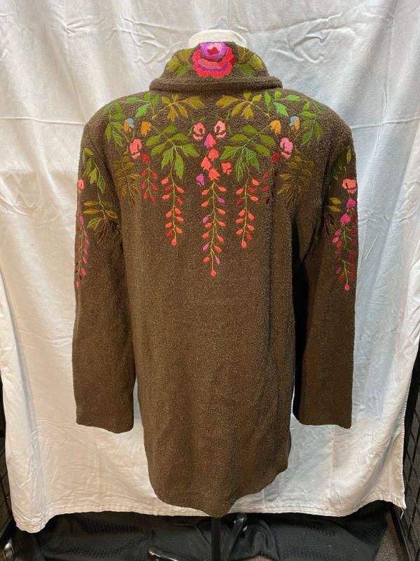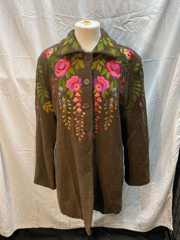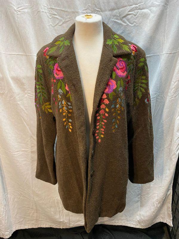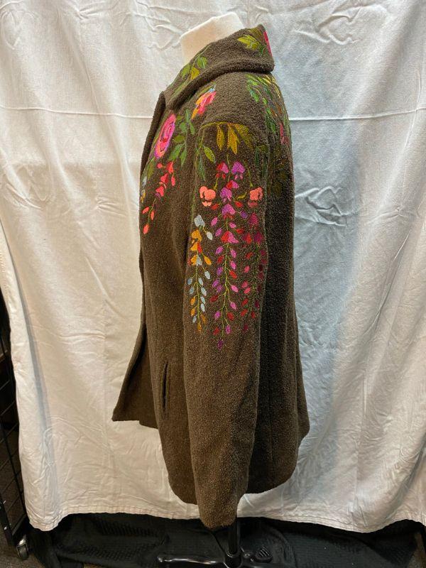 Linea by Louis Dell'Olio wool blend coat. Textured olive green material with a colorful floral design embroidered on to front, sleeves, and back. Button up front. Side pockets. Size Large. Good condition.
