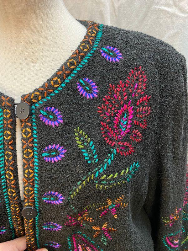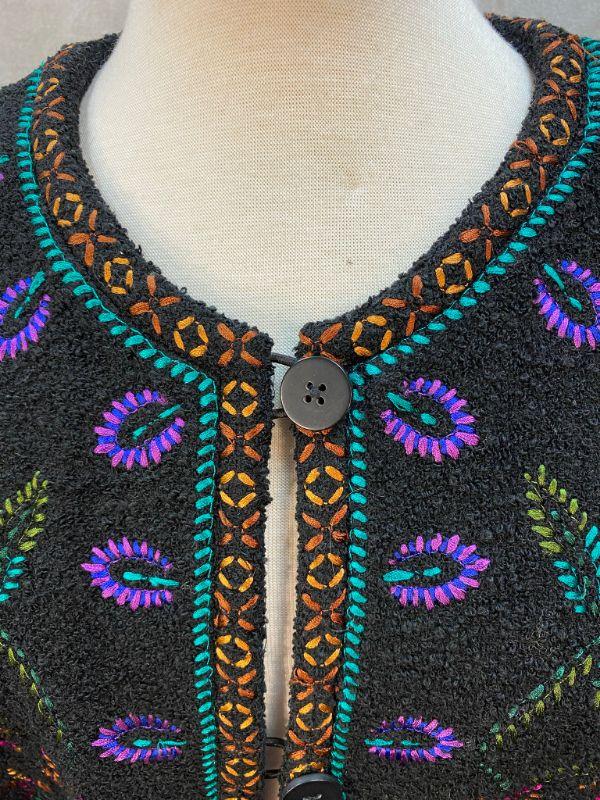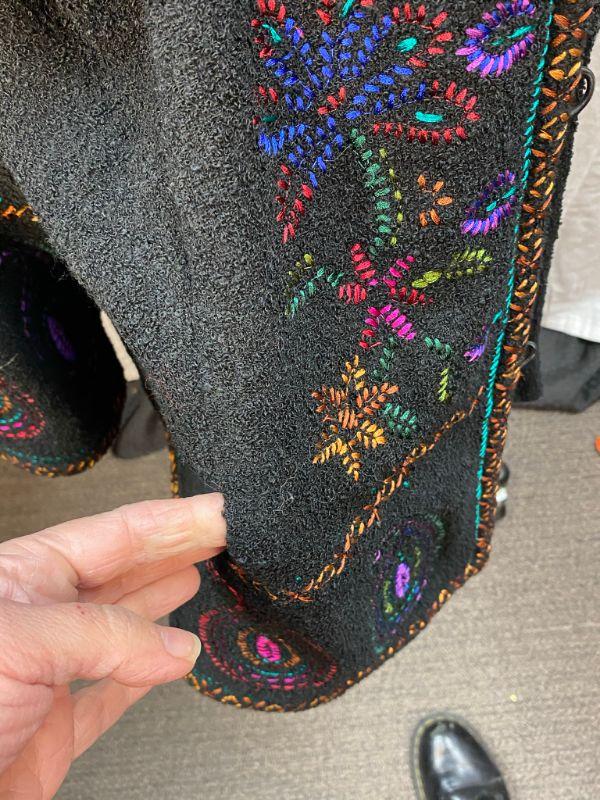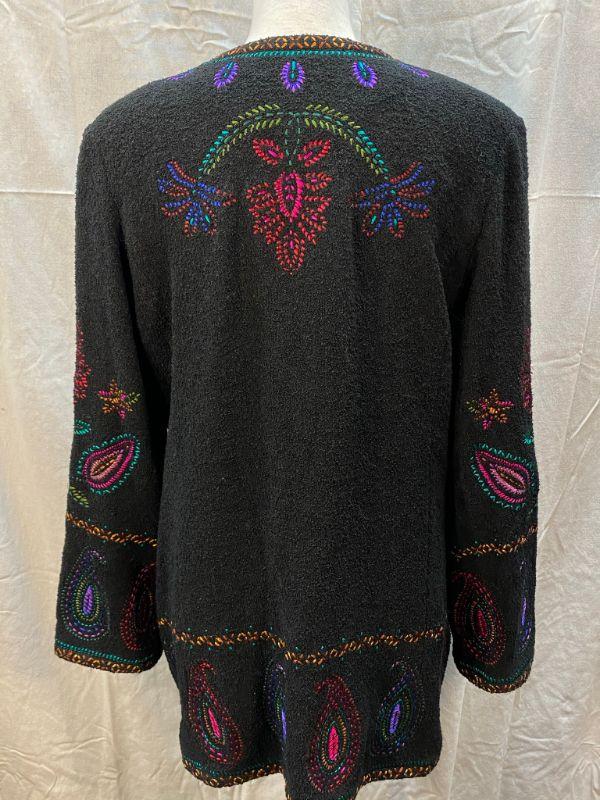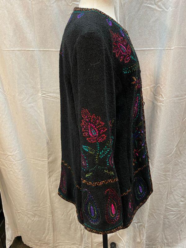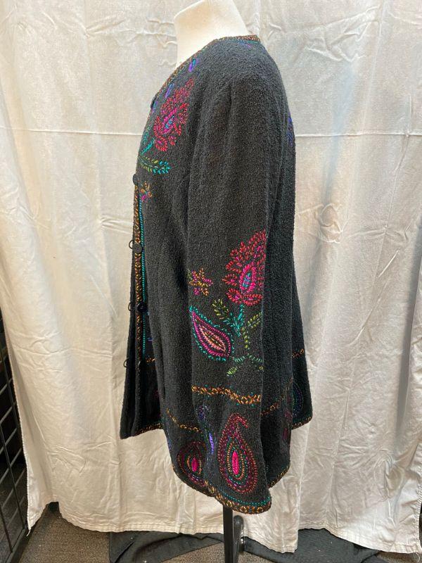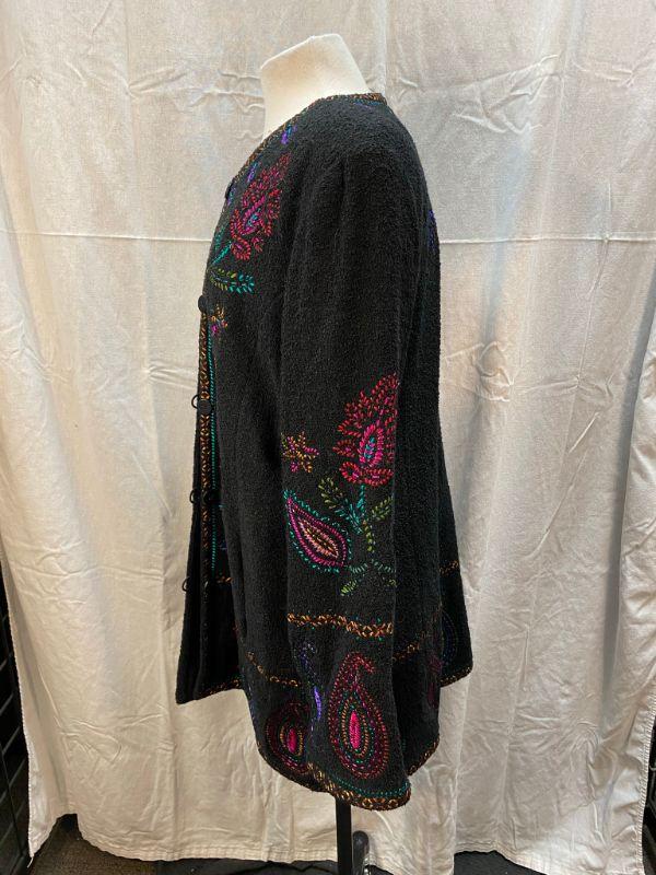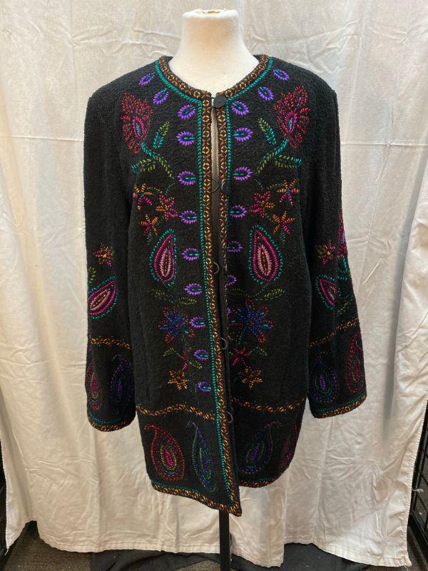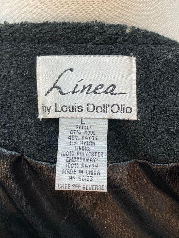 Linea by Louis Dell'Olio black wool blend coat. Button up front. Jewel tone embroidery down the front, around the hem, on the back, and on the sleeves. Above the knee length. Good condition. Has pockets that are partially stitched shut, should be able to open without causing damage. Size L.
