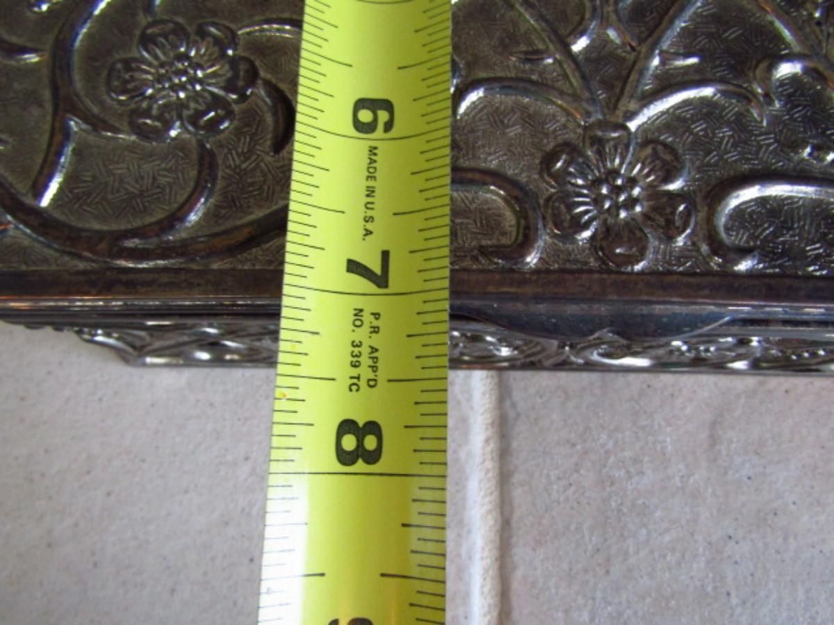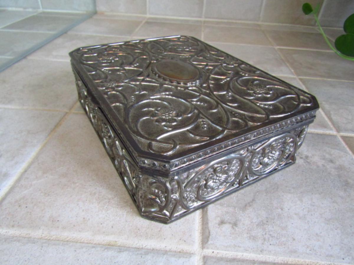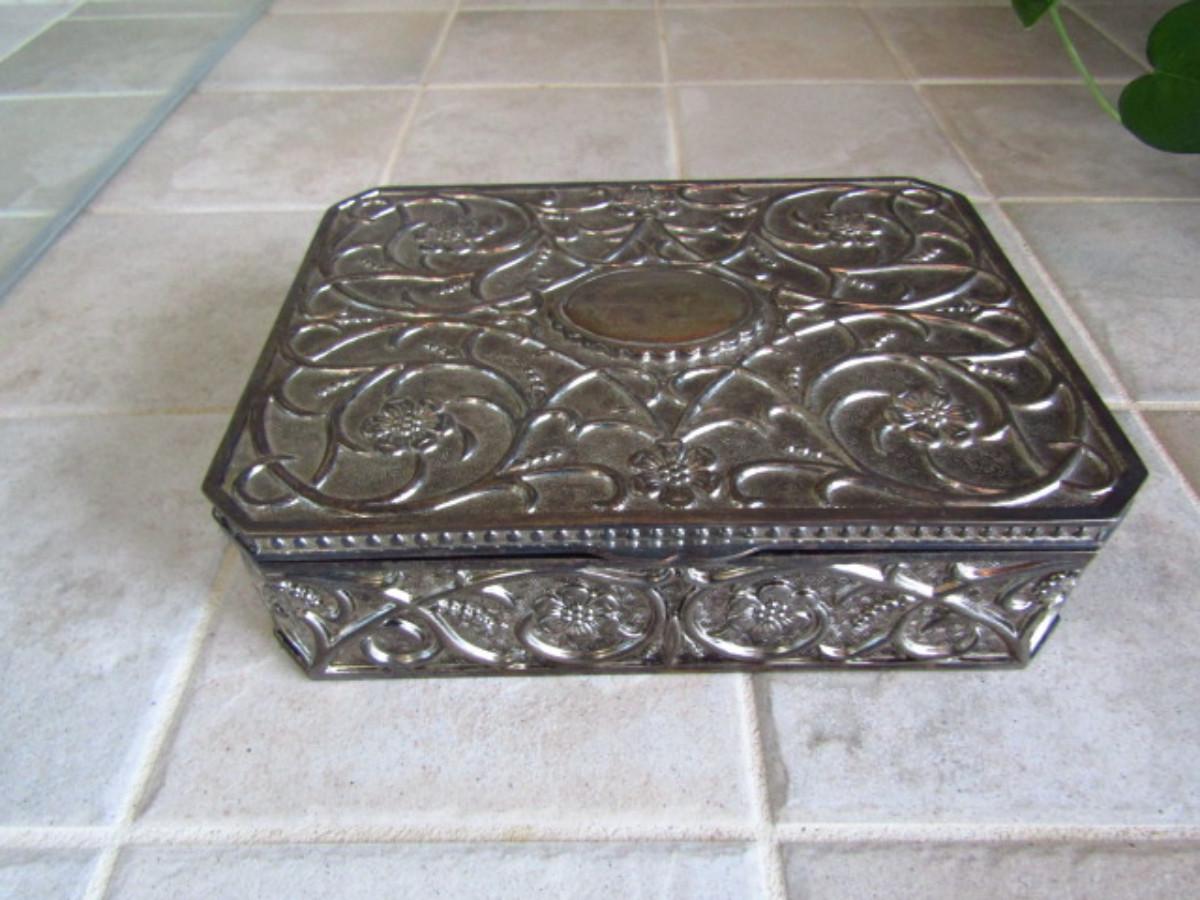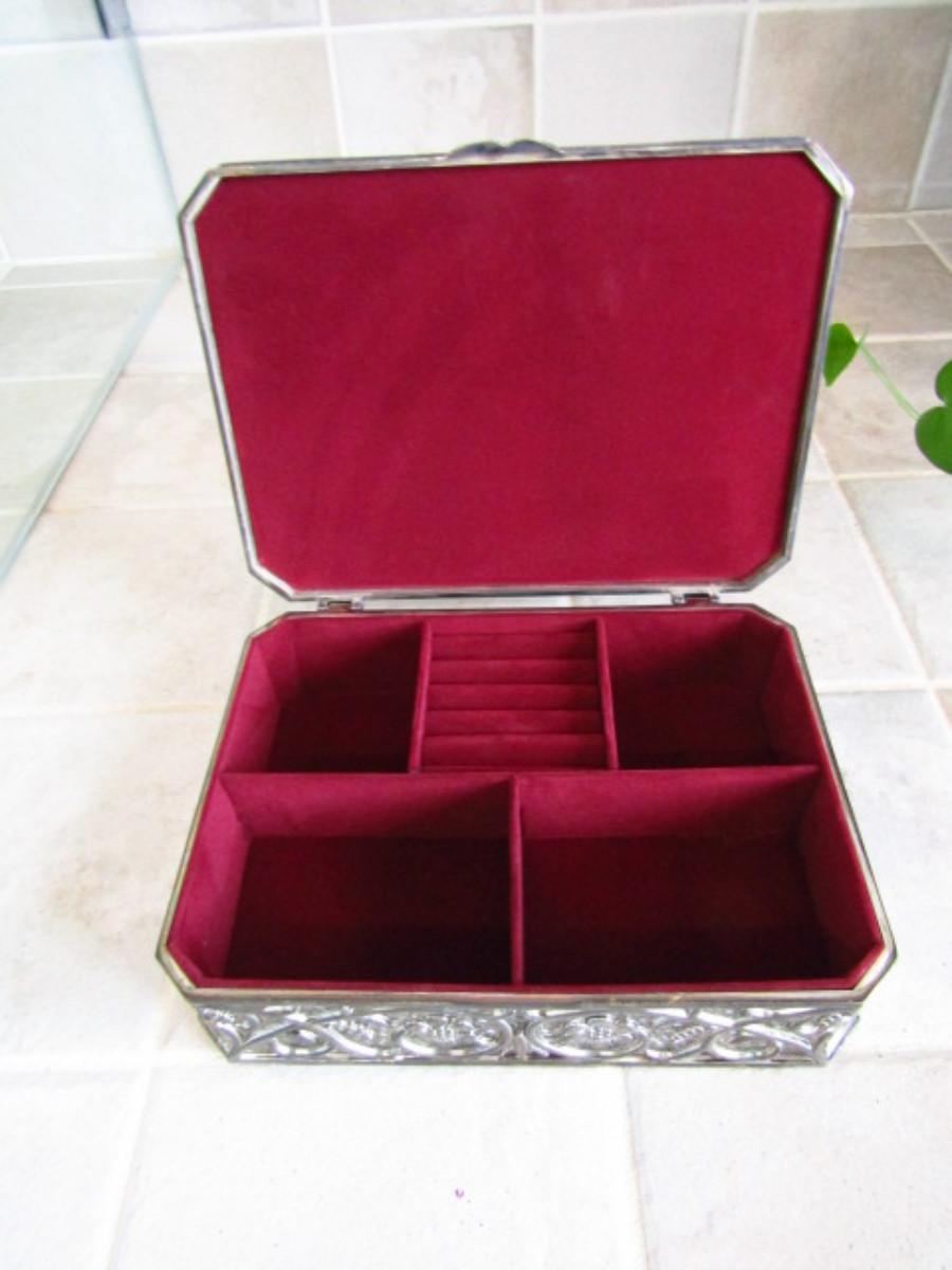 Lined Metal Jewelry Box by Godinger (MBR). Has plate on front for monogramming (unused and blank). Measures approx 9 1/2" x 7" x 2 3/4" tall.