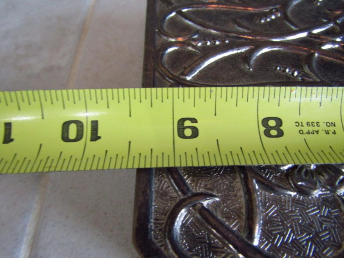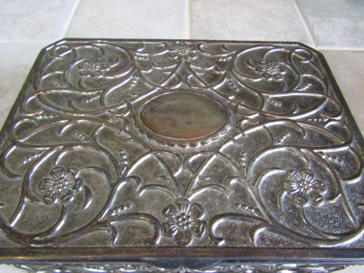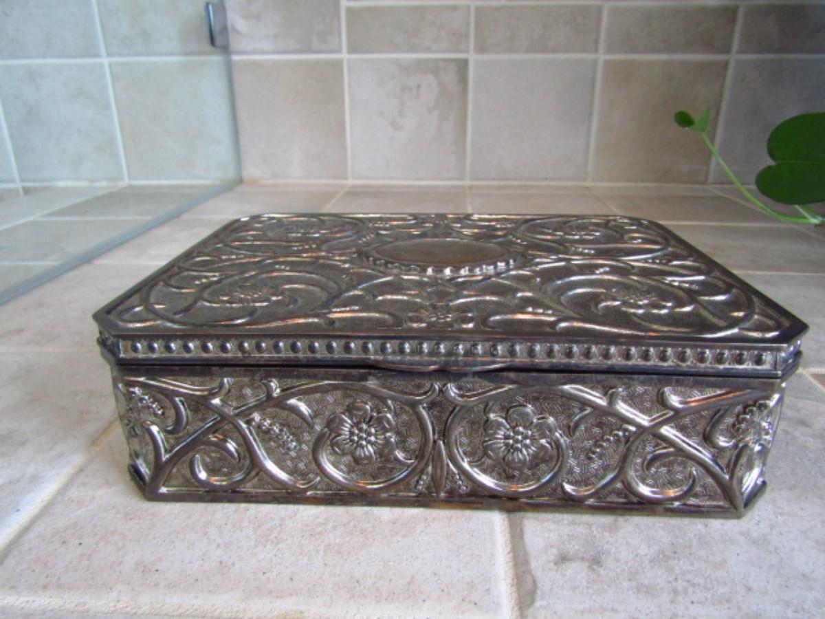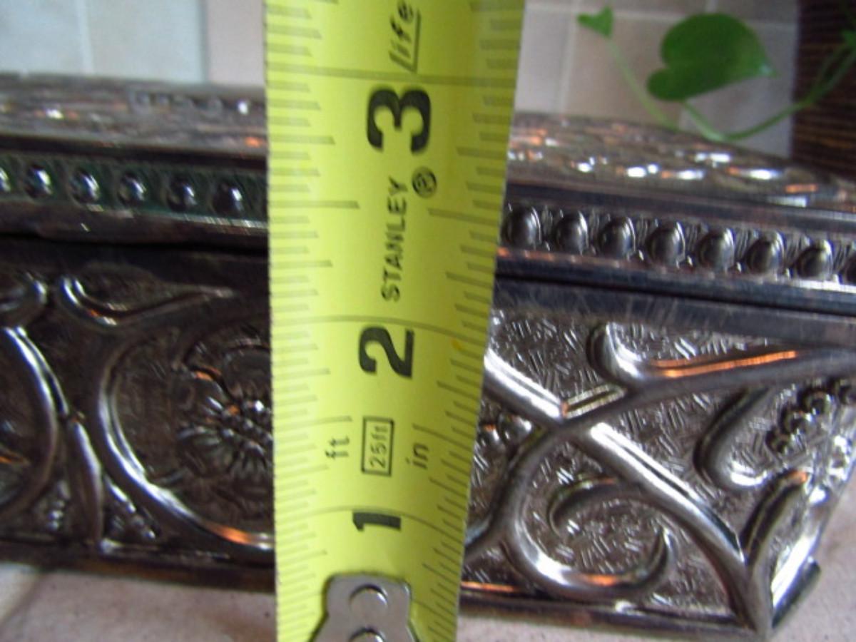 Lined Metal Jewelry Box by Godinger (MBR). Has plate on front for monogramming (unused and blank). Measures approx 9 1/2" x 7" x 2 3/4" tall.