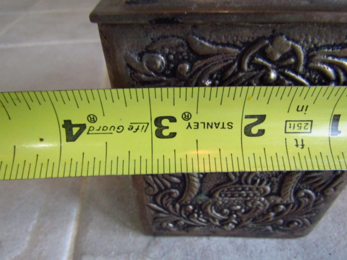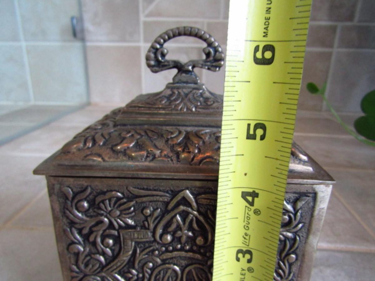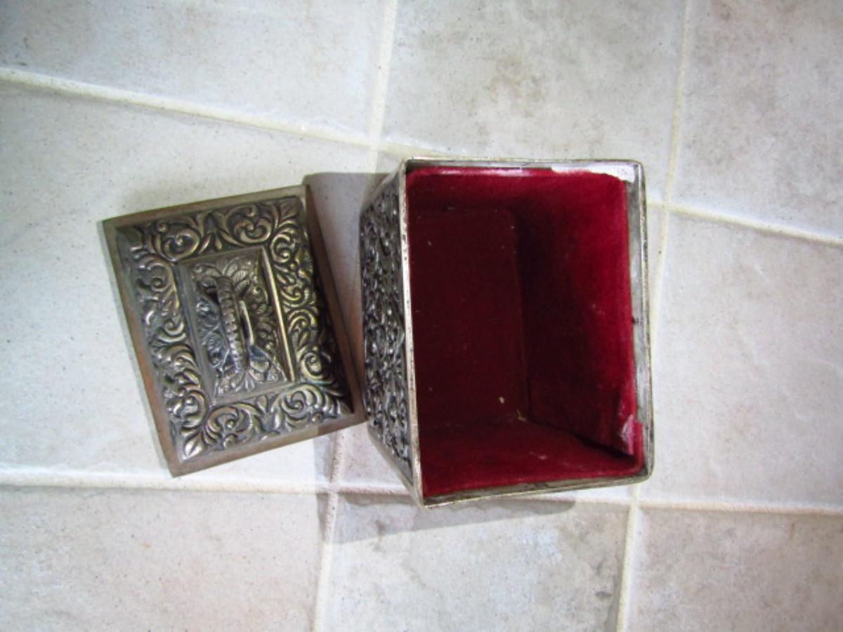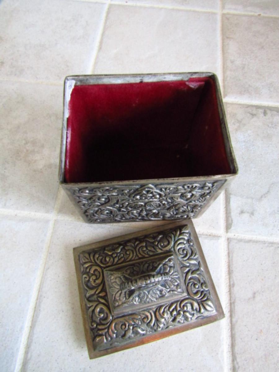 Lined Metal Storage Box (MBR). Measures approx 4 1/2" x 3 1/2" x 6" tall. No maker's mark found.