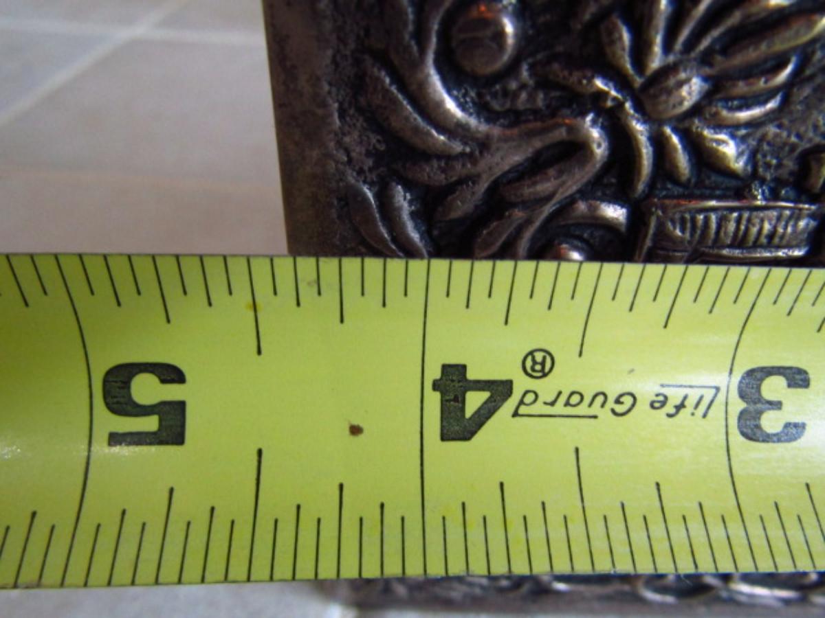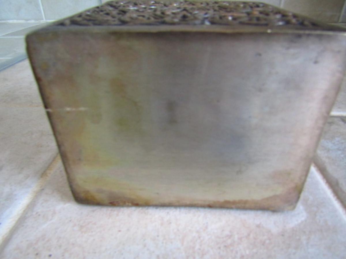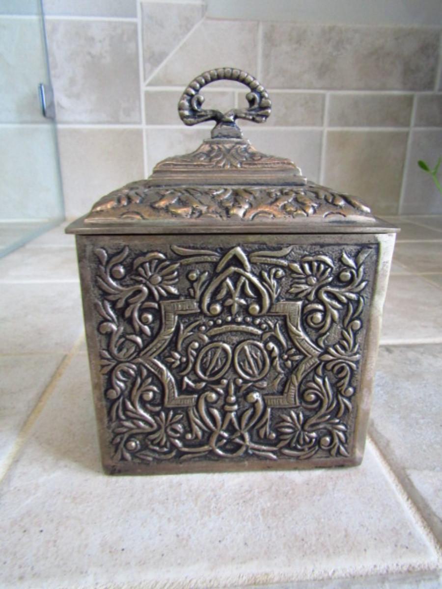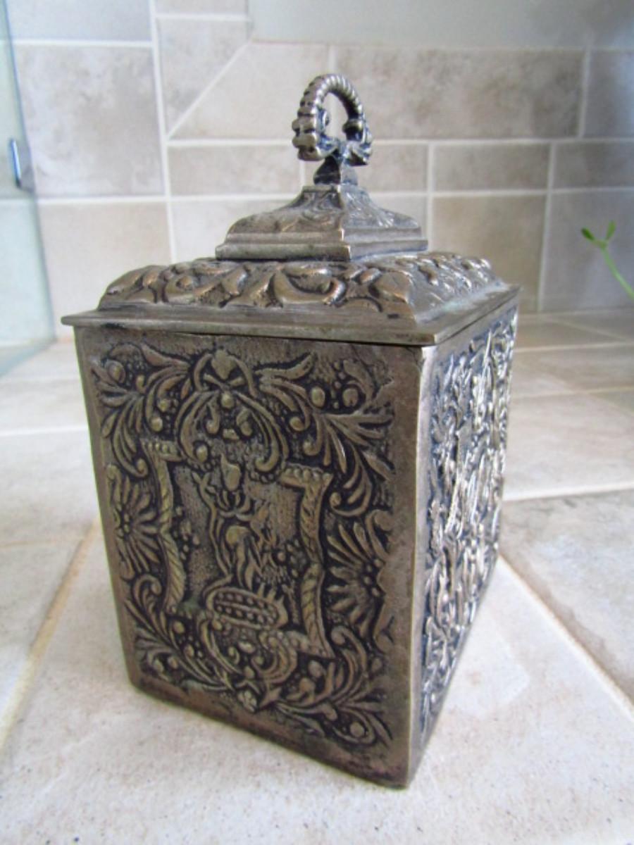 Lined Metal Storage Box (MBR). Measures approx 4 1/2" x 3 1/2" x 6" tall. No maker's mark found.