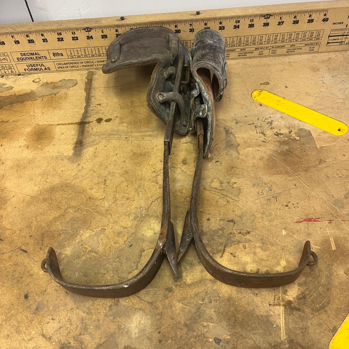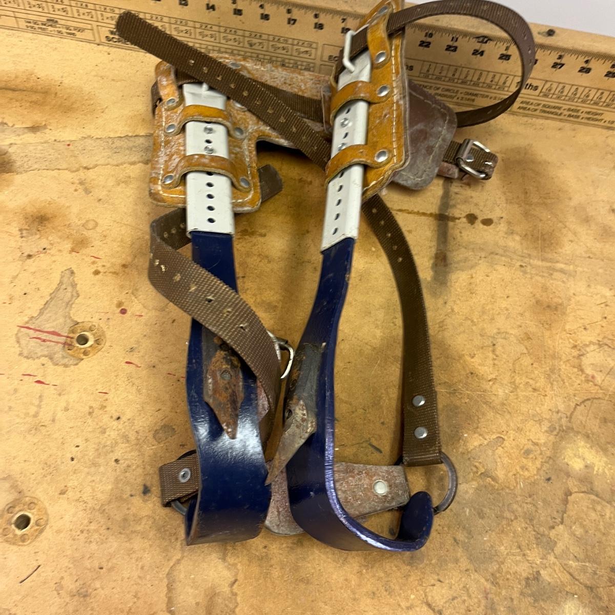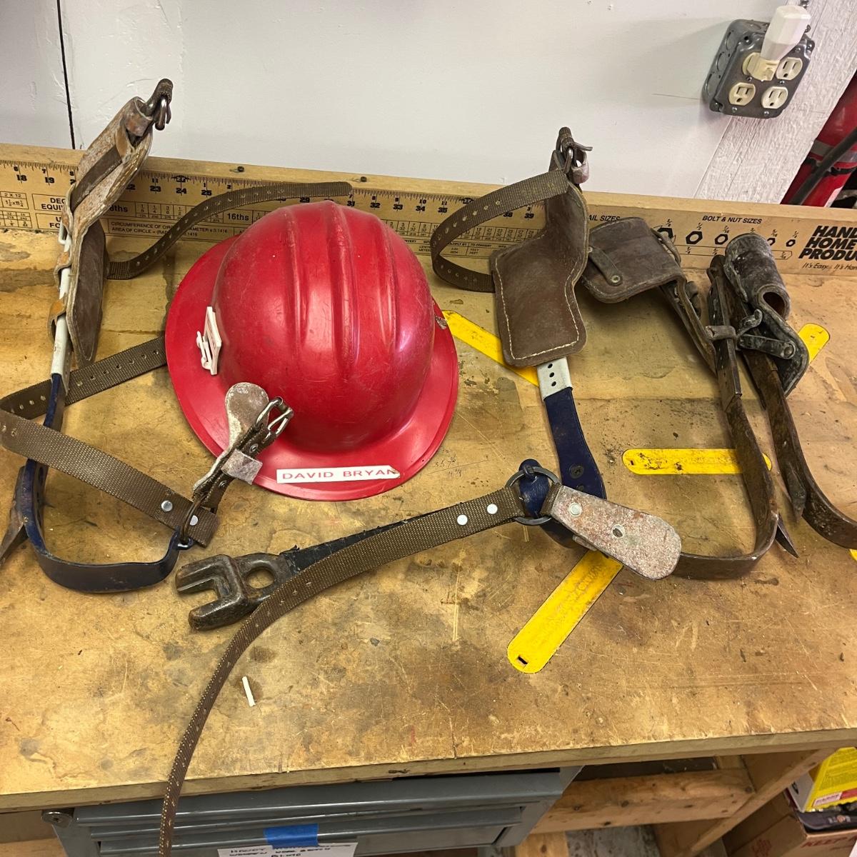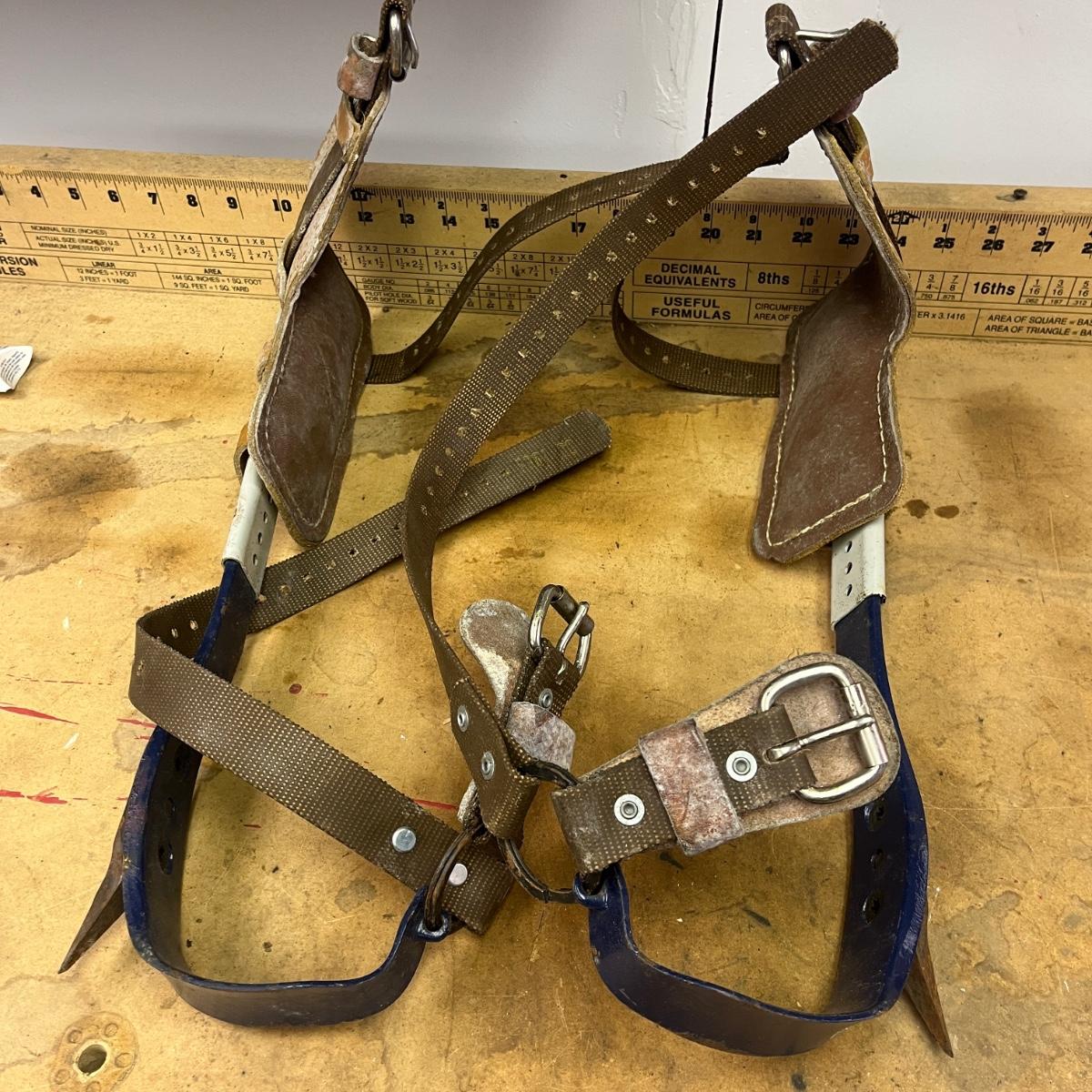 Lot includes two pair of pole-climbing spikes and a hard hat. Longest spikes are 17” long. Some items have mildew, see images.