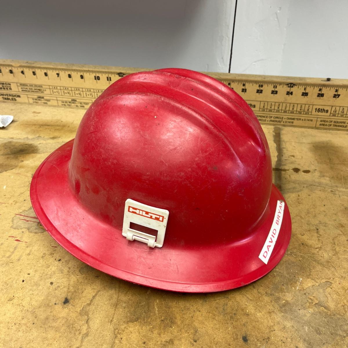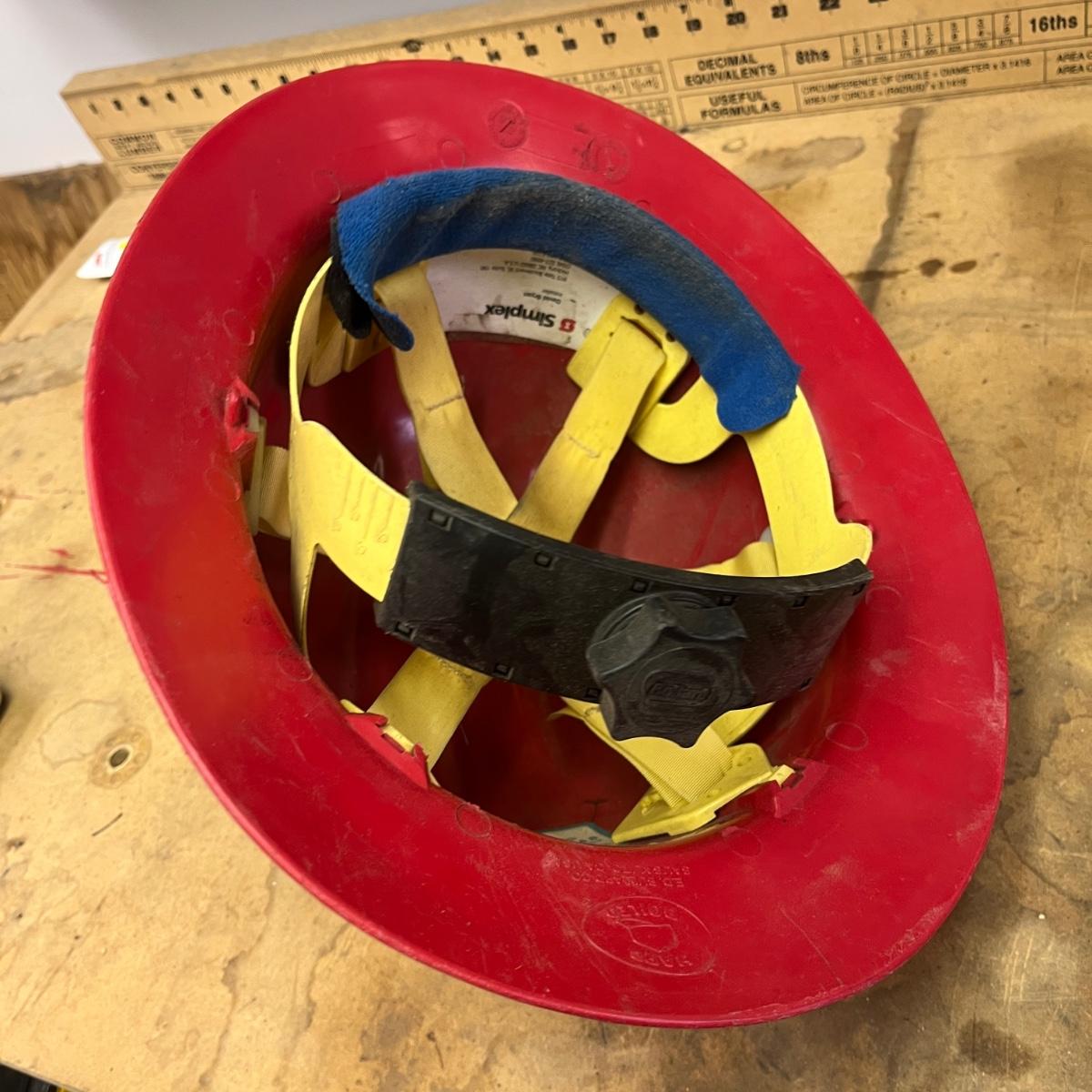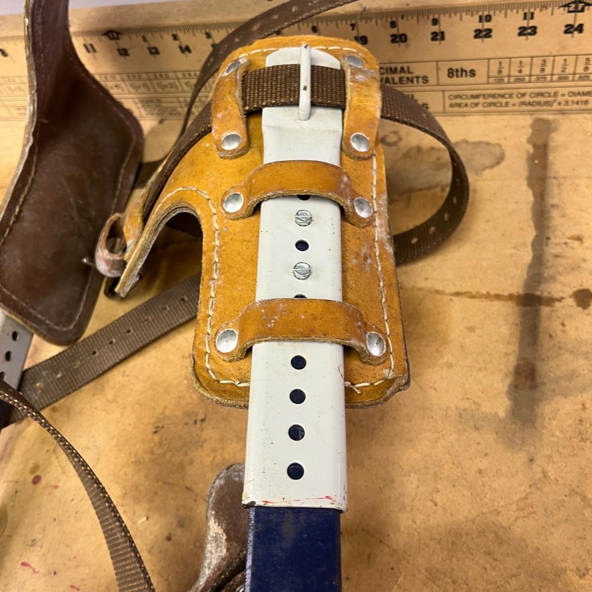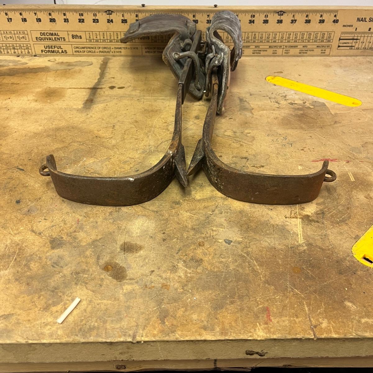 Lot includes two pair of pole-climbing spikes and a hard hat. Longest spikes are 17” long. Some items have mildew, see images.
