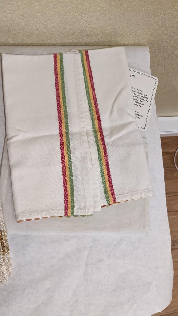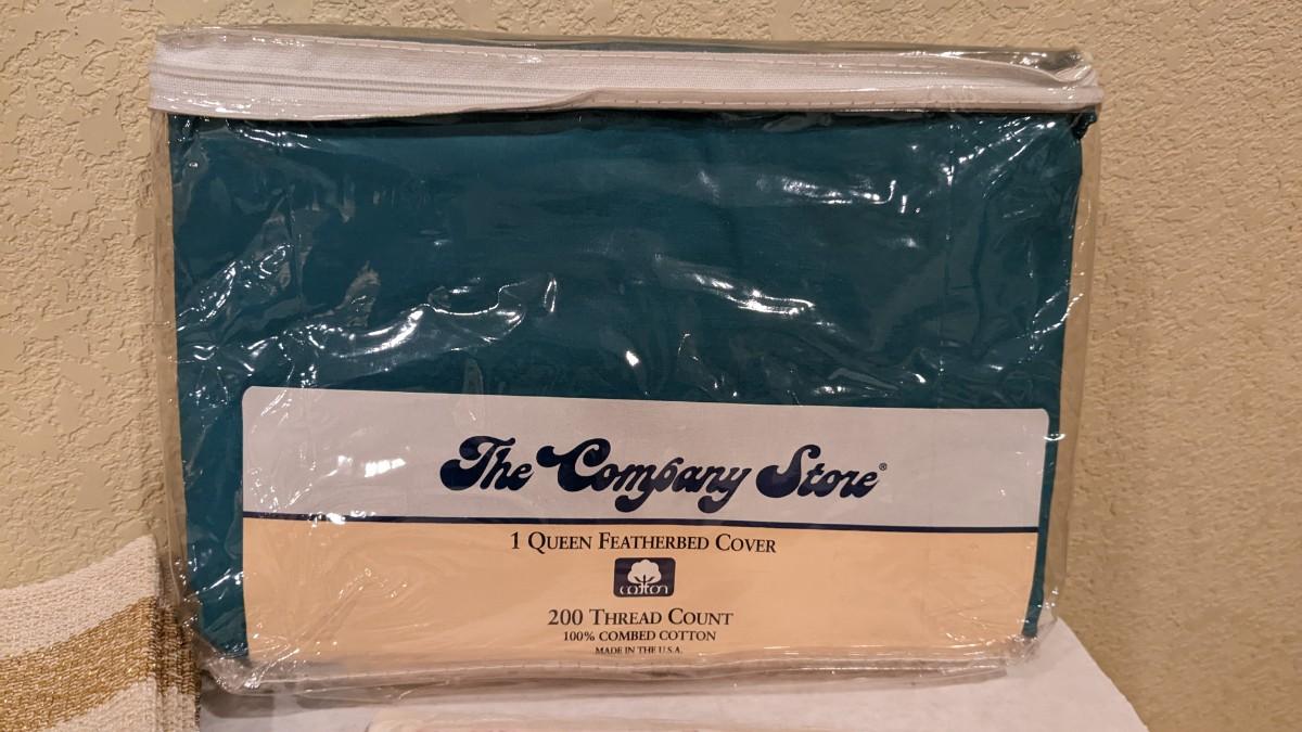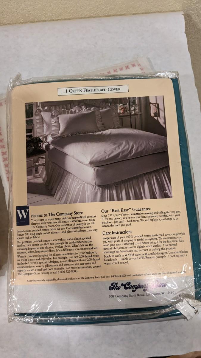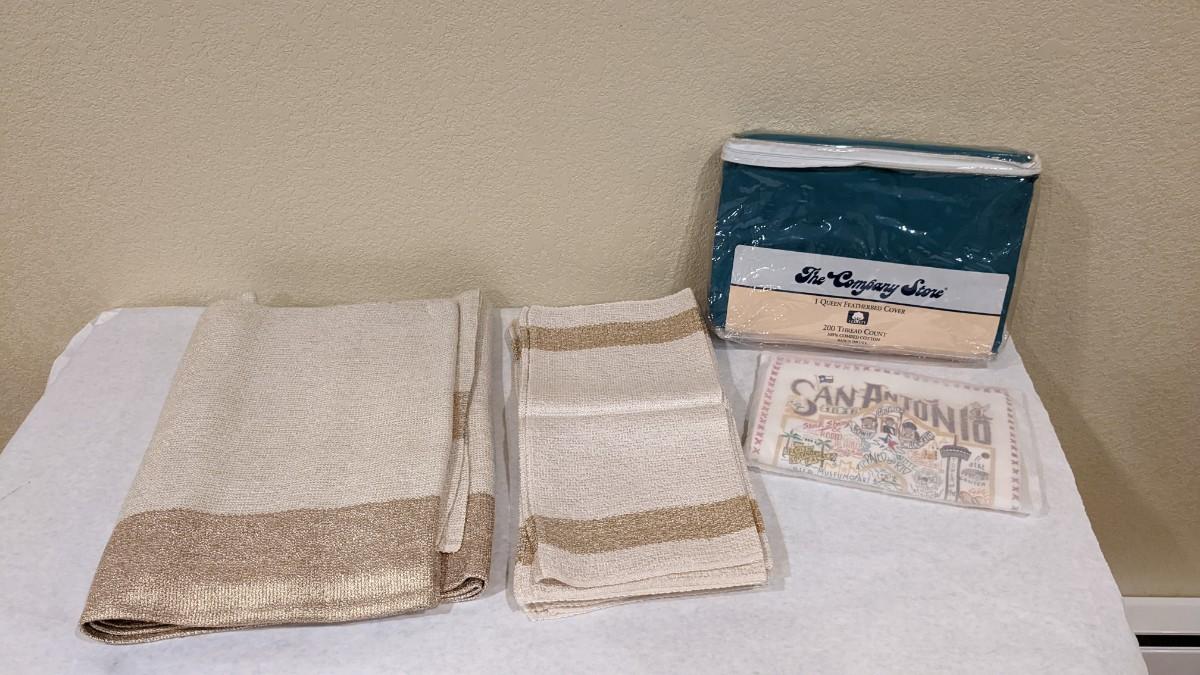 includes new in package queen size feather bed cover, CatStudio San Antonio tea towel, and a gorgeous set of Marshall & Company vintage egyptian cotton and metallic thread 15"x15.75" placemats and 63"x98" table cover. These babies are SOFT with a lovely linen design. SO PRETTY and in great shape for age. No stains, tears, or holes noted. 2 placemats show pull on thread and table cover shows 3 spots of pull, please note in photos.