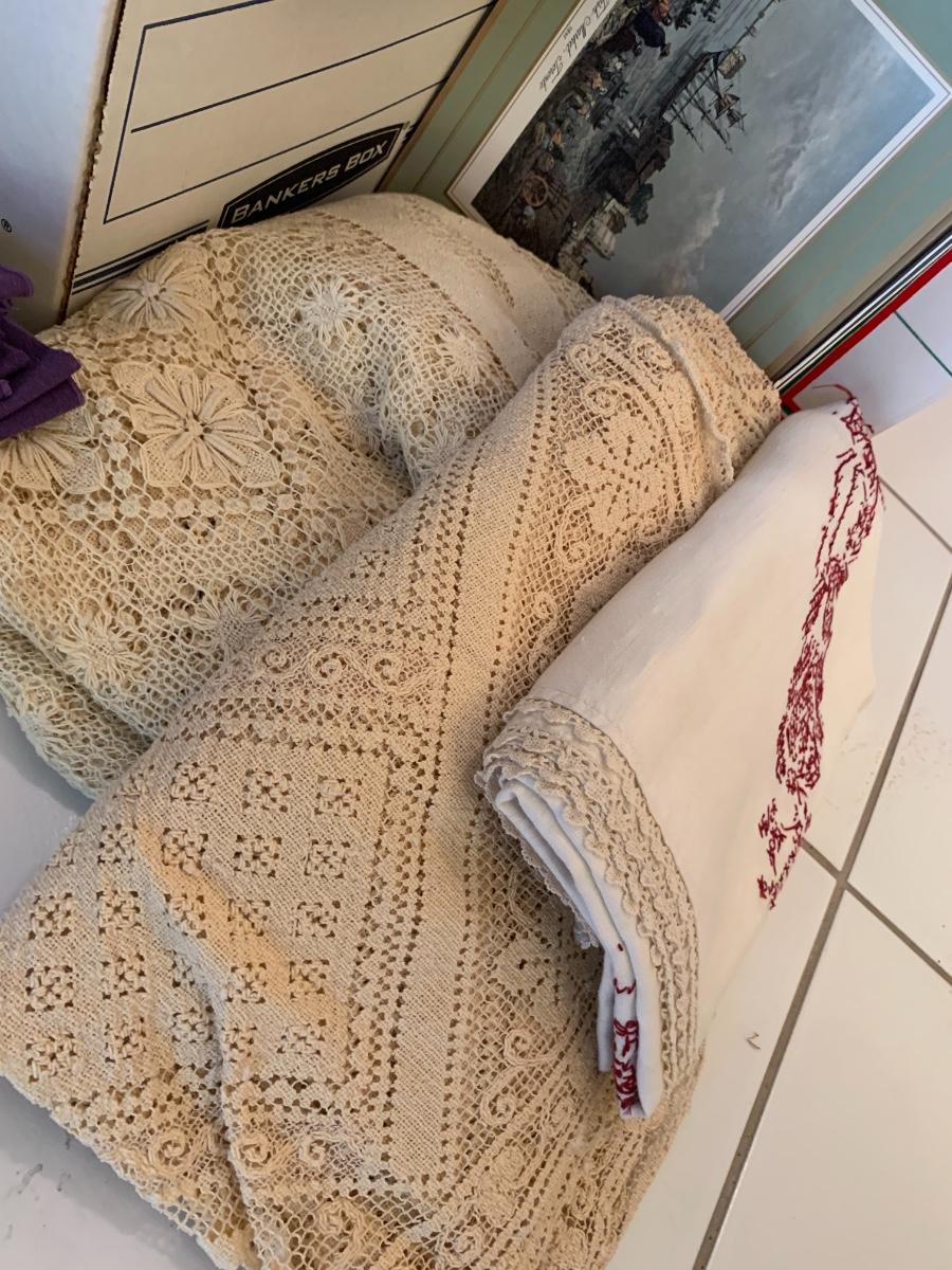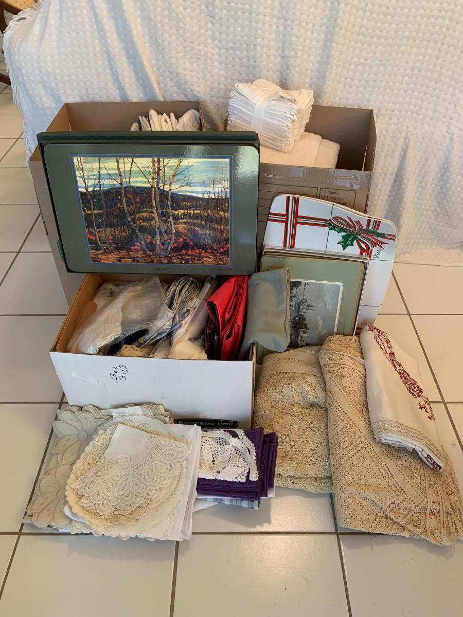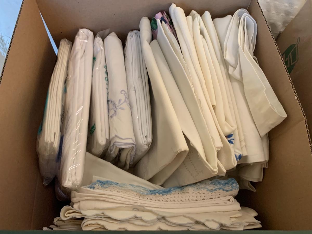 3 boxes of linens- everything from vintage lace tablecloths, to runners and doilies. Also includes pillow cases, some bed linens and bathroom towels.