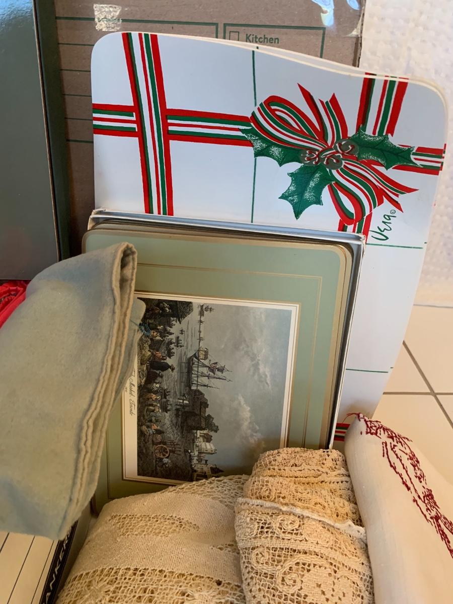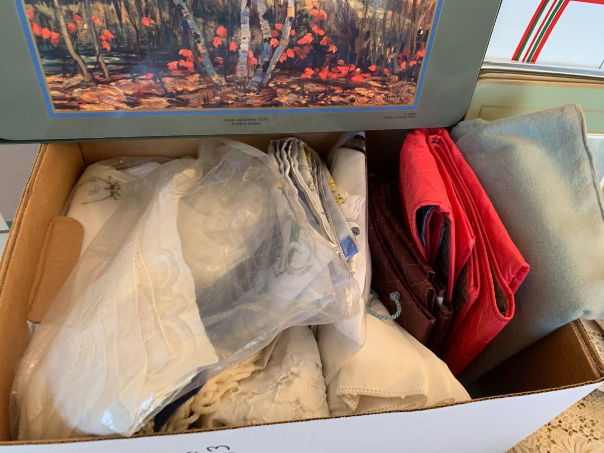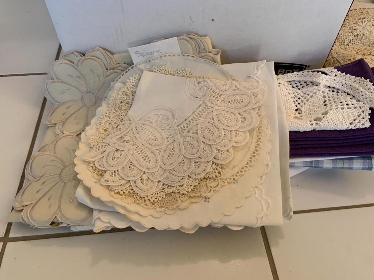 3 boxes of linens- everything from vintage lace tablecloths, to runners and doilies. Also includes pillow cases, some bed linens and bathroom towels.