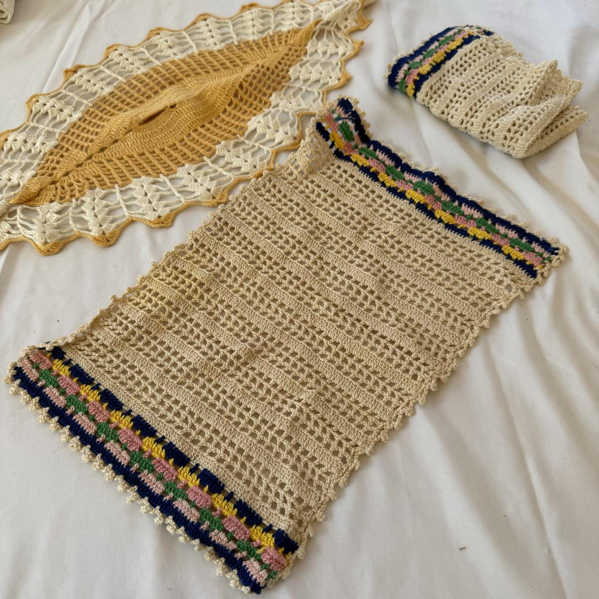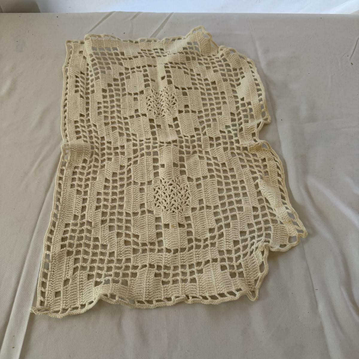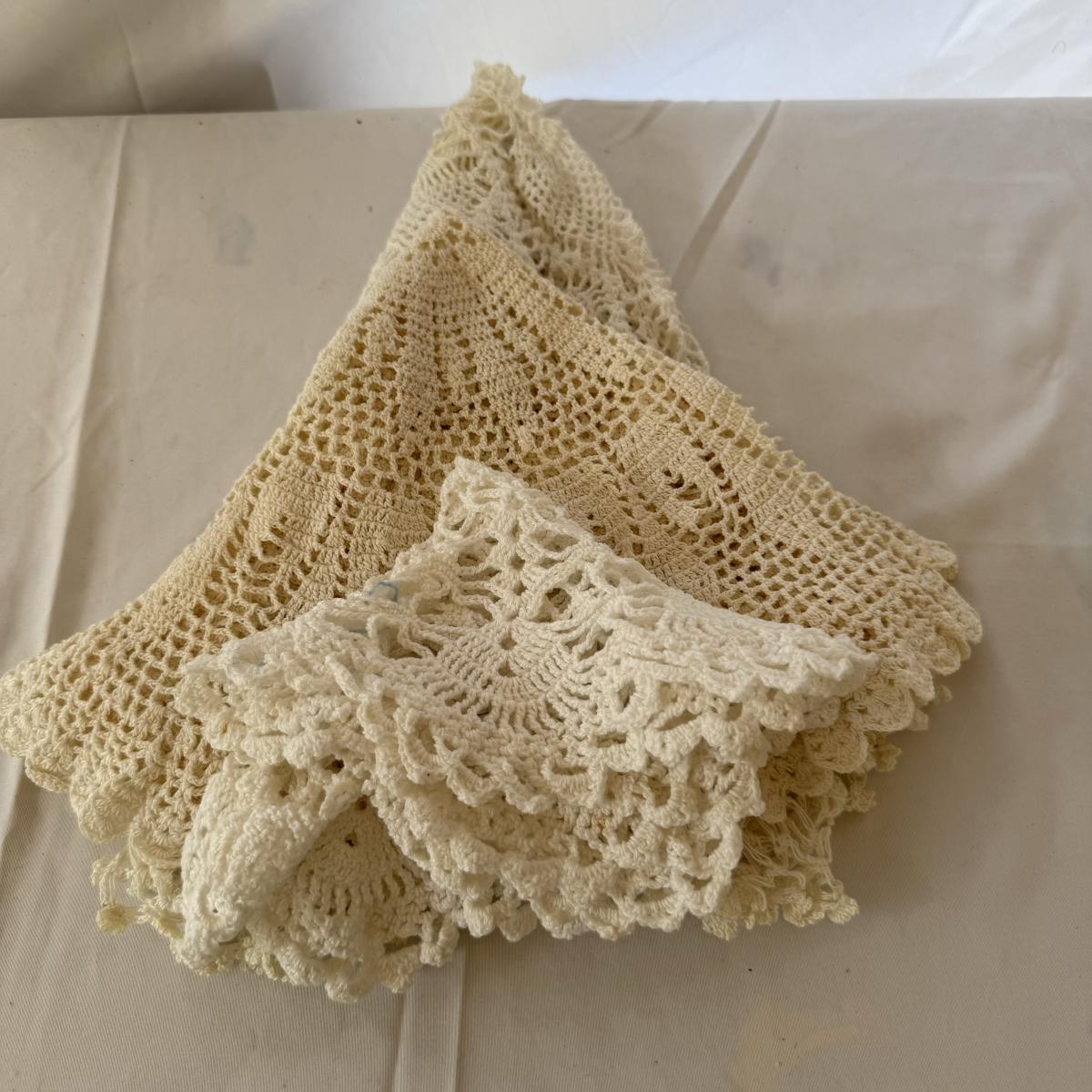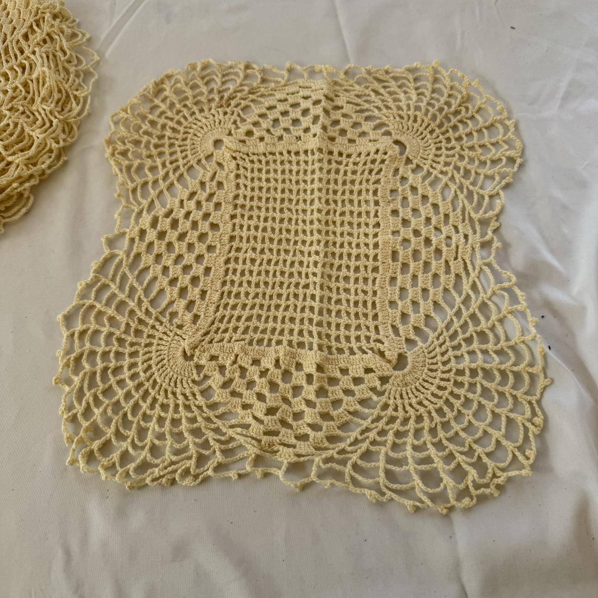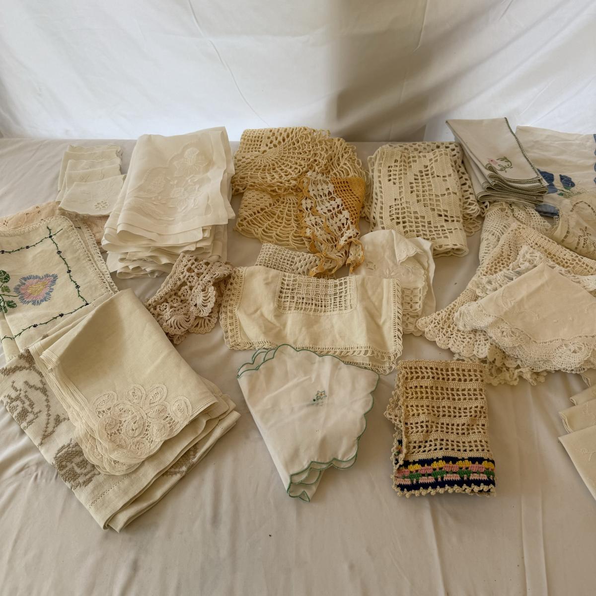 A large assortment of what appears to be hand crocheted doilies and beautiful linen coasters and napkins. The pink blue and yellow rectangular doily in the photograph measures 7.5” X 11”. The oval, orange and cream doily measures 16” X 7.5”. Eleven matching linen white napkins measure 11.5 X 17.5” each. The cross stitched linen table runner measures 41” X 14”. See photographs for entire inventory of lot.