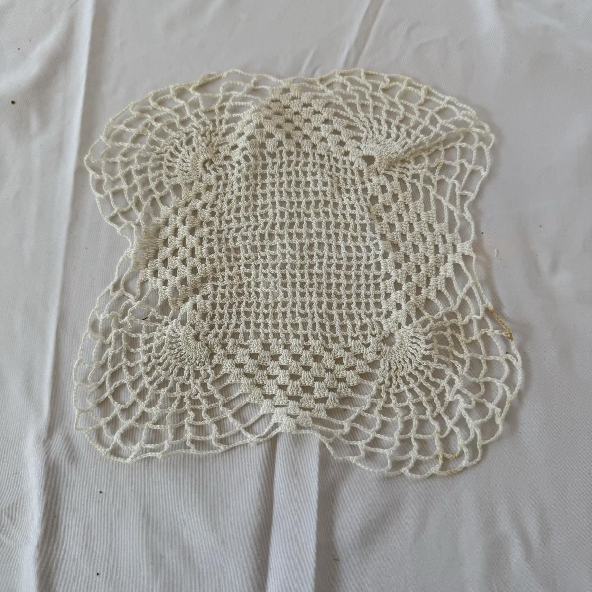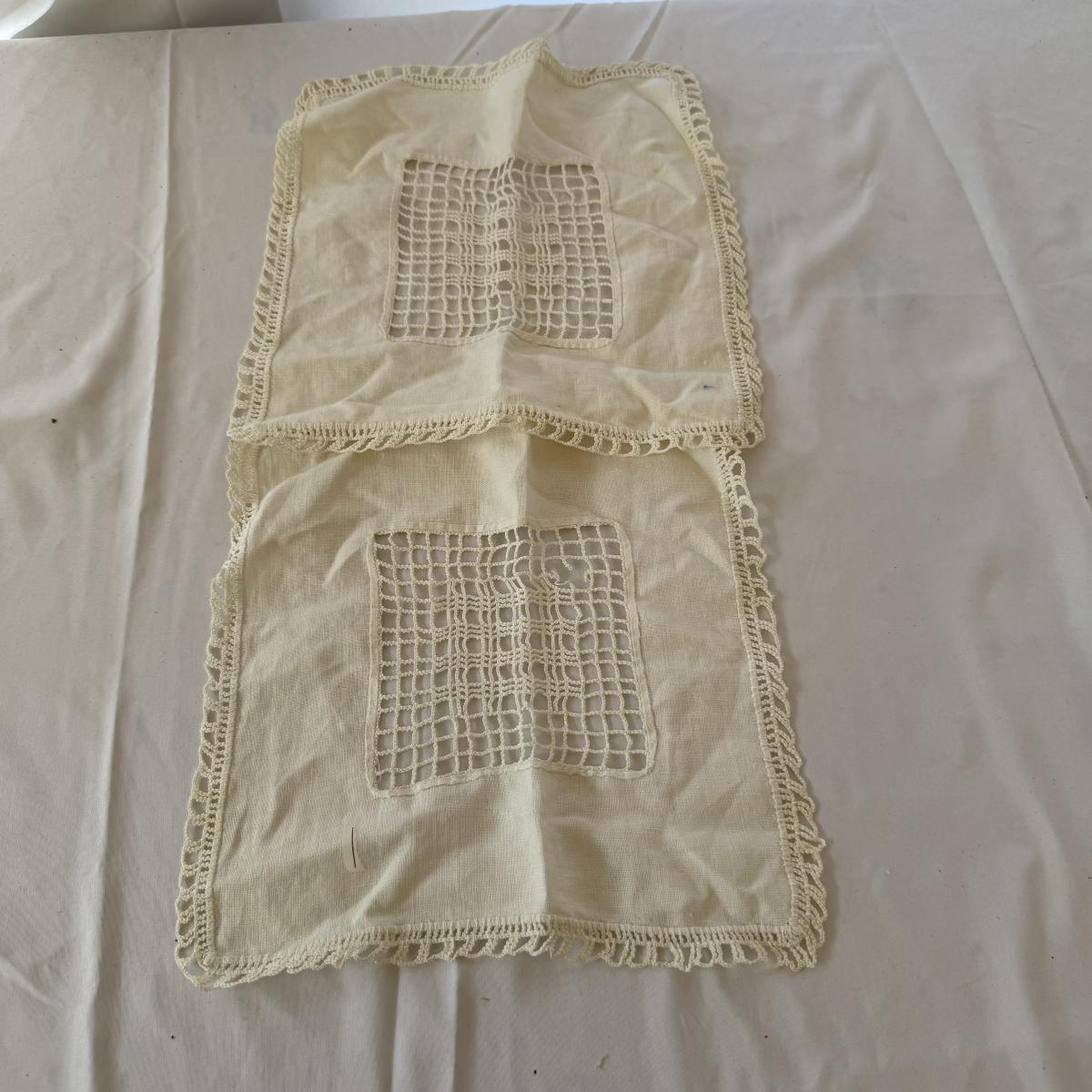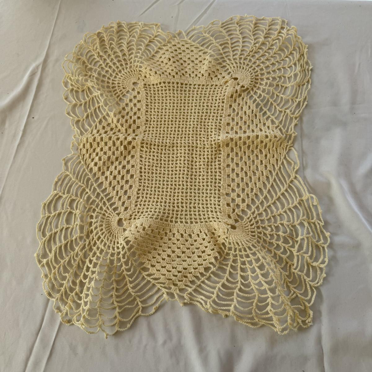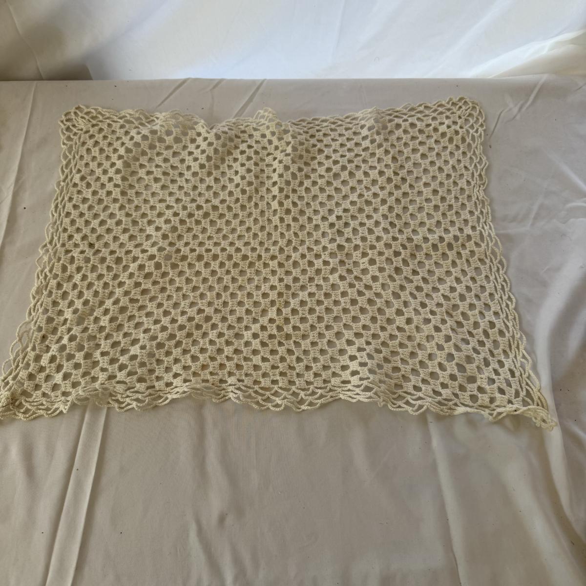 A large assortment of what appears to be hand crocheted doilies and beautiful linen coasters and napkins. The pink blue and yellow rectangular doily in the photograph measures 7.5” X 11”. The oval, orange and cream doily measures 16” X 7.5”. Eleven matching linen white napkins measure 11.5 X 17.5” each. The cross stitched linen table runner measures 41” X 14”. See photographs for entire inventory of lot.