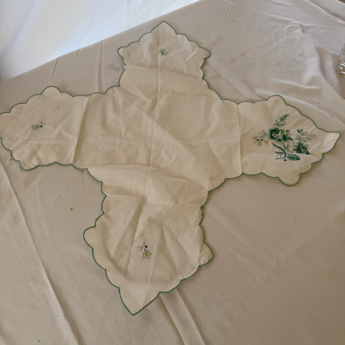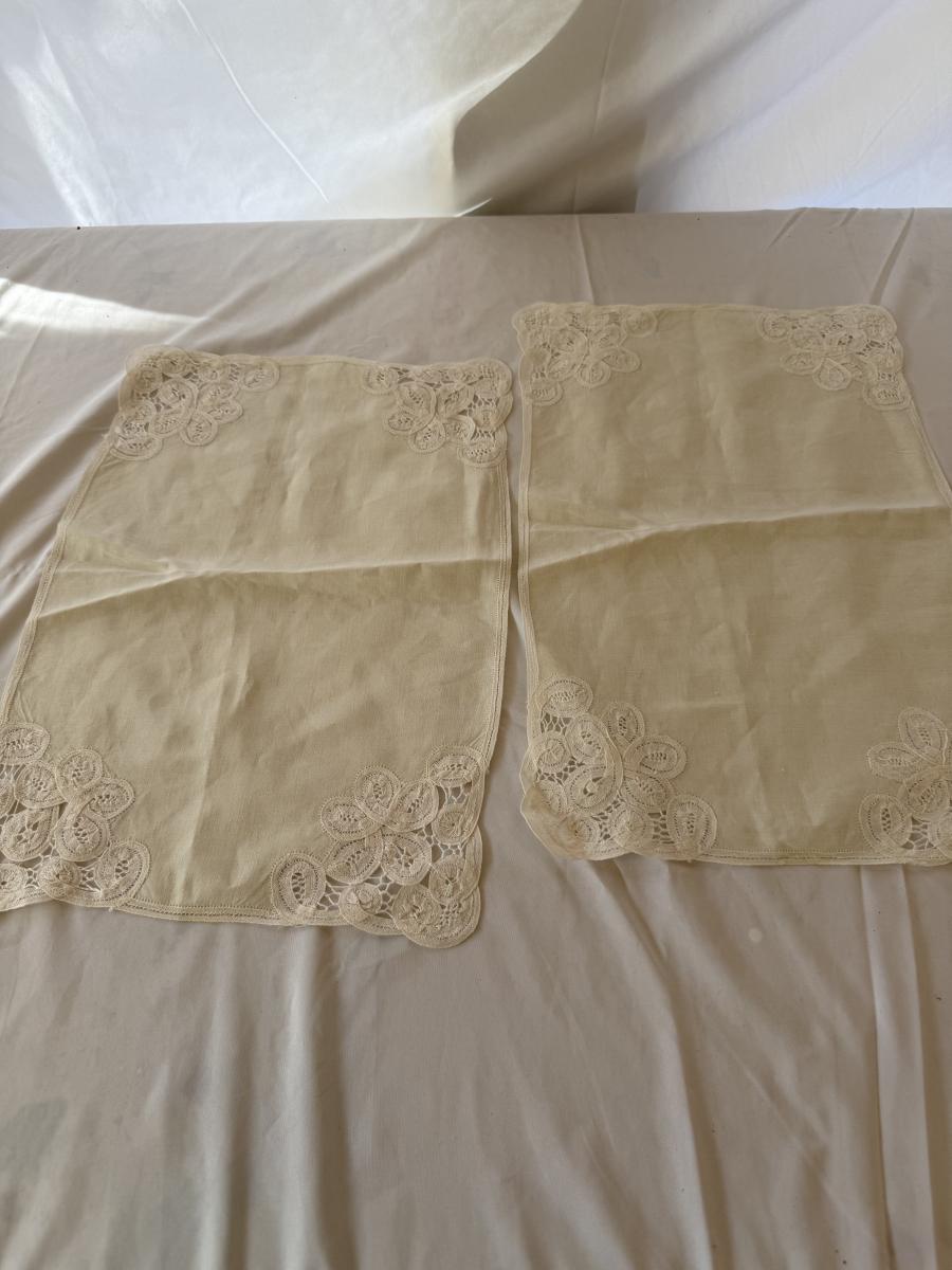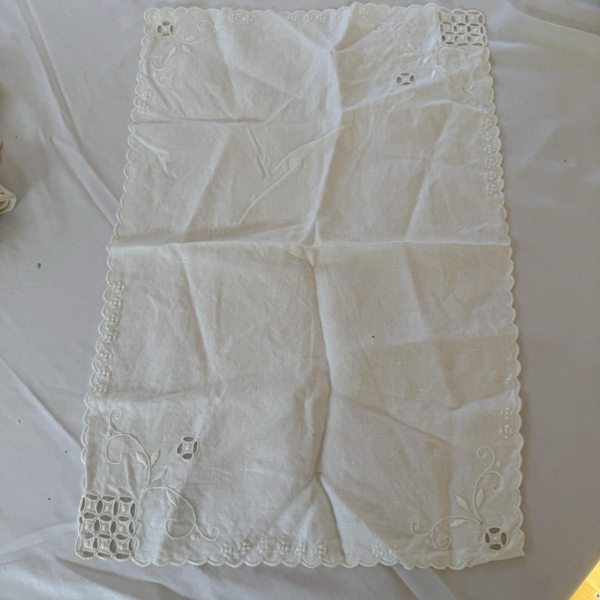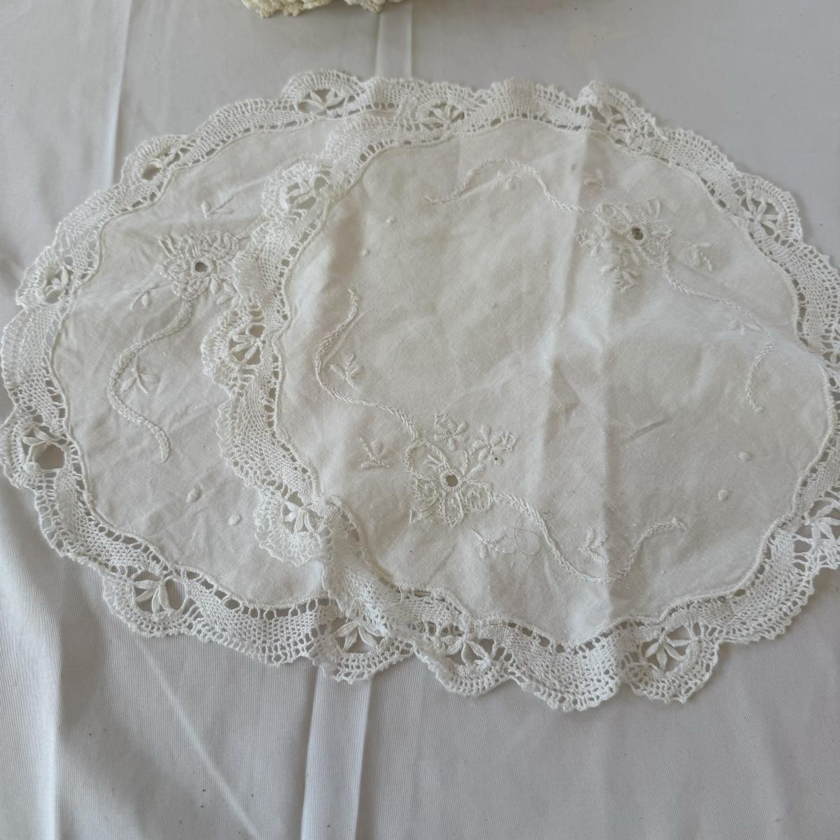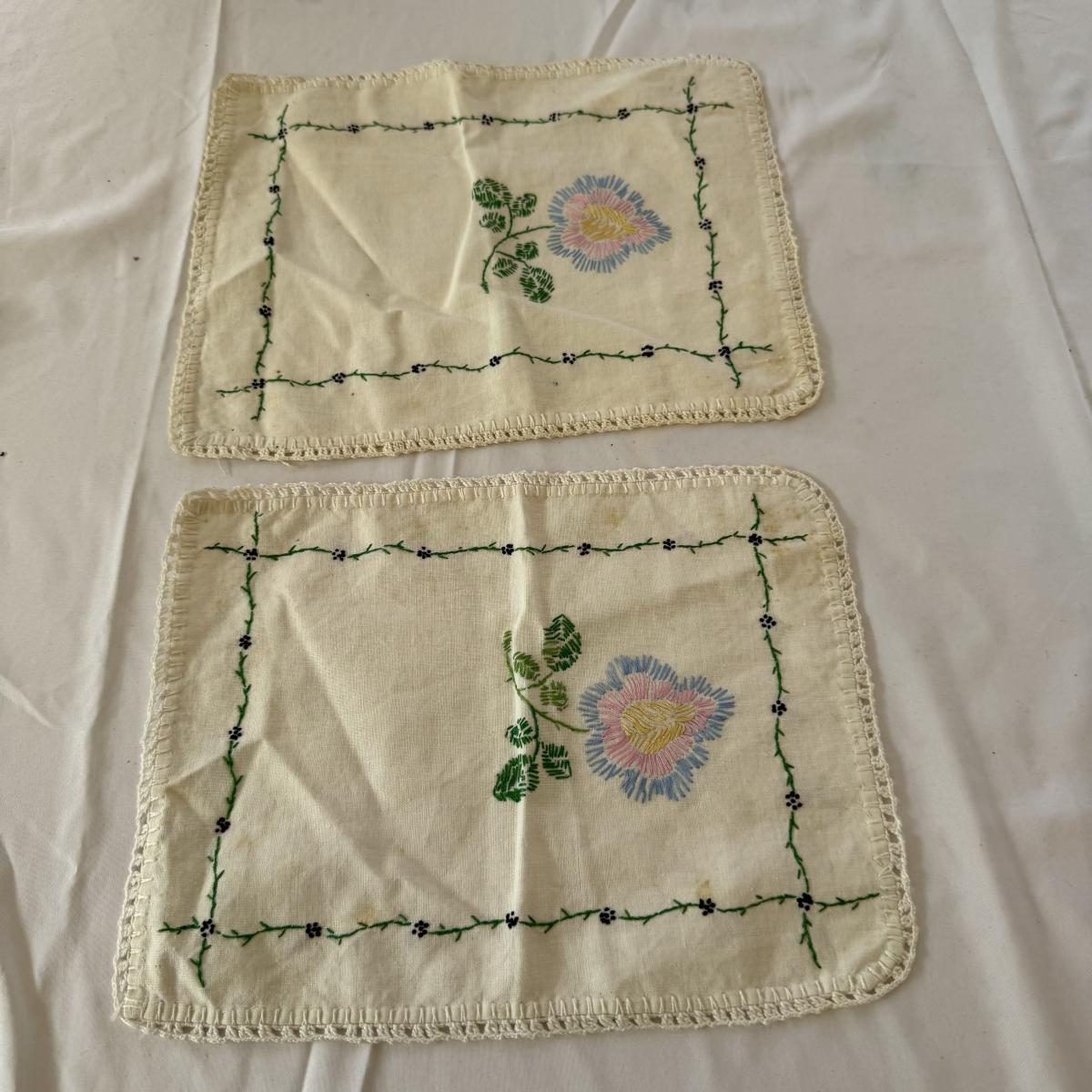 A large assortment of what appears to be hand crocheted doilies and beautiful linen coasters and napkins. The pink blue and yellow rectangular doily in the photograph measures 7.5” X 11”. The oval, orange and cream doily measures 16” X 7.5”. Eleven matching linen white napkins measure 11.5 X 17.5” each. The cross stitched linen table runner measures 41” X 14”. See photographs for entire inventory of lot.