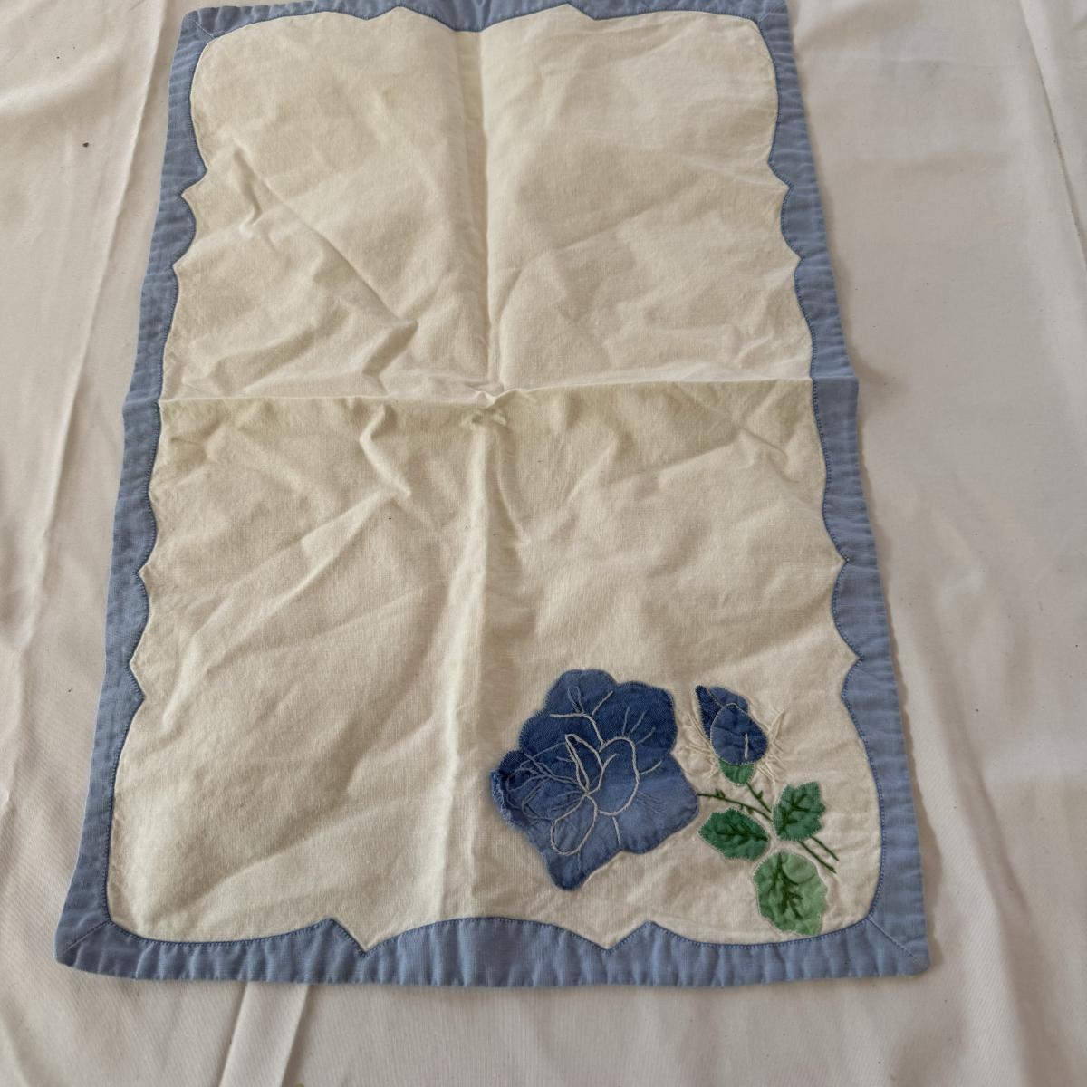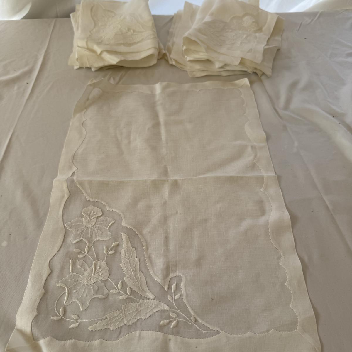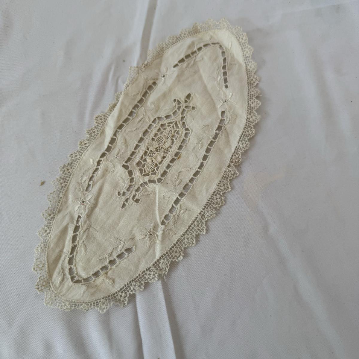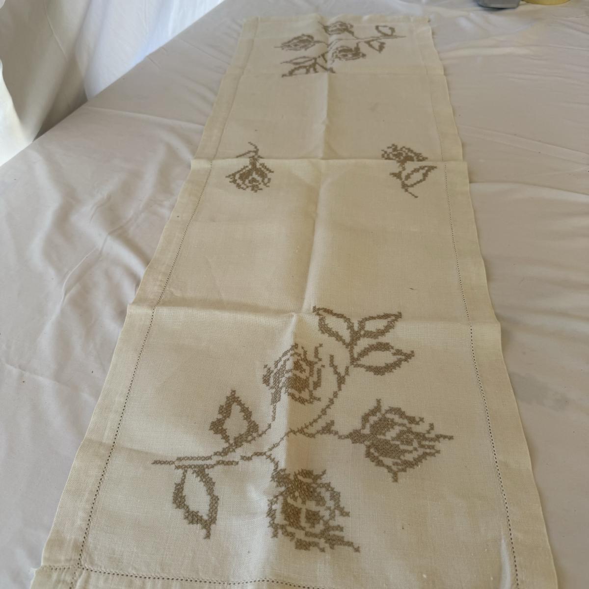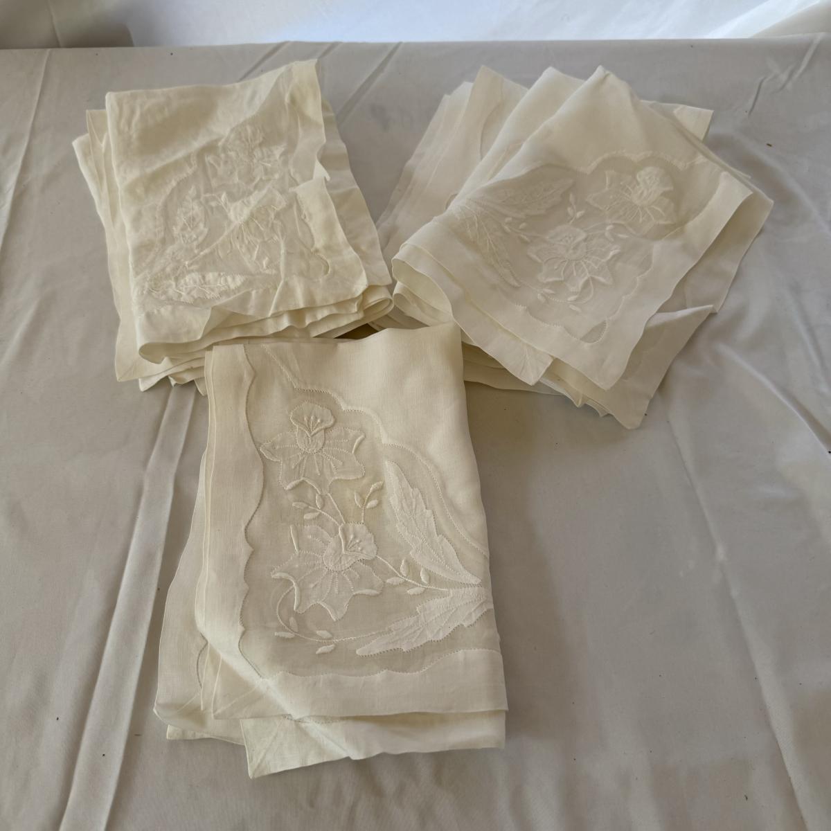 A large assortment of what appears to be hand crocheted doilies and beautiful linen coasters and napkins. The pink blue and yellow rectangular doily in the photograph measures 7.5” X 11”. The oval, orange and cream doily measures 16” X 7.5”. Eleven matching linen white napkins measure 11.5 X 17.5” each. The cross stitched linen table runner measures 41” X 14”. See photographs for entire inventory of lot.