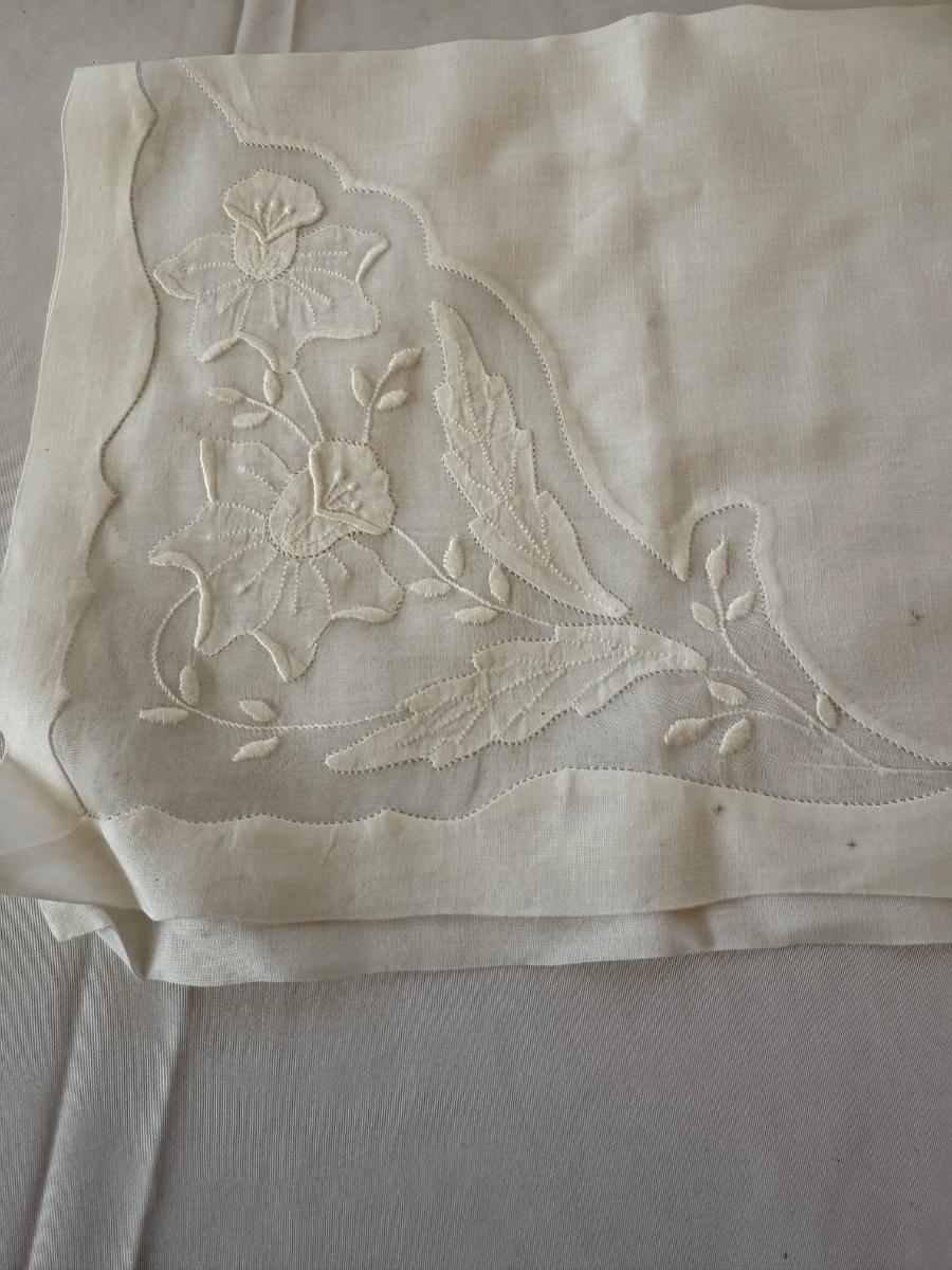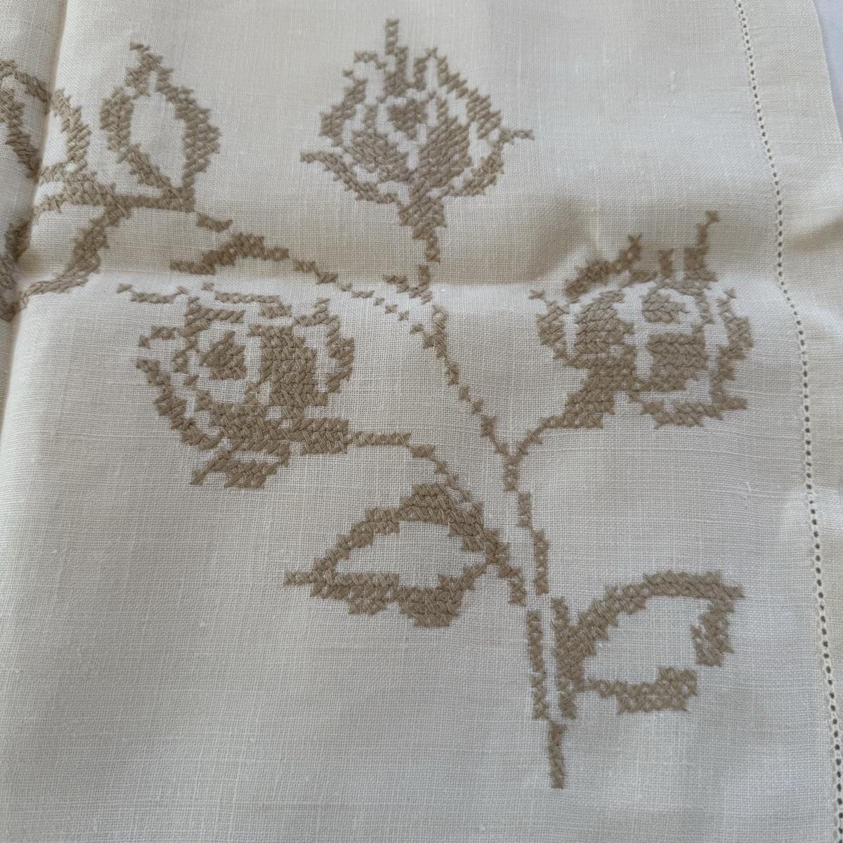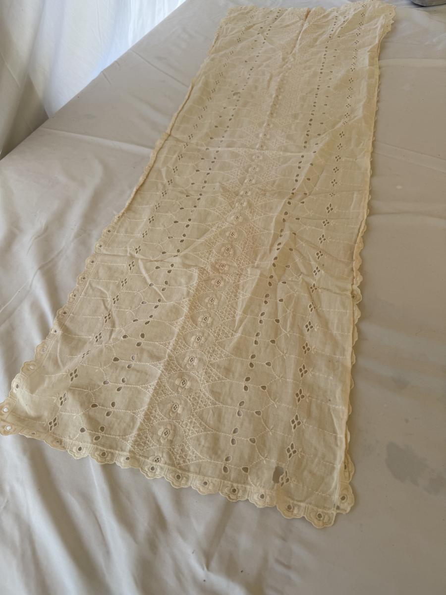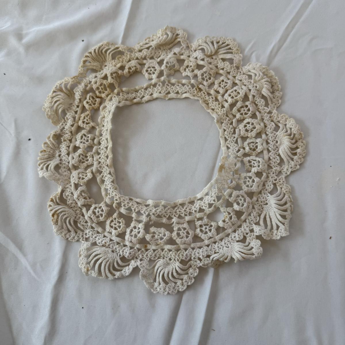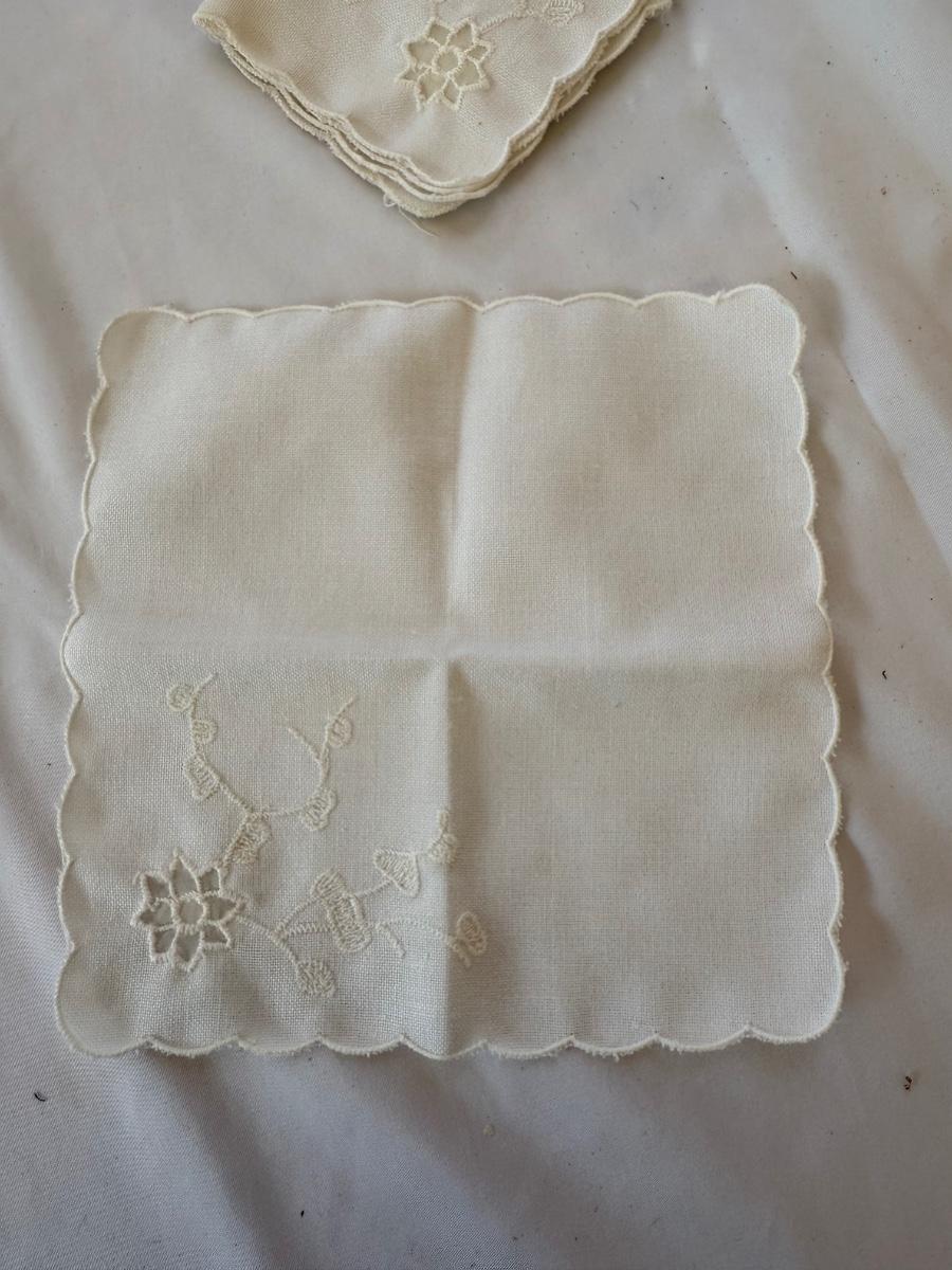 A large assortment of what appears to be hand crocheted doilies and beautiful linen coasters and napkins. The pink blue and yellow rectangular doily in the photograph measures 7.5” X 11”. The oval, orange and cream doily measures 16” X 7.5”. Eleven matching linen white napkins measure 11.5 X 17.5” each. The cross stitched linen table runner measures 41” X 14”. See photographs for entire inventory of lot.
