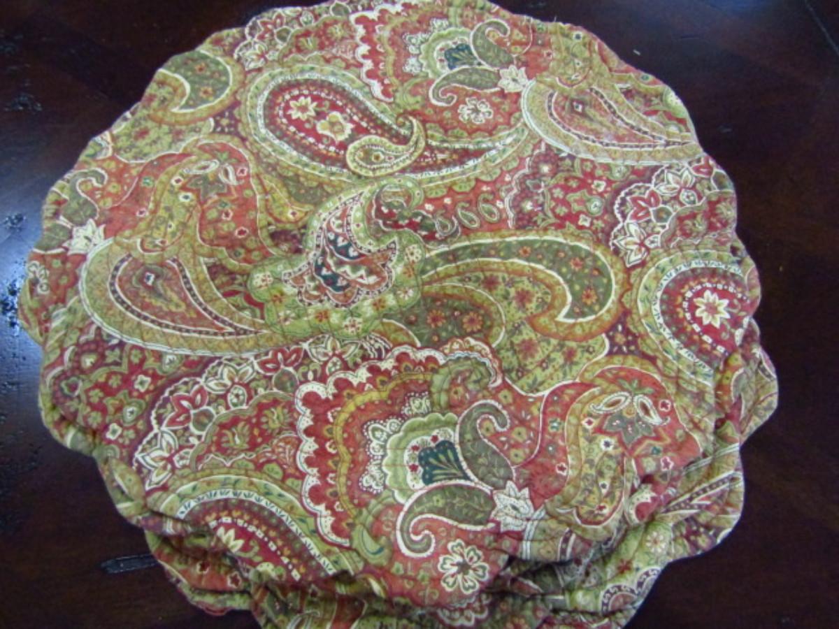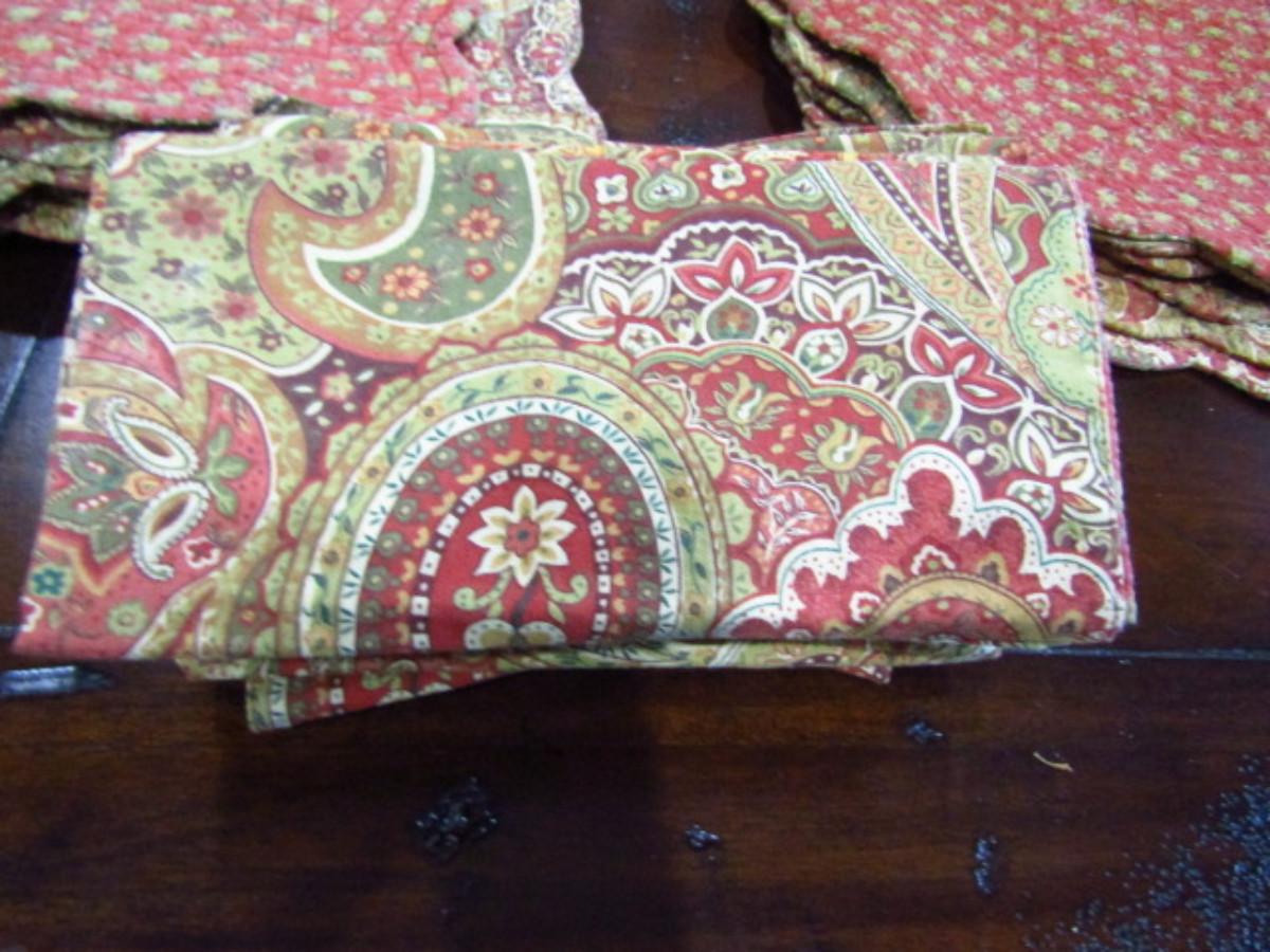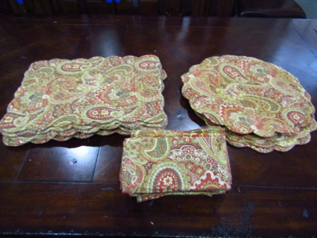 Linen Placemats and Napkins- Dark Red with Paisley (DR). Rectangular placemats- 12 pieces, round placemats- 7 pieces, napkins- 14 pieces. Placemats are double sided.