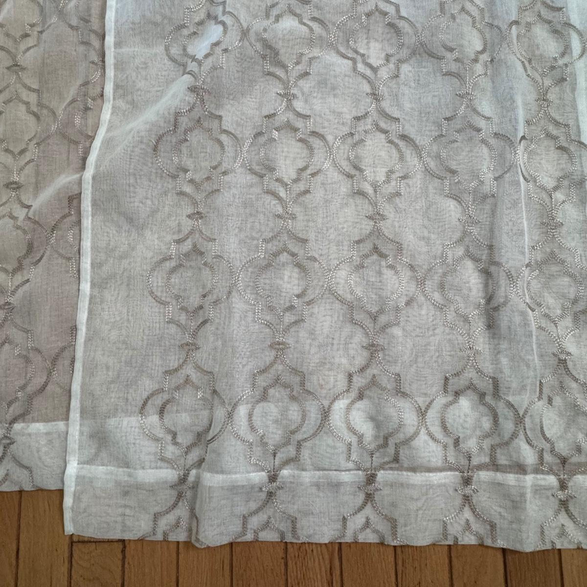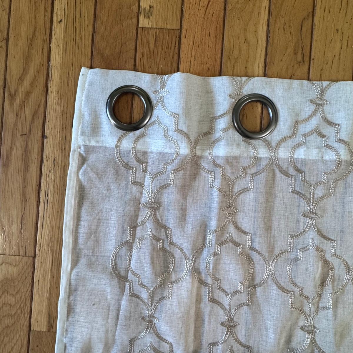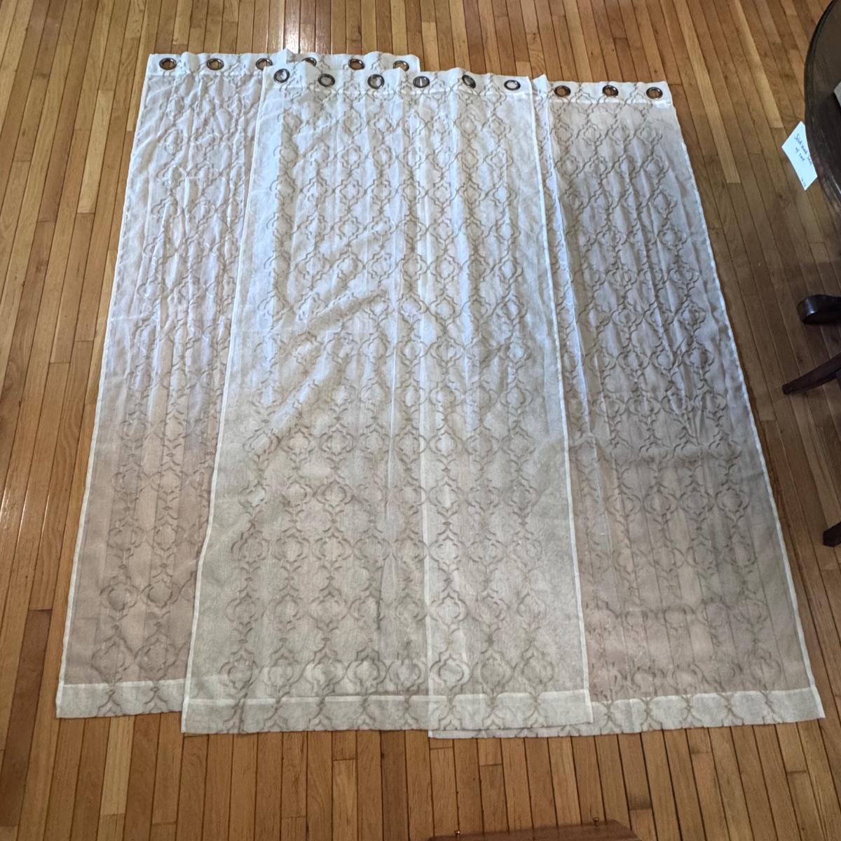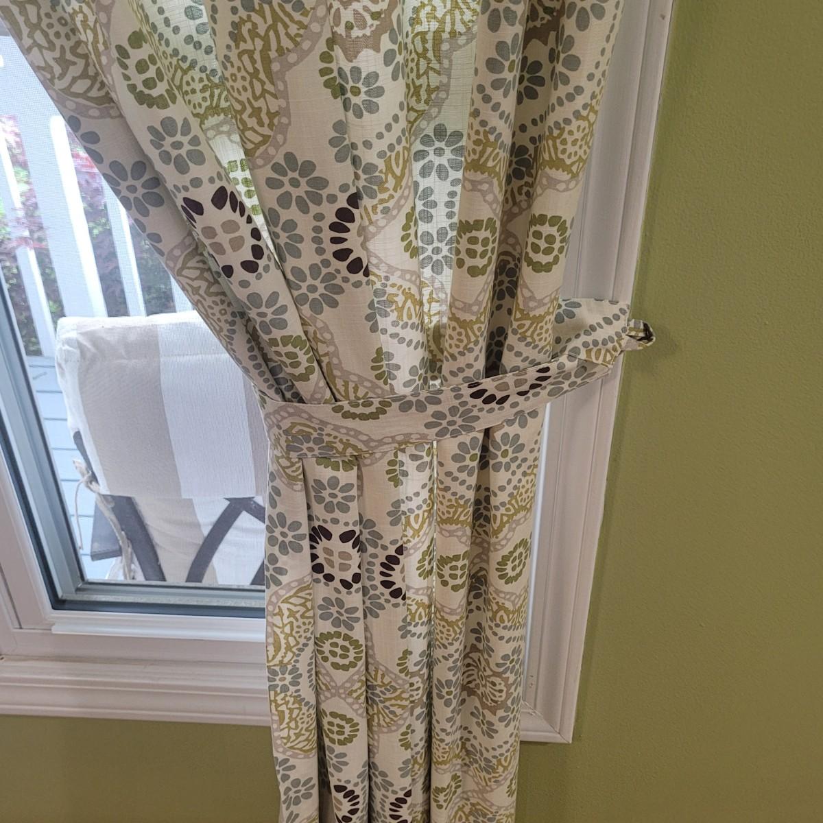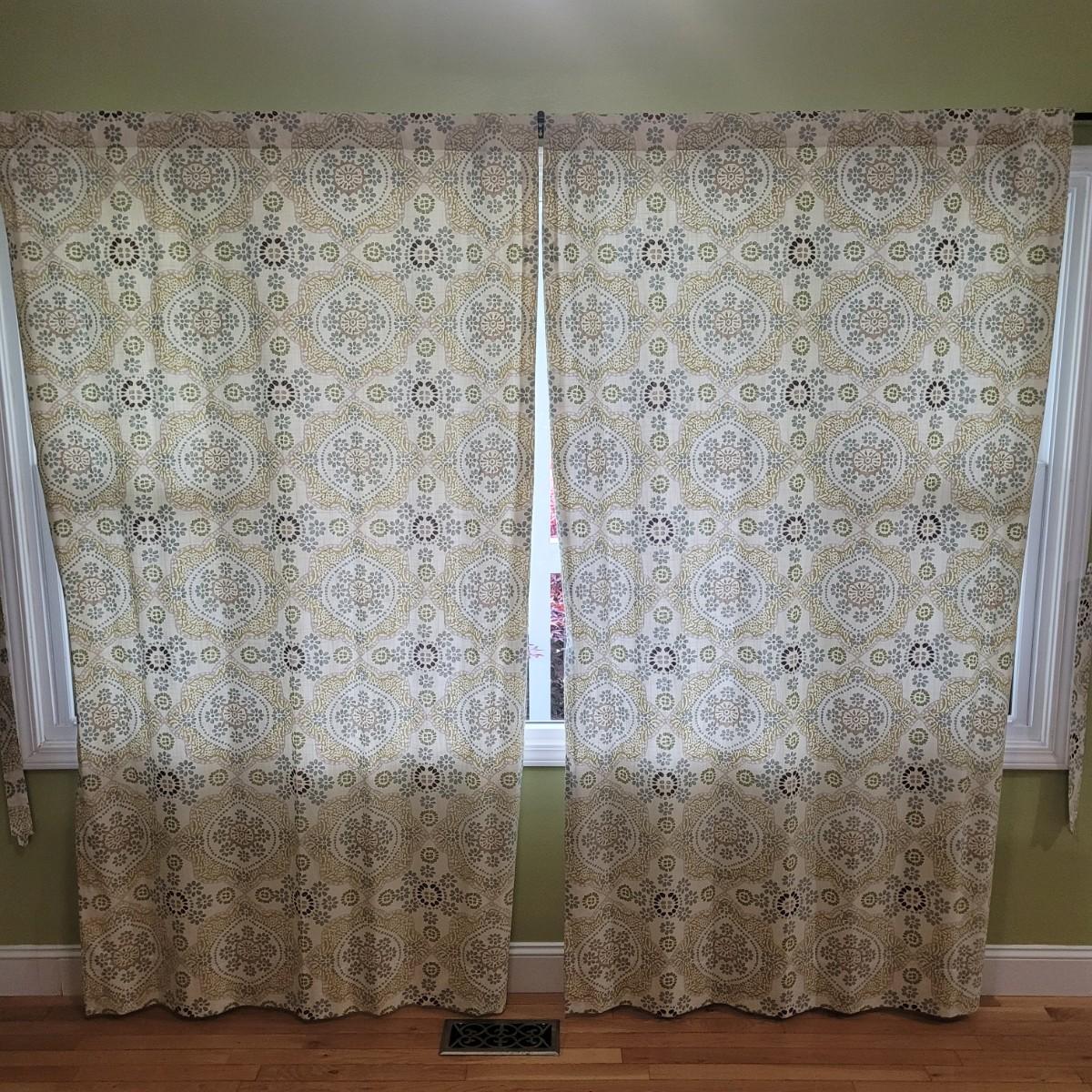 This lot includes several sets of curtains. The World Market brand curtains are made in Pakistan. They are rod pocket style for use with a mounted curtain rod and are 100% cotton. They feature a spotted floral pattern in green, blue, and maroon. The curtains can be held back with included restraining tiebacks. . Individually, the curtains measure 48" x 84"H. They do not include the rod they are shown hanging from. You’ll also find three sheer curtains with a gold colored detail that individually measure 38” x 84”H. Plus, two white, sheer curtains, six sheer blue curtains by Kensington Home Fashions, and a rod with brackets. The curtain rod is expandable. Please see pictures for all hardware. One of the blue curtains from Kensington Home Fashions has a few brown stains on it - see picture included. Shipping available.