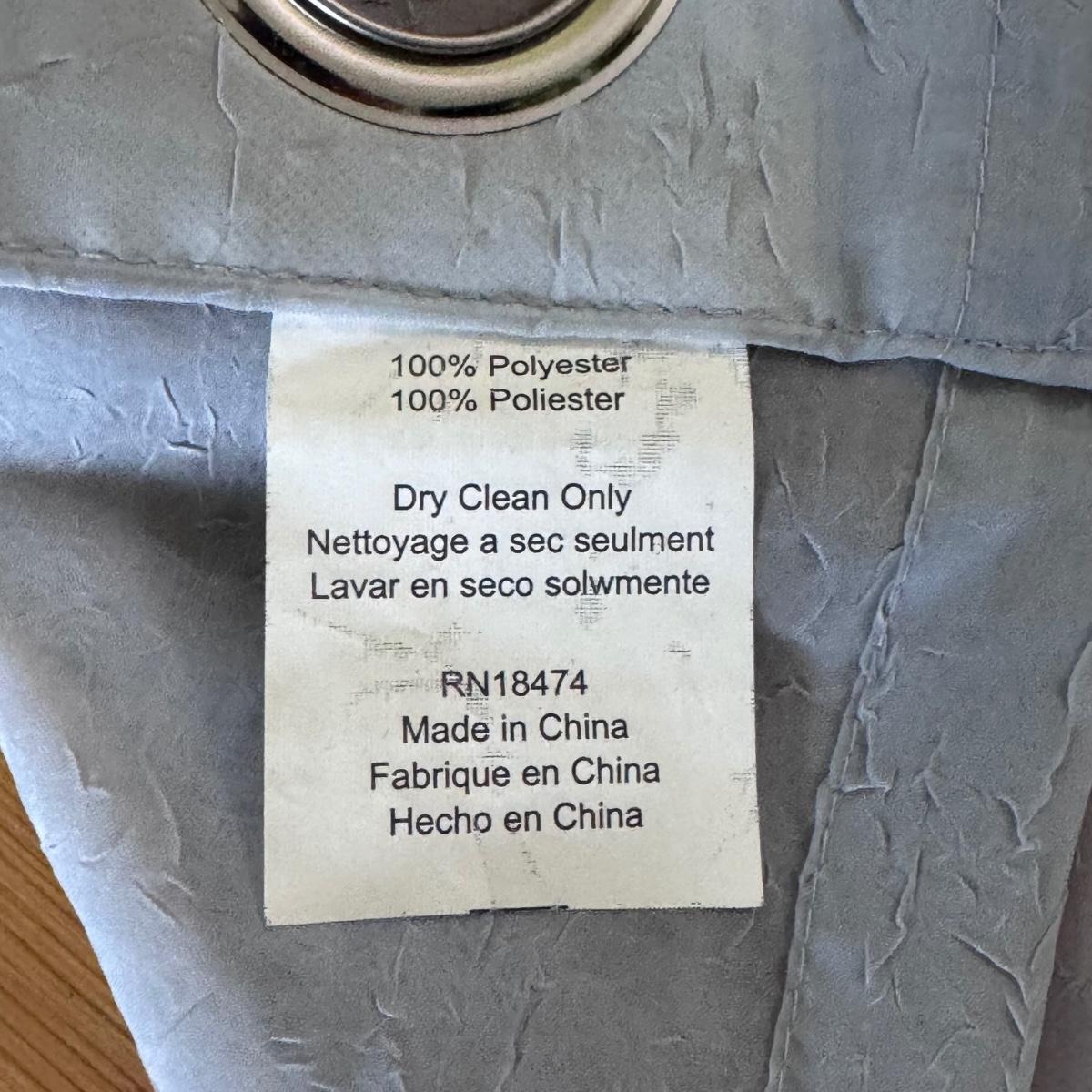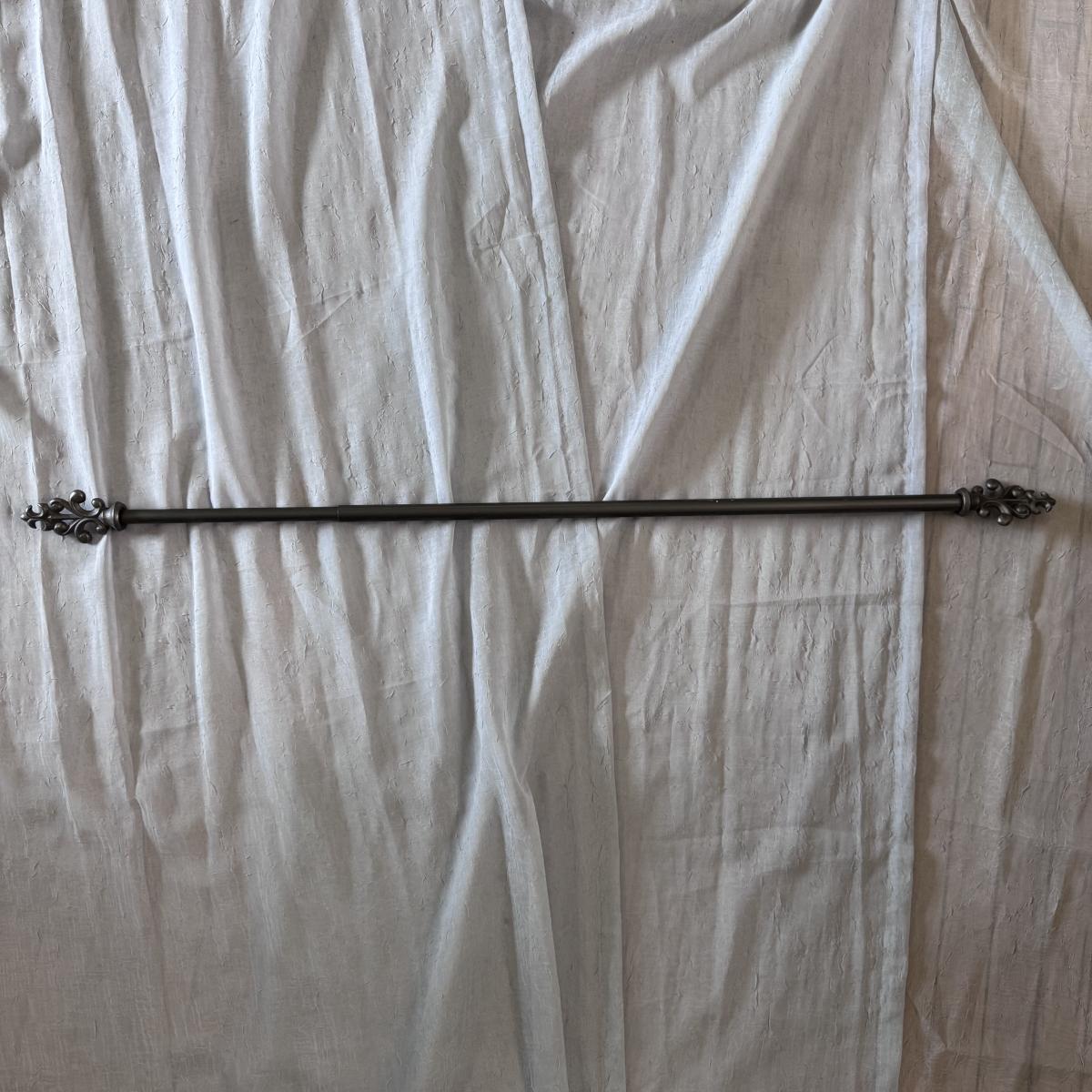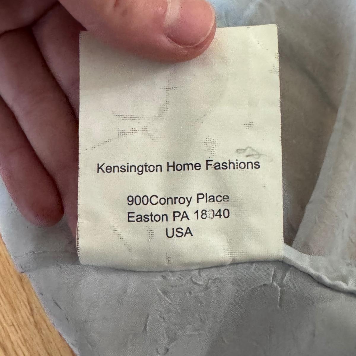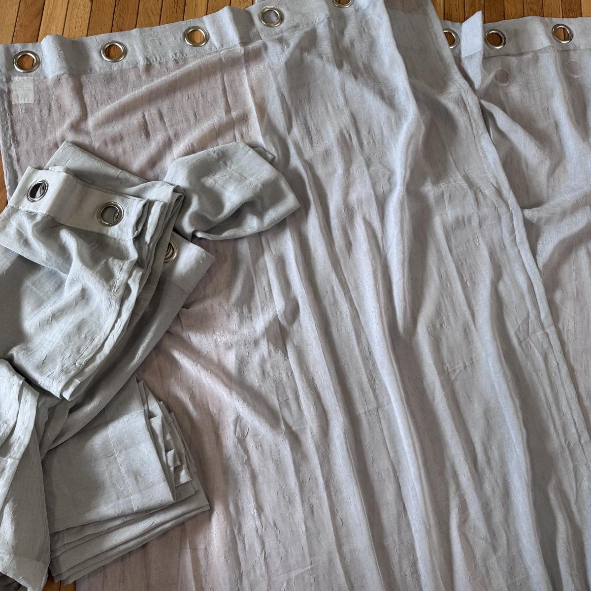 This lot includes several sets of curtains. The World Market brand curtains are made in Pakistan. They are rod pocket style for use with a mounted curtain rod and are 100% cotton. They feature a spotted floral pattern in green, blue, and maroon. The curtains can be held back with included restraining tiebacks. . Individually, the curtains measure 48" x 84"H. They do not include the rod they are shown hanging from. You’ll also find three sheer curtains with a gold colored detail that individually measure 38” x 84”H. Plus, two white, sheer curtains, six sheer blue curtains by Kensington Home Fashions, and a rod with brackets. The curtain rod is expandable. Please see pictures for all hardware. One of the blue curtains from Kensington Home Fashions has a few brown stains on it - see picture included. Shipping available.