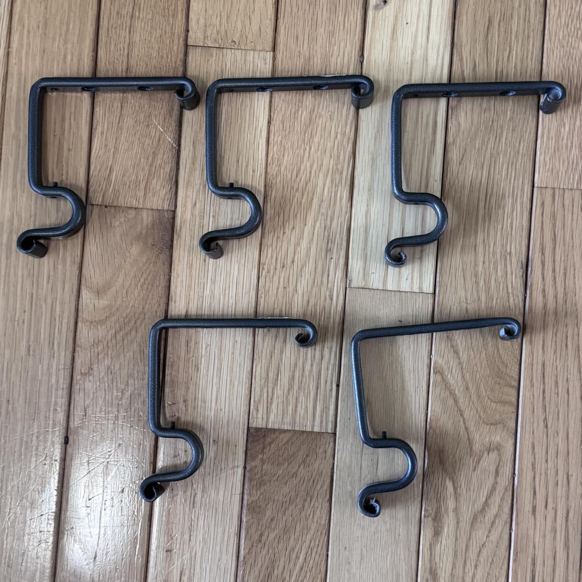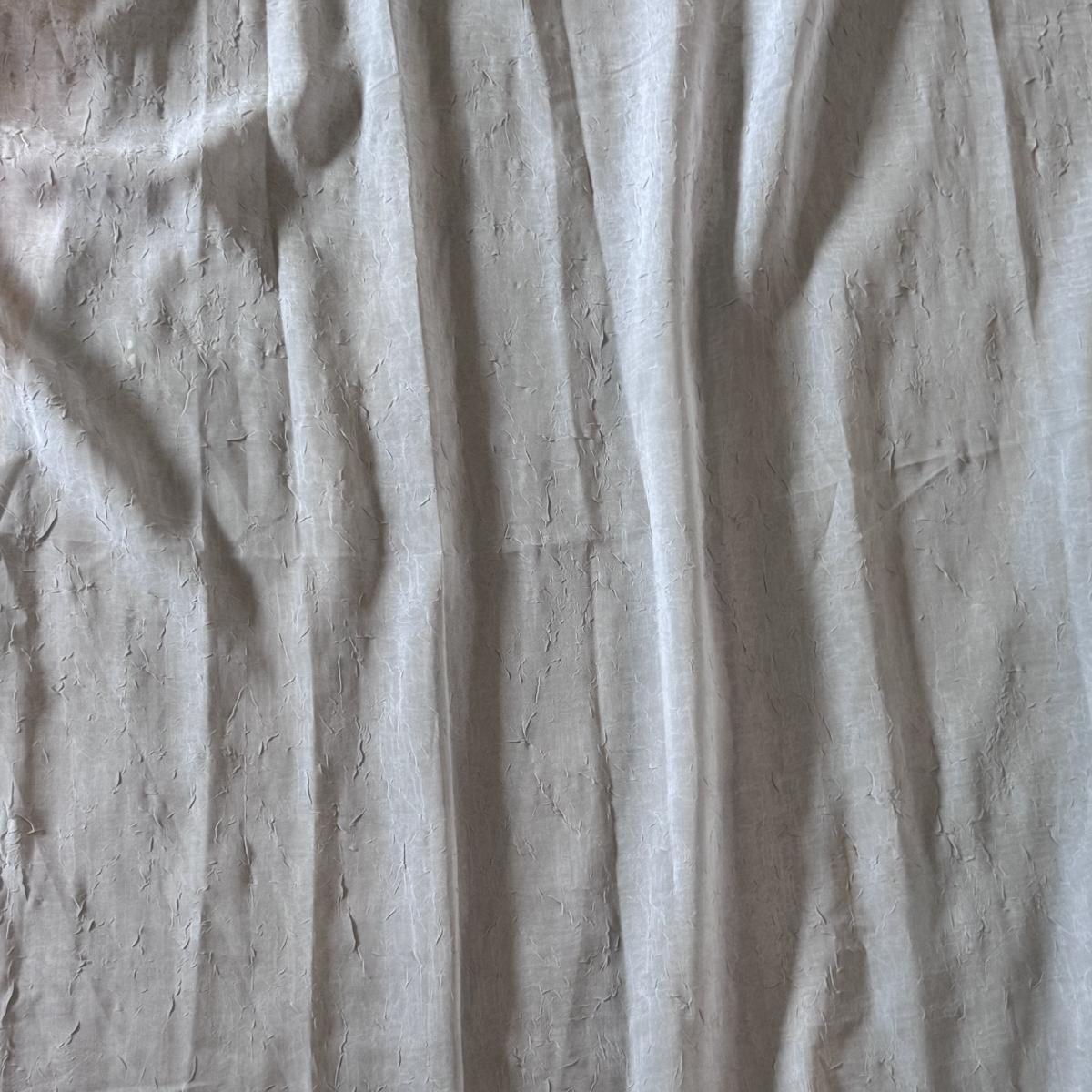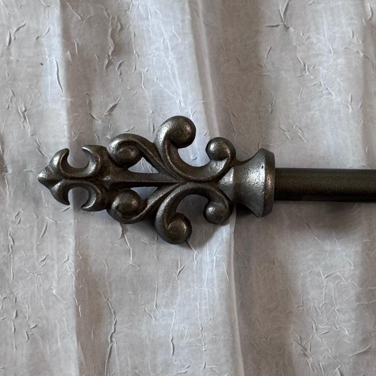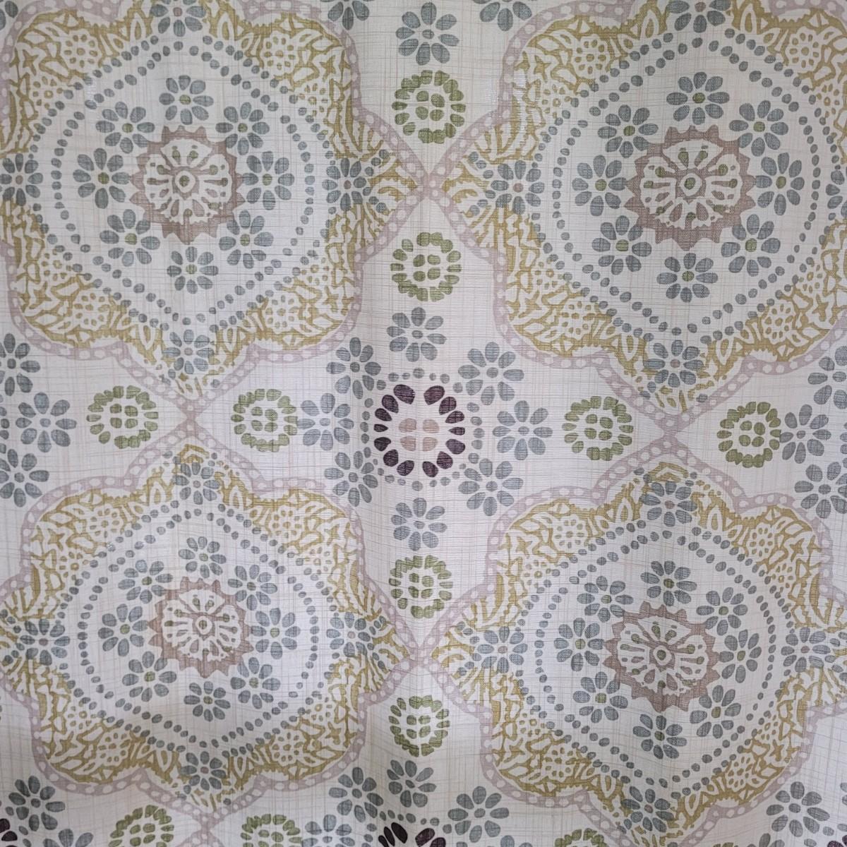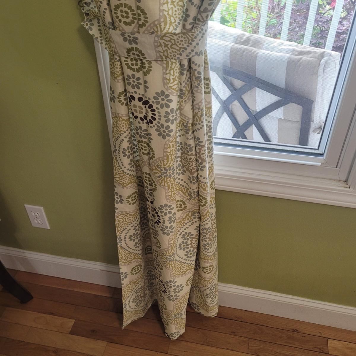 This lot includes several sets of curtains. The World Market brand curtains are made in Pakistan. They are rod pocket style for use with a mounted curtain rod and are 100% cotton. They feature a spotted floral pattern in green, blue, and maroon. The curtains can be held back with included restraining tiebacks. . Individually, the curtains measure 48" x 84"H. They do not include the rod they are shown hanging from. You’ll also find three sheer curtains with a gold colored detail that individually measure 38” x 84”H. Plus, two white, sheer curtains, six sheer blue curtains by Kensington Home Fashions, and a rod with brackets. The curtain rod is expandable. Please see pictures for all hardware. One of the blue curtains from Kensington Home Fashions has a few brown stains on it - see picture included. Shipping available.
