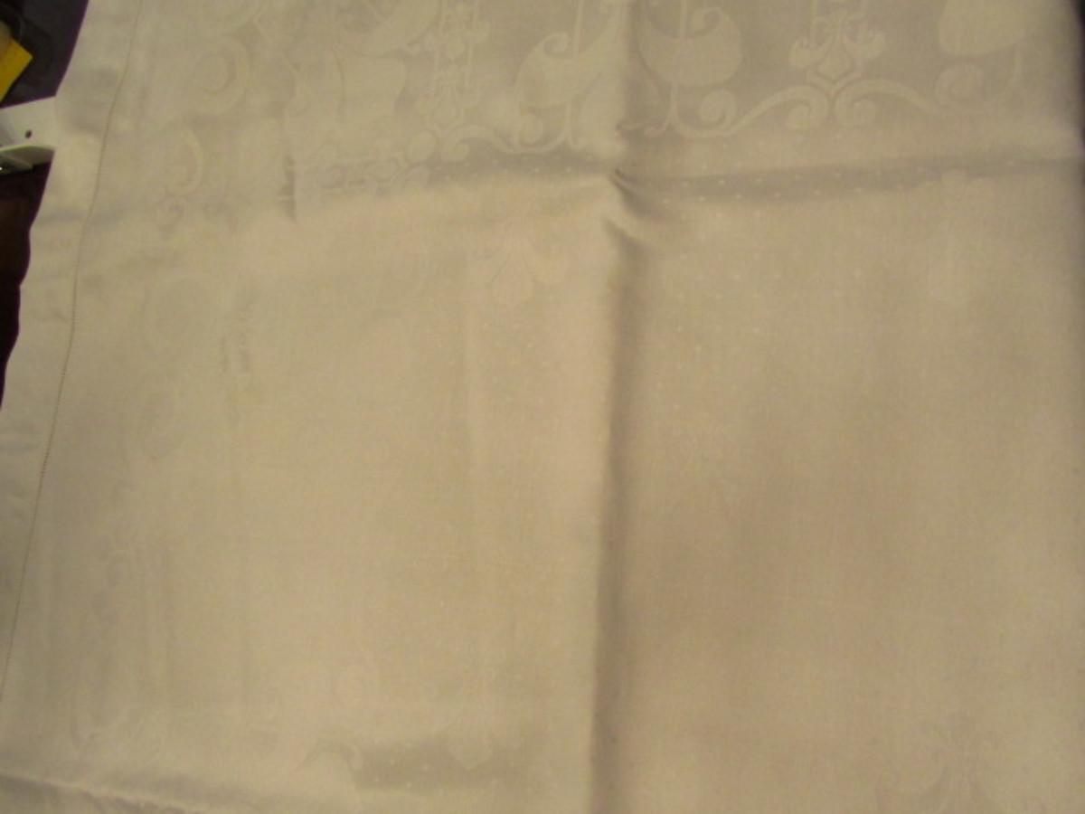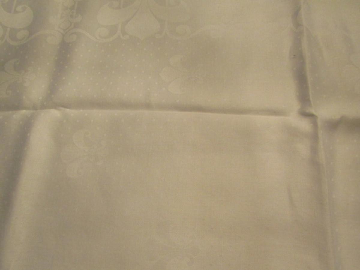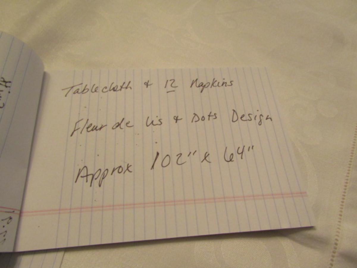 Linen Table Cloth and 12 Napkins- Fleur De Lis and Dots Design- Approx 102" x 64" (C). May be some areas of discoloration/spotting.