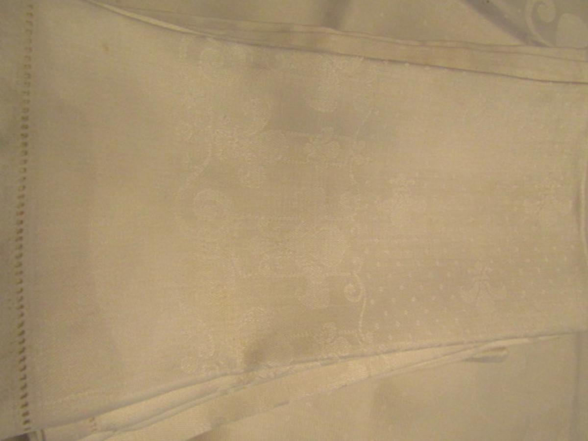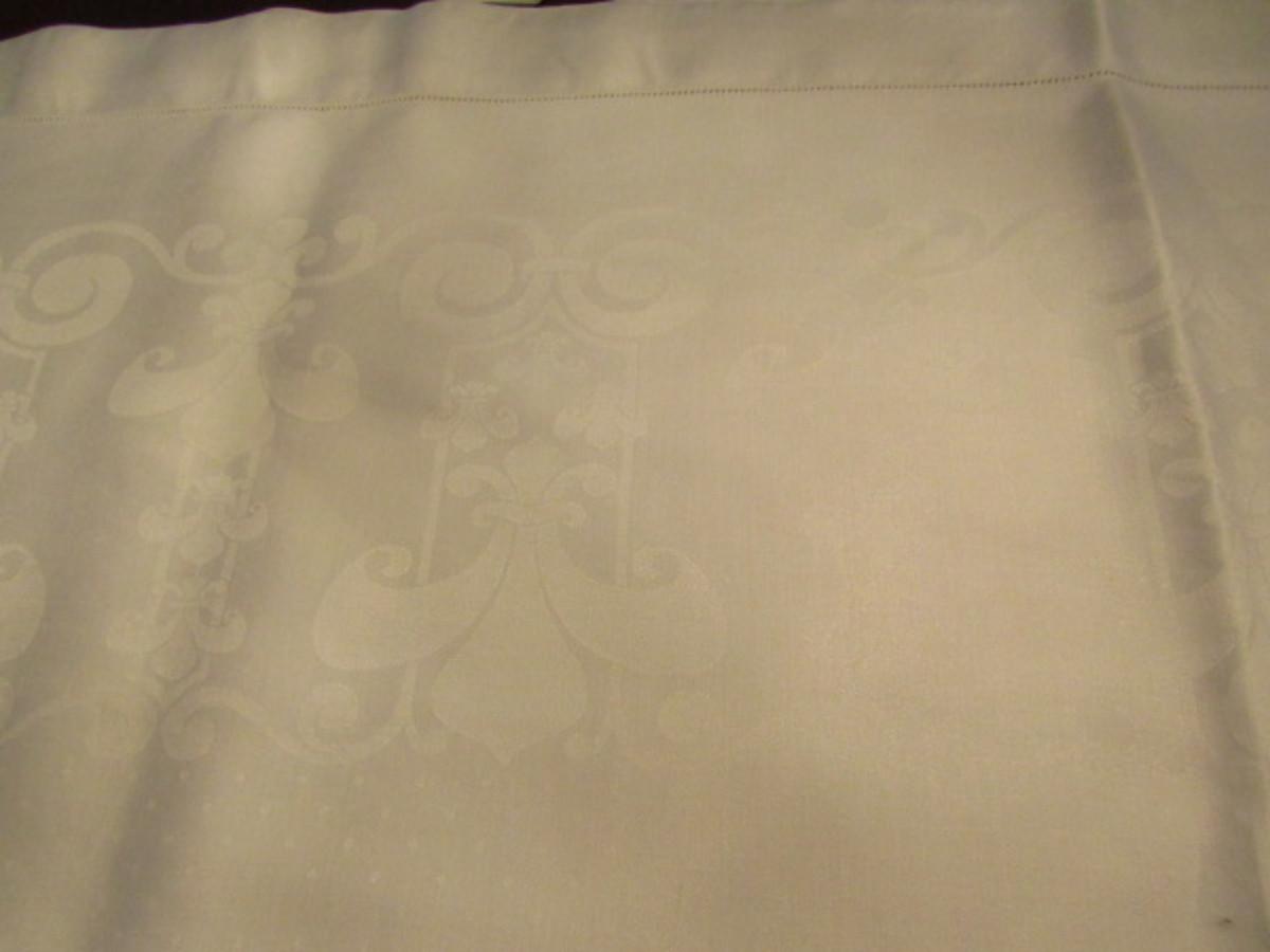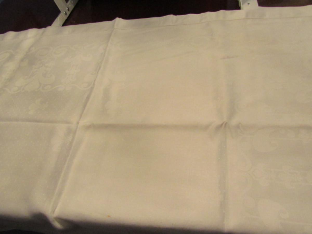 Linen Table Cloth and 12 Napkins- Fleur De Lis and Dots Design- Approx 102" x 64" (C). May be some areas of discoloration/spotting.