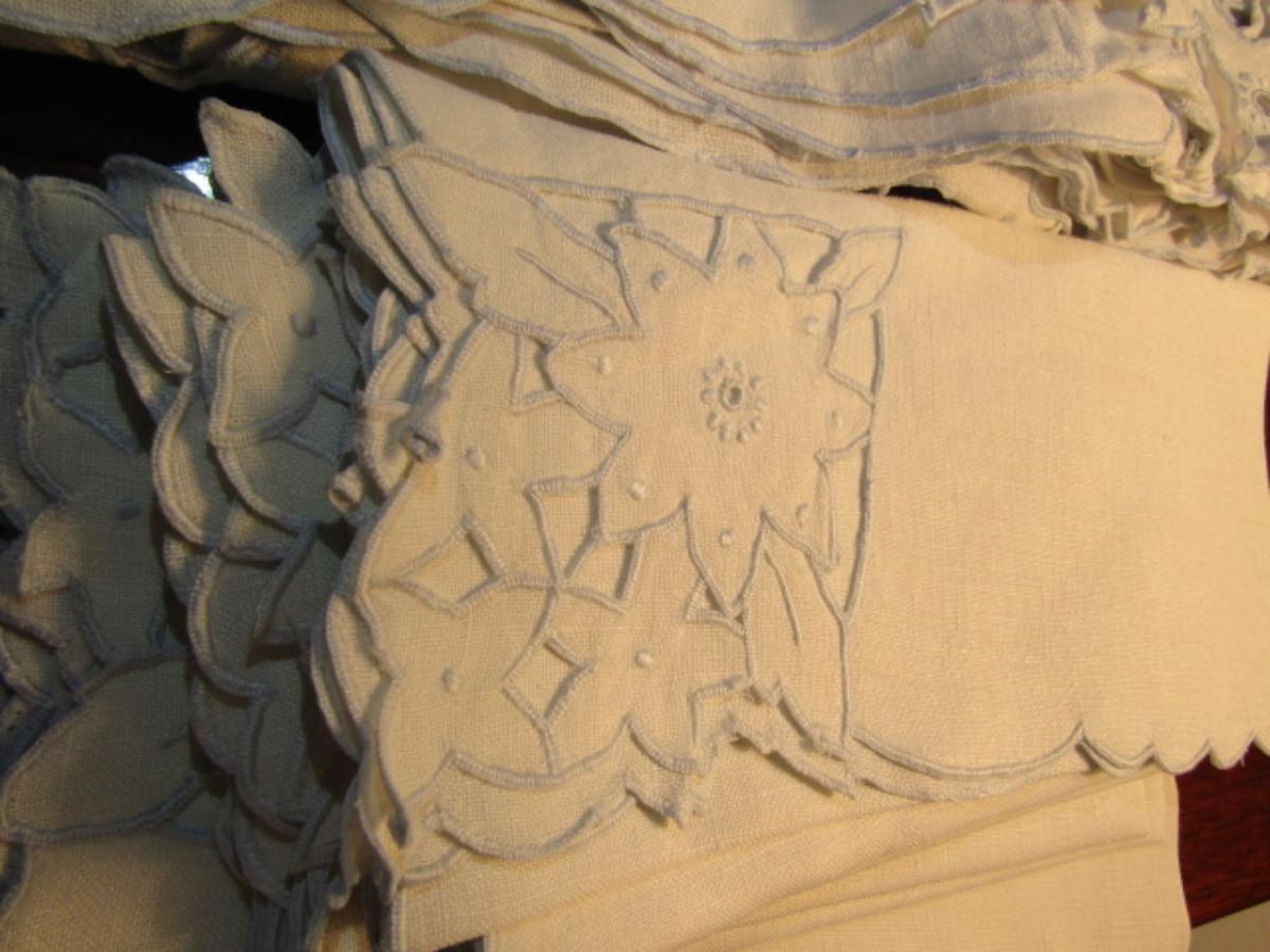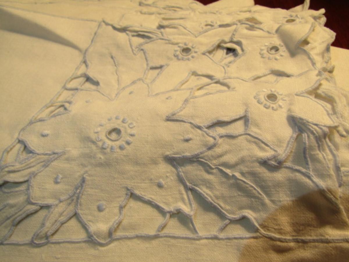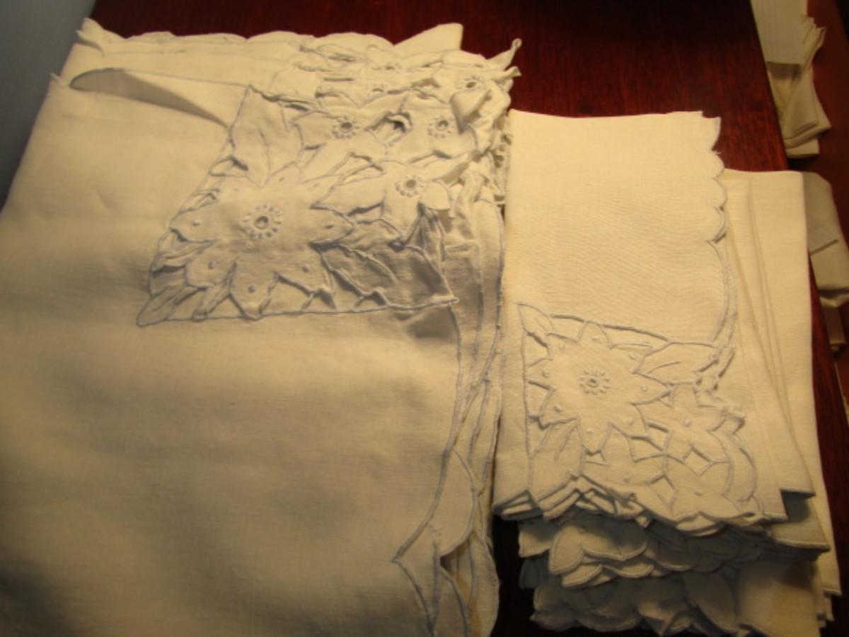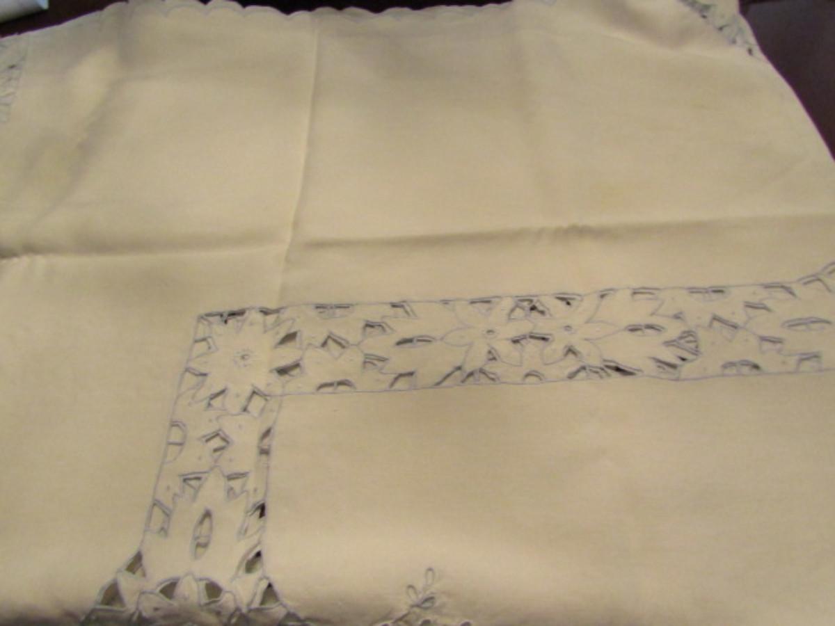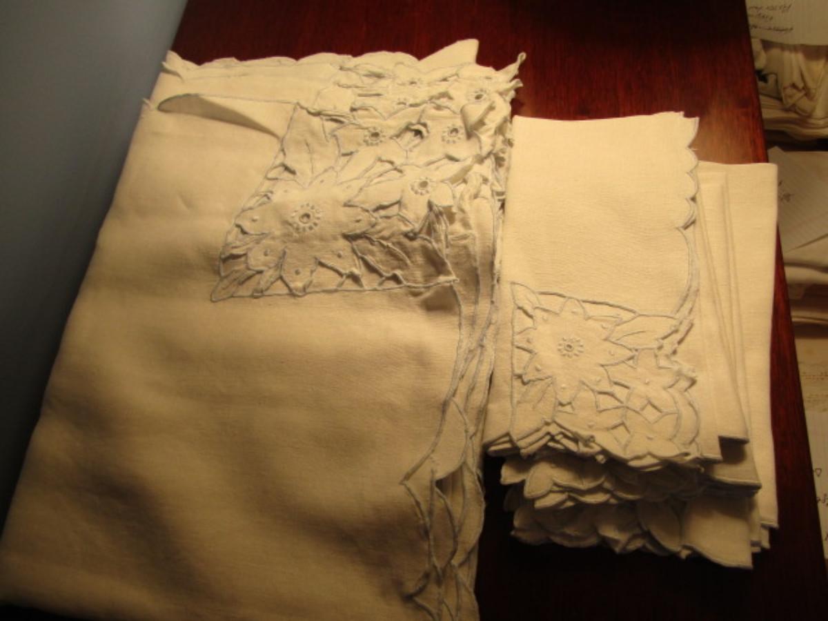 Linen Table Cloth and 7 Napkins- Floral Cutout Design with Pale Blue- Approx 82" x 56" (C). May be some areas of discoloration/spotting.
