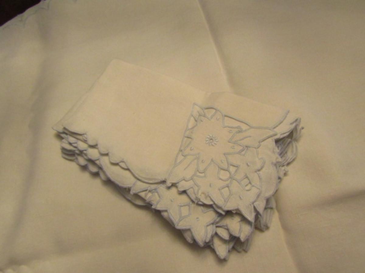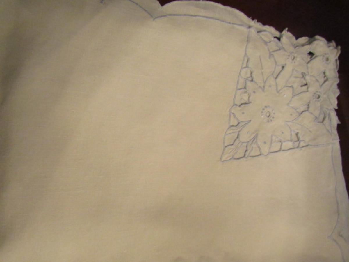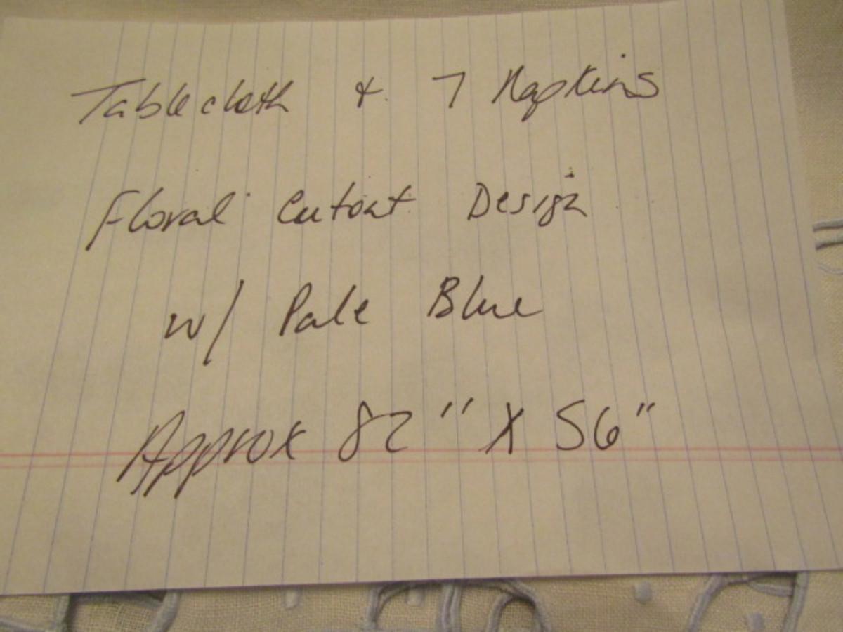 Linen Table Cloth and 7 Napkins- Floral Cutout Design with Pale Blue- Approx 82" x 56" (C)