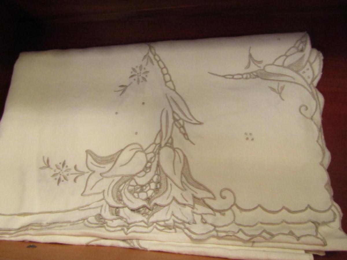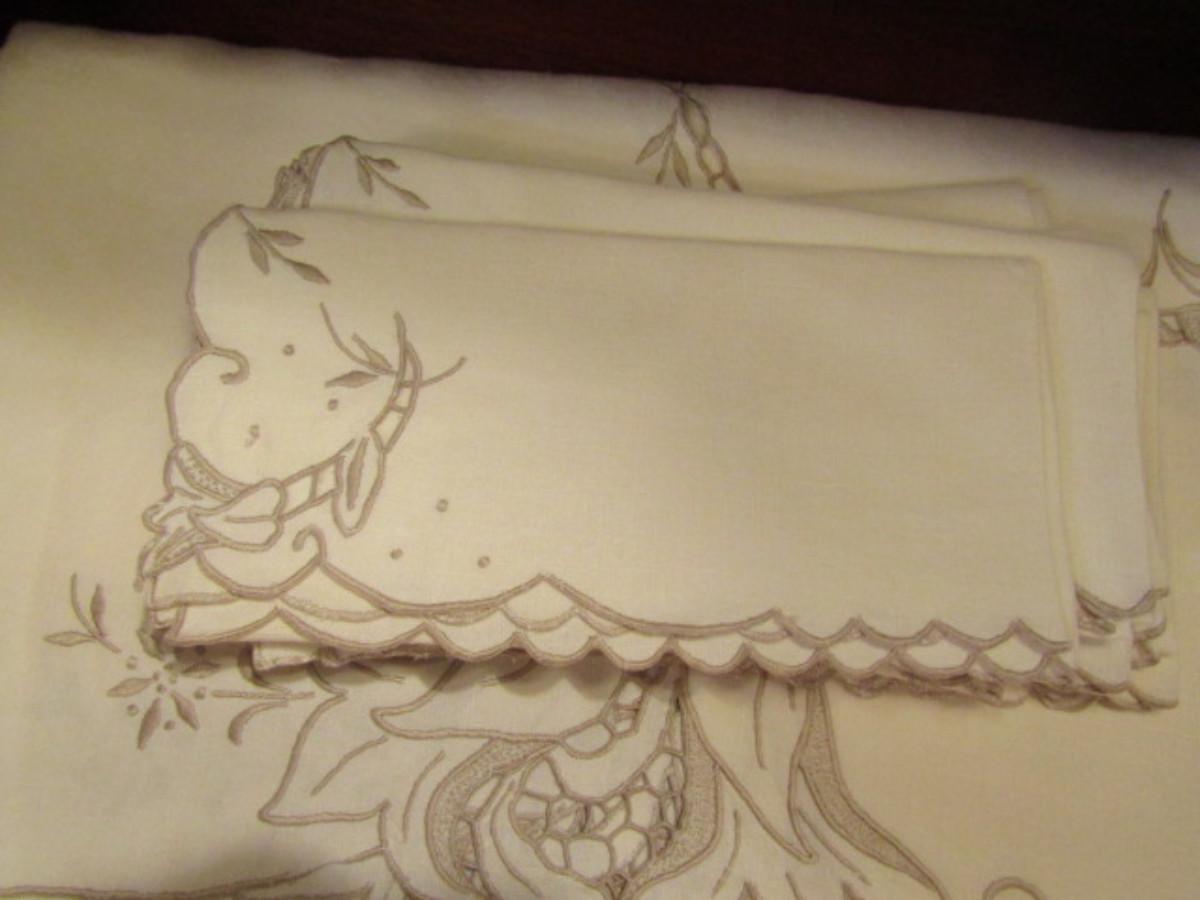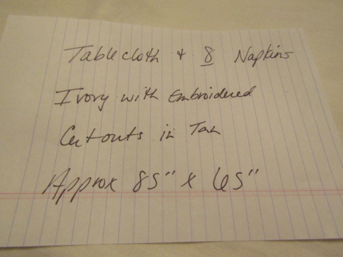 Linen Table Cloth and 8 Napkins- Ivory with Embroidered Cutouts in Tan- Approx 85" x 65". May be some areas of discoloration/spotting.