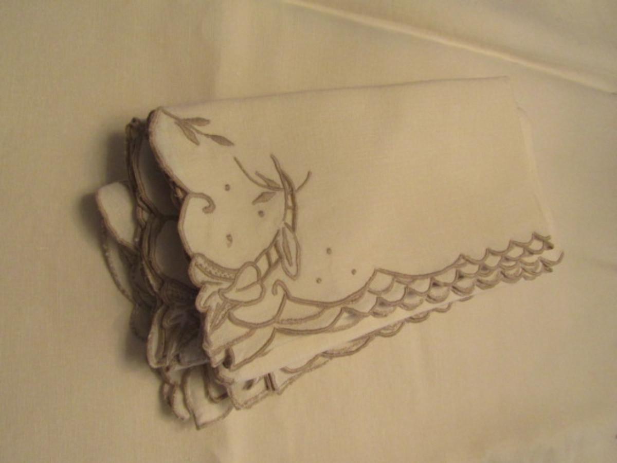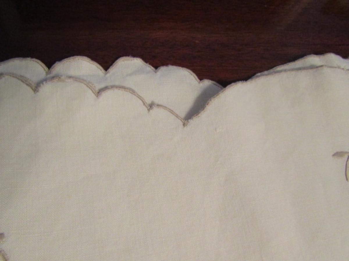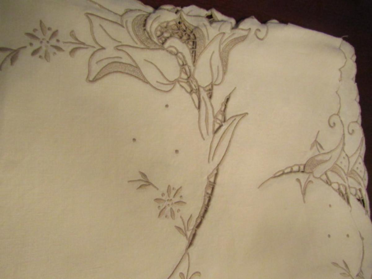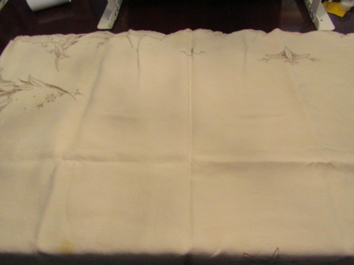 Linen Table Cloth and 8 Napkins- Ivory with Embroidered Cutouts in Tan- Approx 85" x 65". May be some areas of discoloration/spotting.