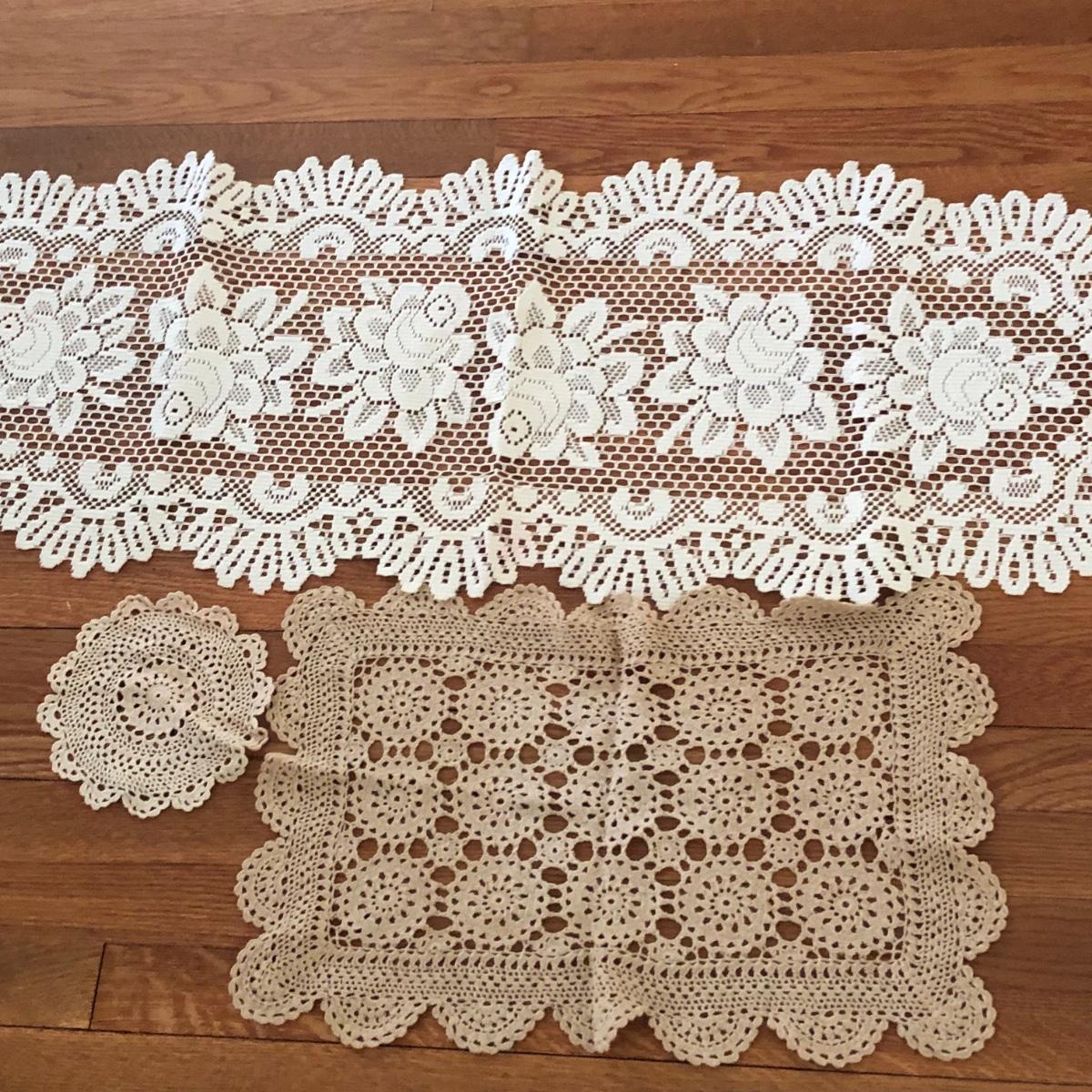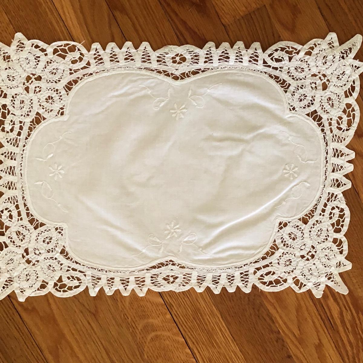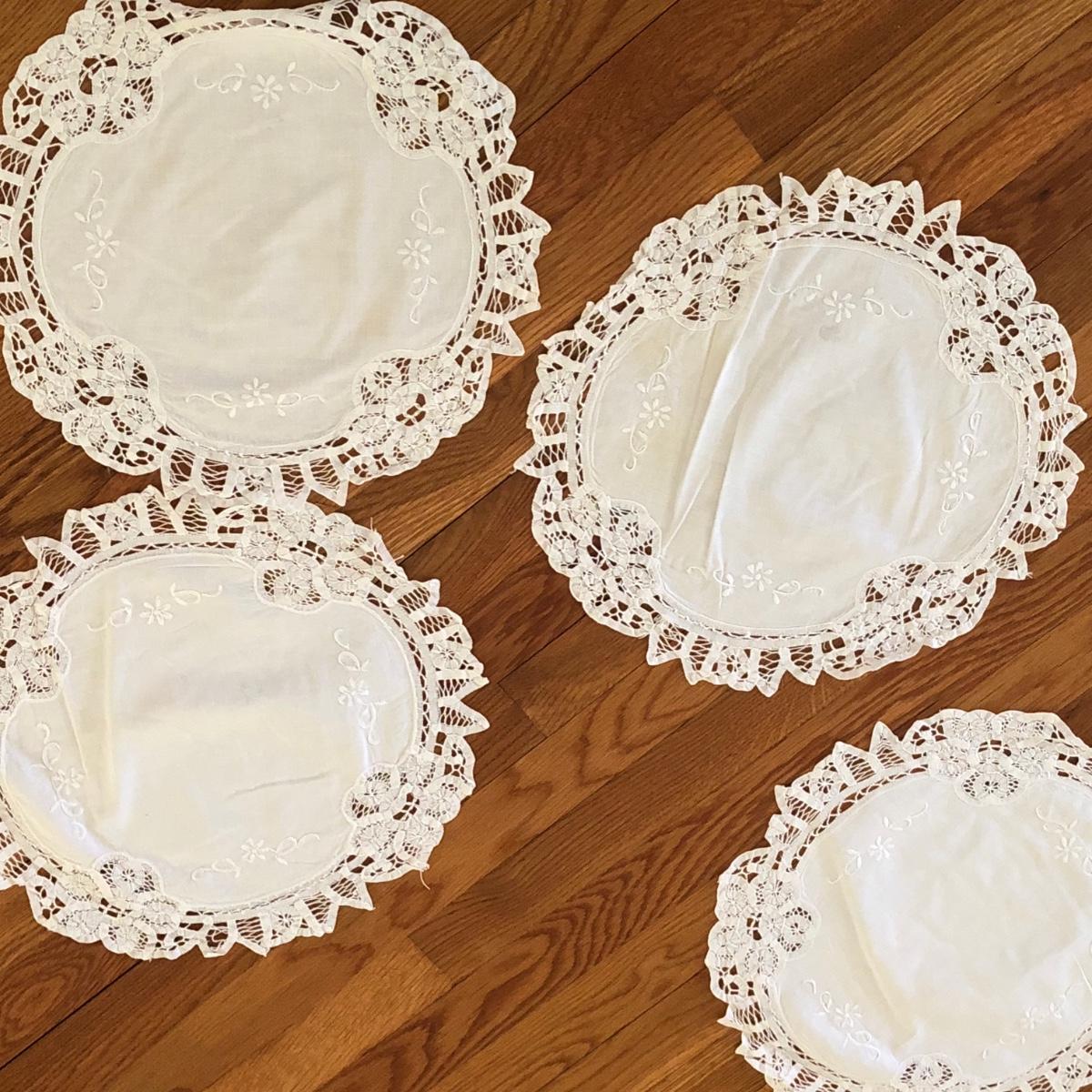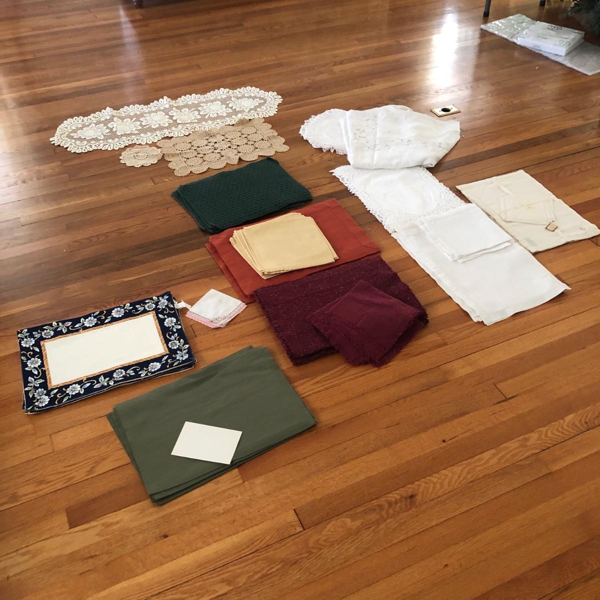 This lot includes one linen cotton mix table cloth that measures 67” x 82”. It has matching napkins and two sets of placemats: 6 and 16 placemats and the 16 placemats has 6 matching napkins. There are also 8 linen placemats, 4 blue floral placemats, 6 forest green placemats, 6 rust and 6 green cloth placemats and 6 maroon placemats with 6 matching napkins. This lot also has doilies and more! Shipping Available.