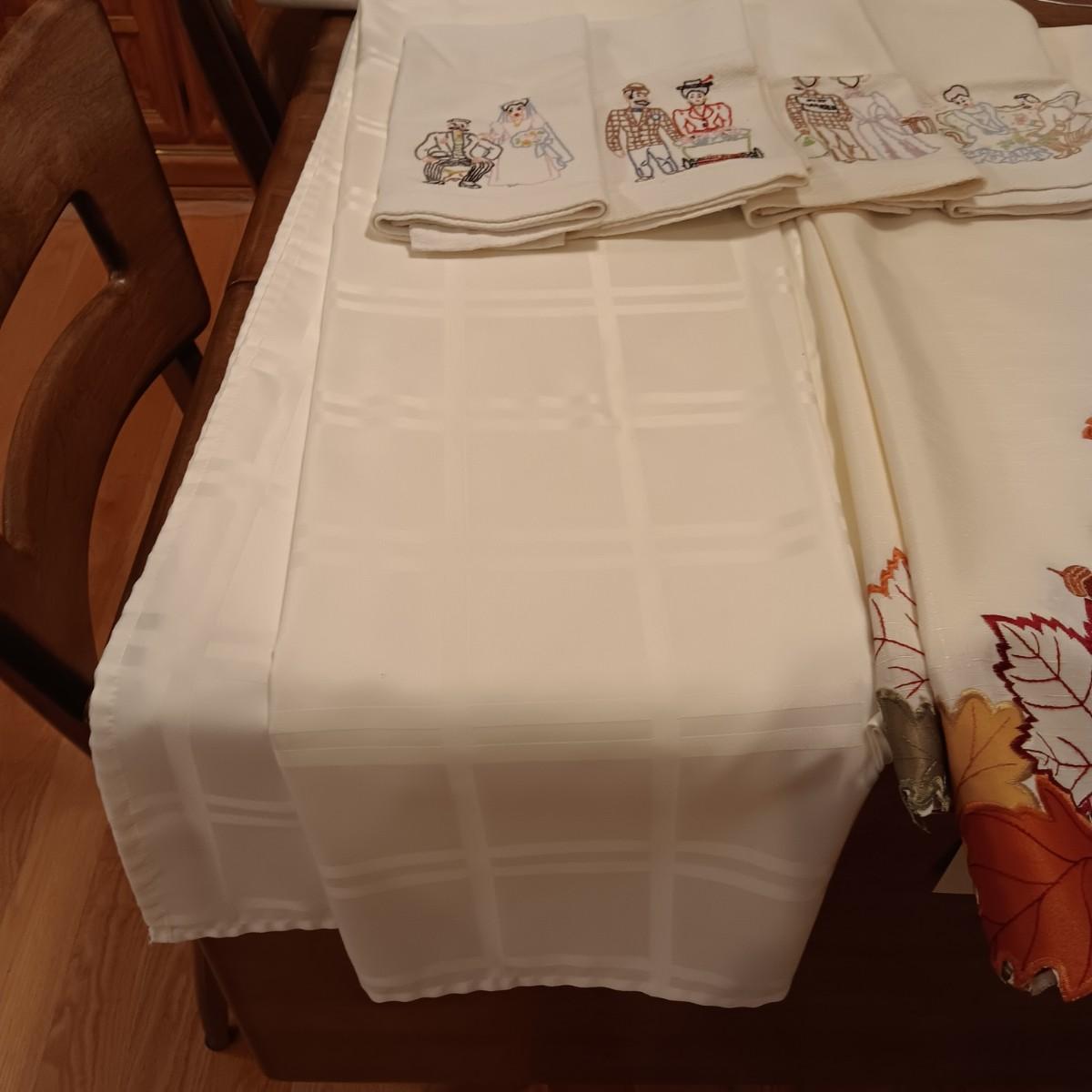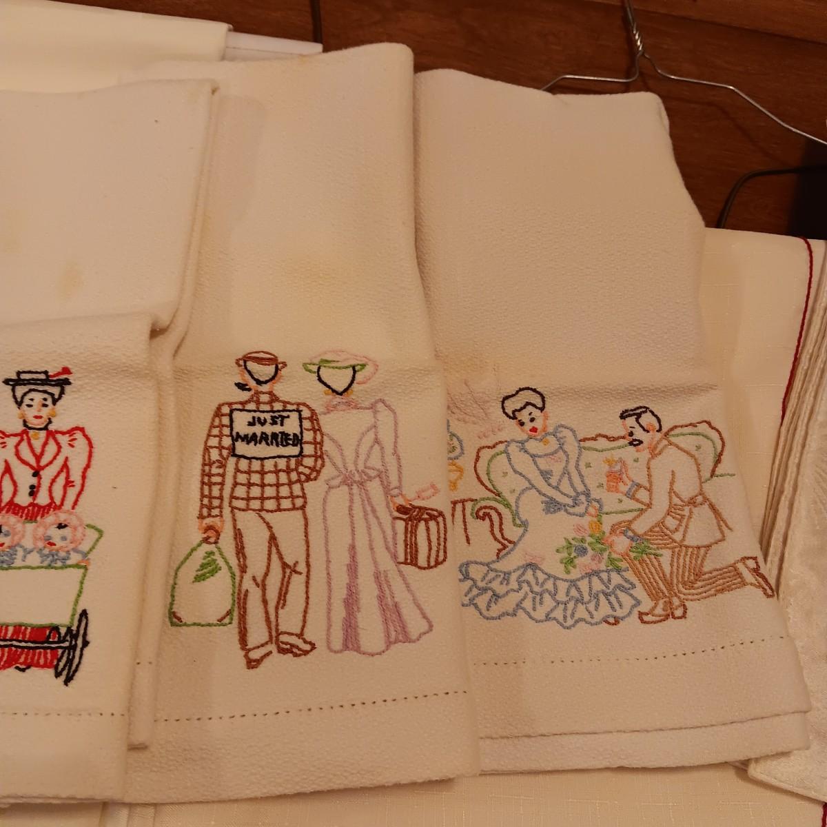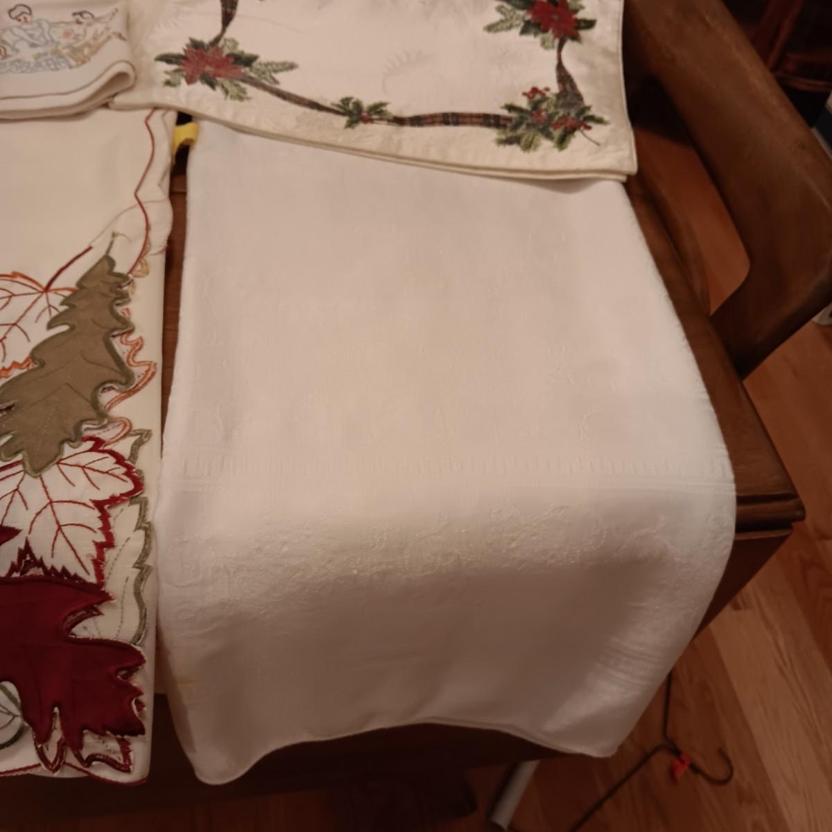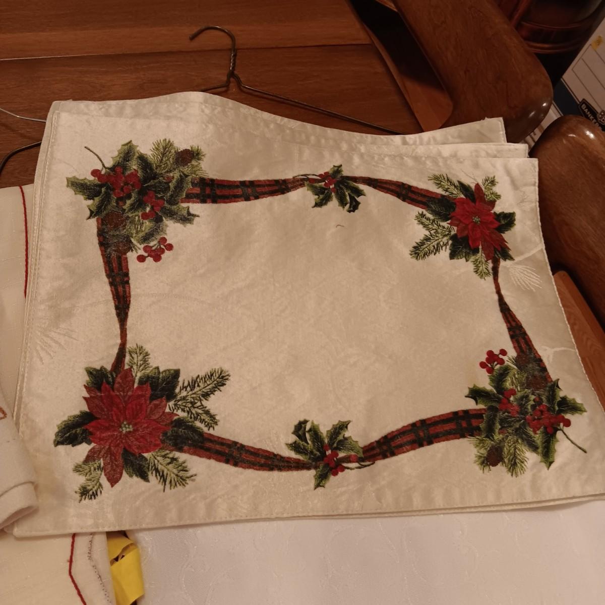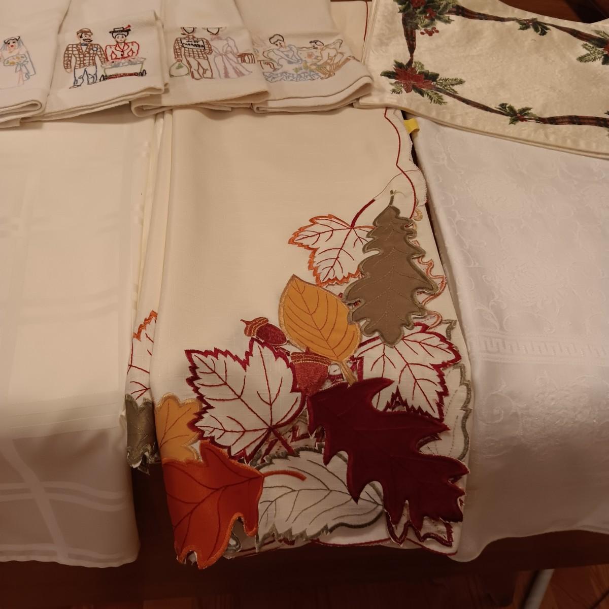 LINEN TABLECLOTHS, HAND EMBROIDERED KITCHEN TOWELS & 4 PLACEMATS