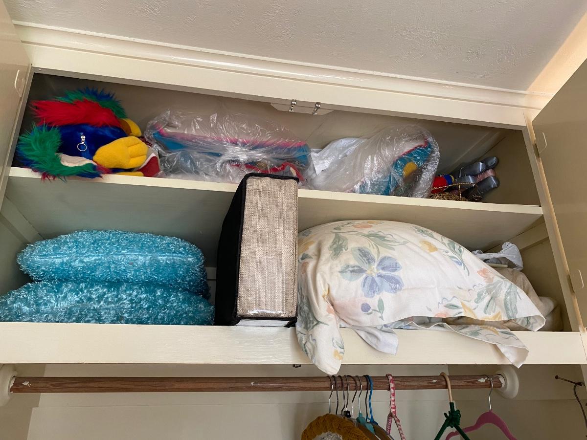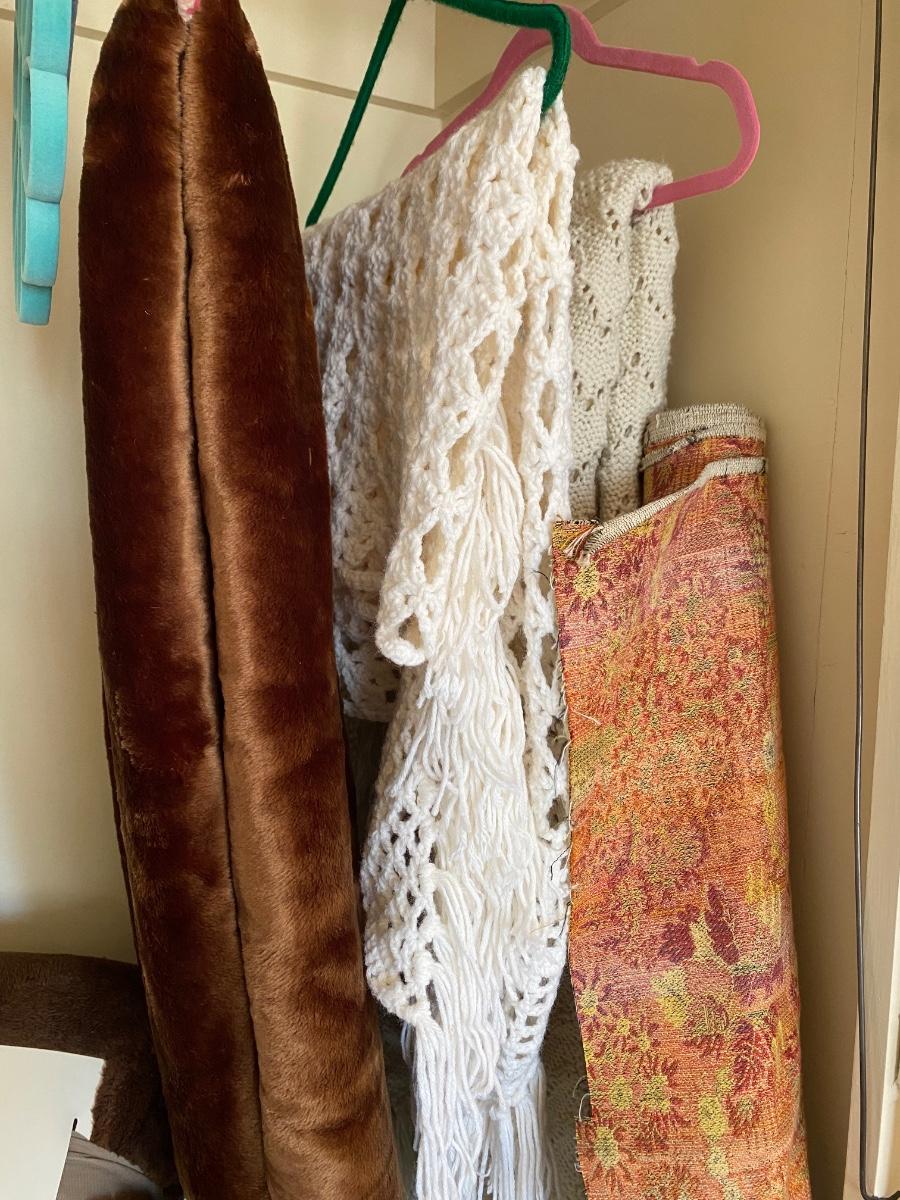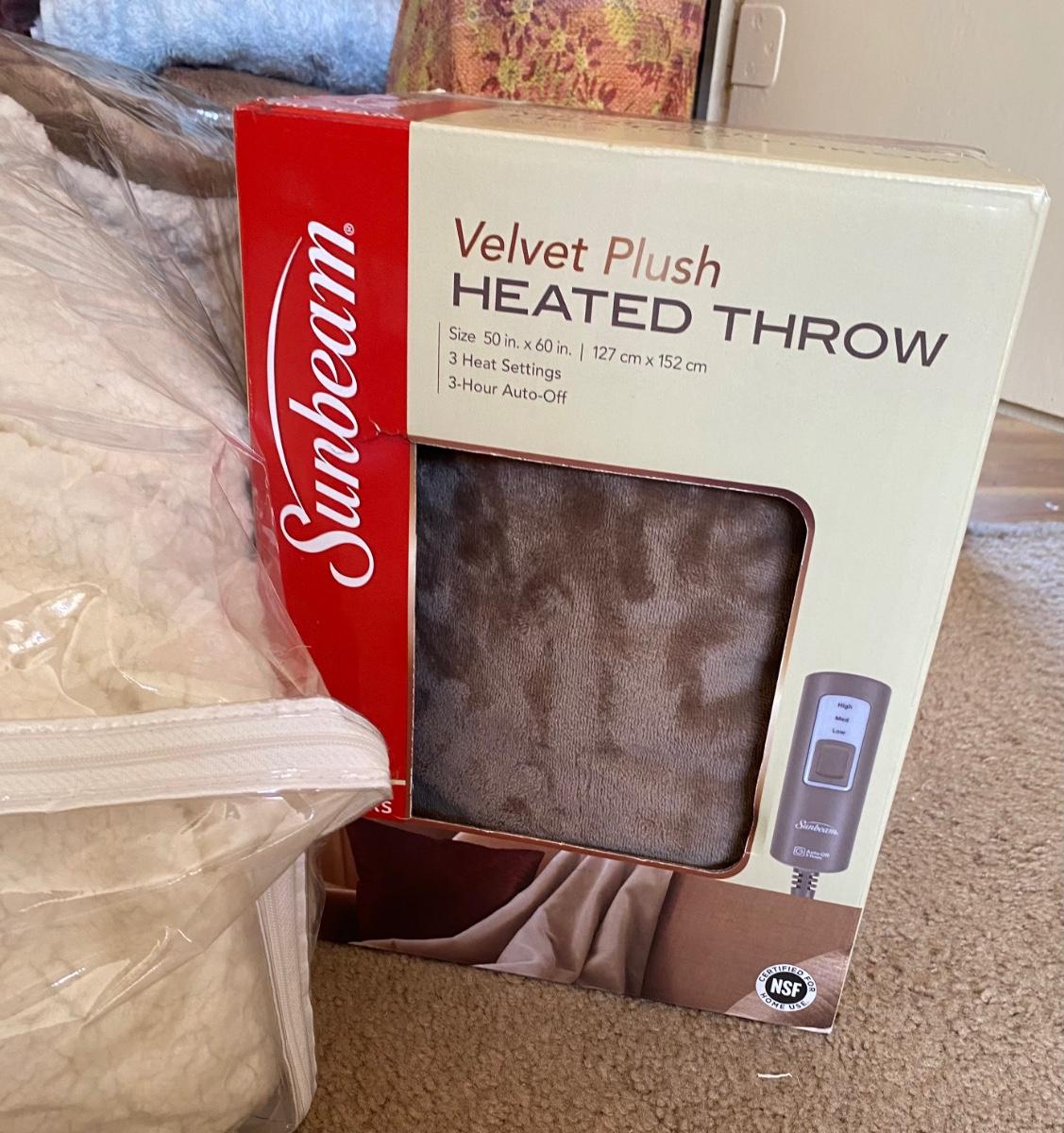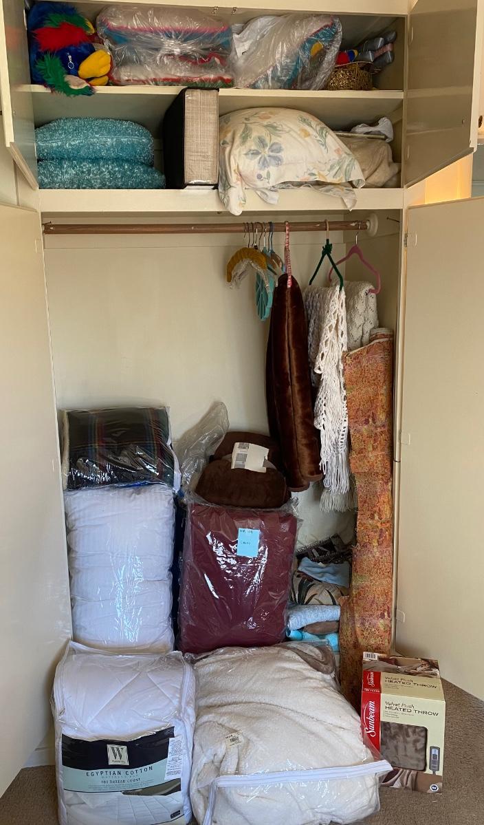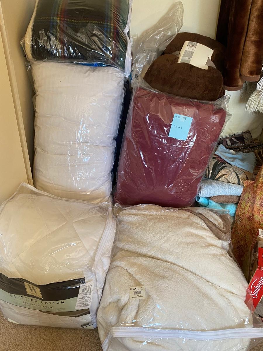 Blankets, Sunbeam heated throw, towels, mattress pad, pillows, throw pillows and roll of fabric.
