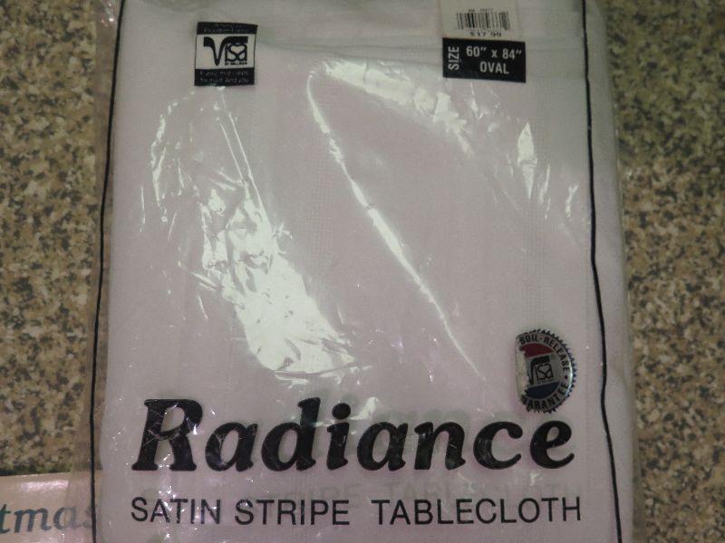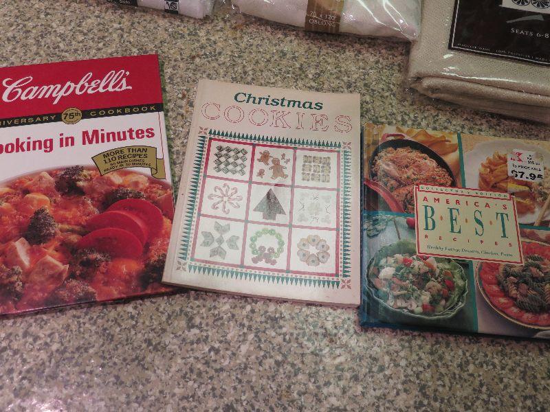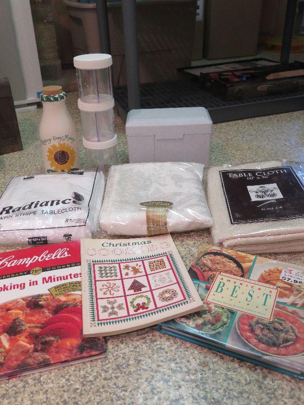 Three table cloths, the satin stripe has a small soiled area, a recipe holder, cookbooks, containers and a bank. Bring box to remove from basement. Please read Terms and Conditions before placing a bid. Pick up is Friday, October 25th between 4 and 7, and Saturday, October 26th between 9 and 1. Props included in photos are not included in listing. All measurements are approximate. Comes from home with cats.