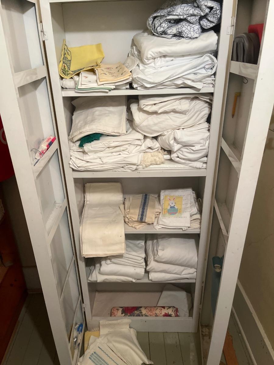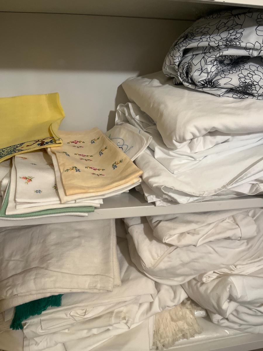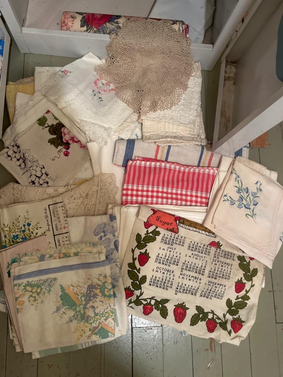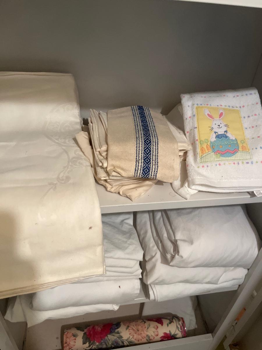 Many vintage bedsheets, tablecloths and runners, and brighter items, etc. Does not include cabinet