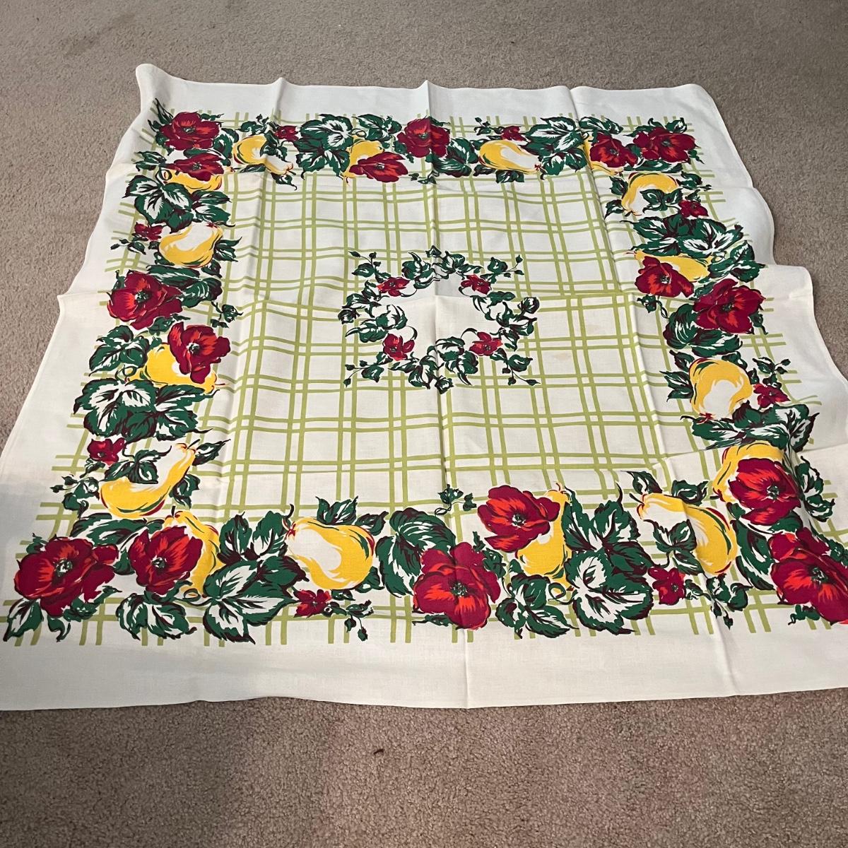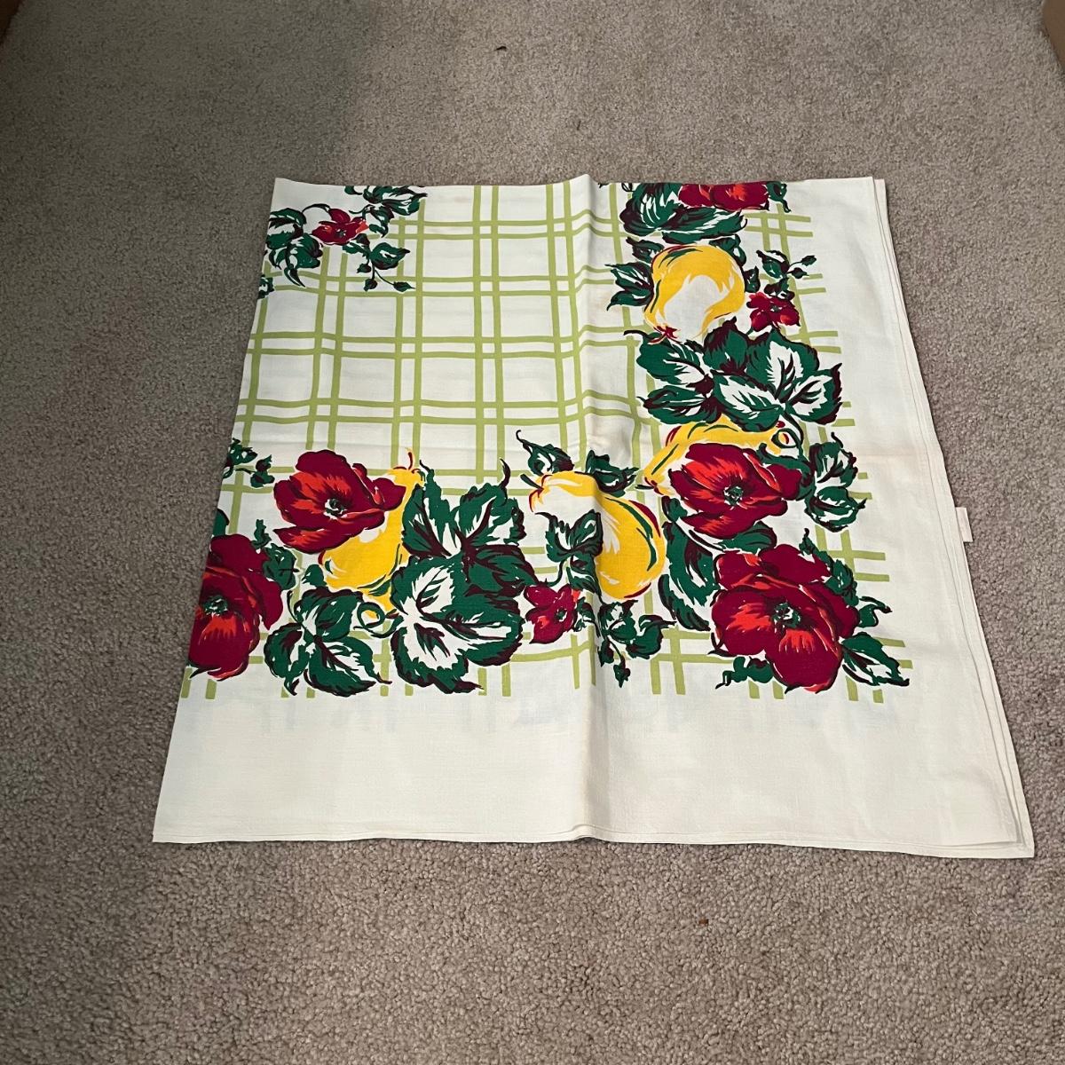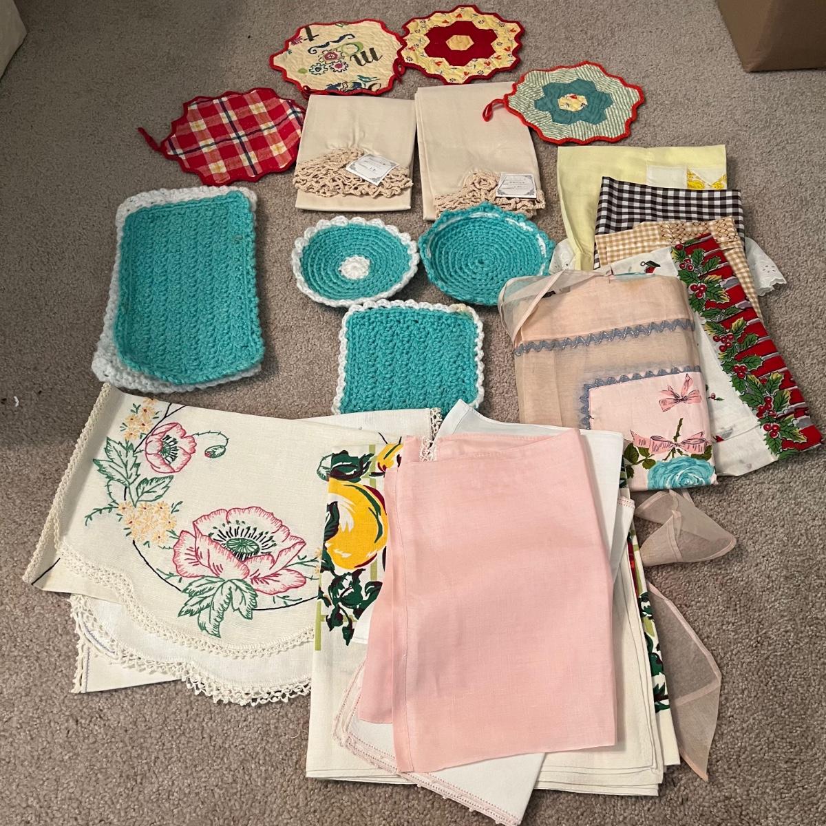 Lot contains a selection of linens that includes two aprons, table cloth, napkins, pot holders and more. Tablecloth measures 44” x 48”.