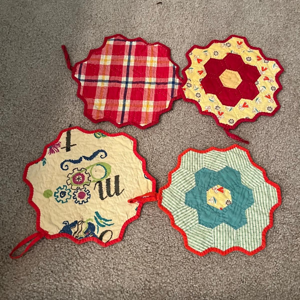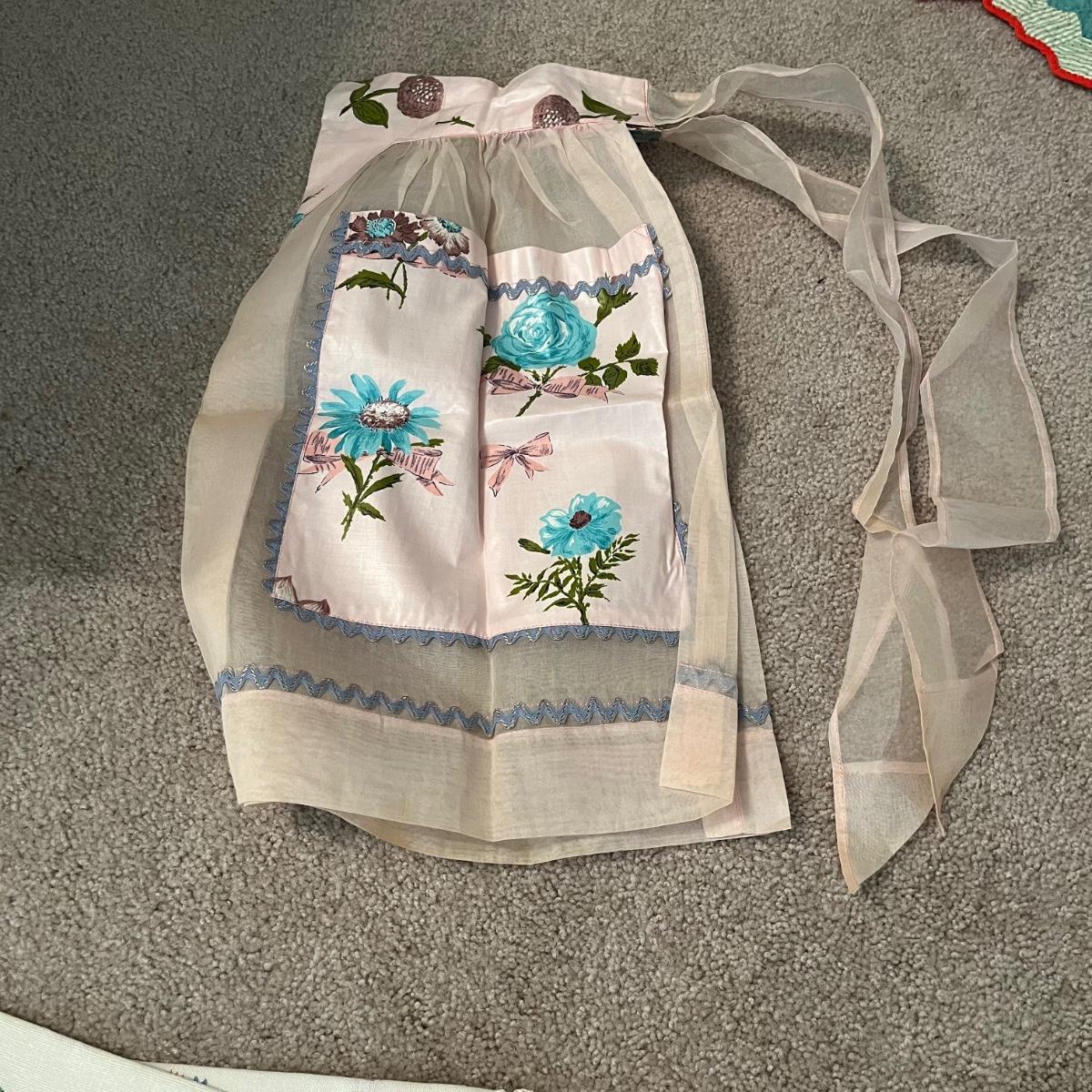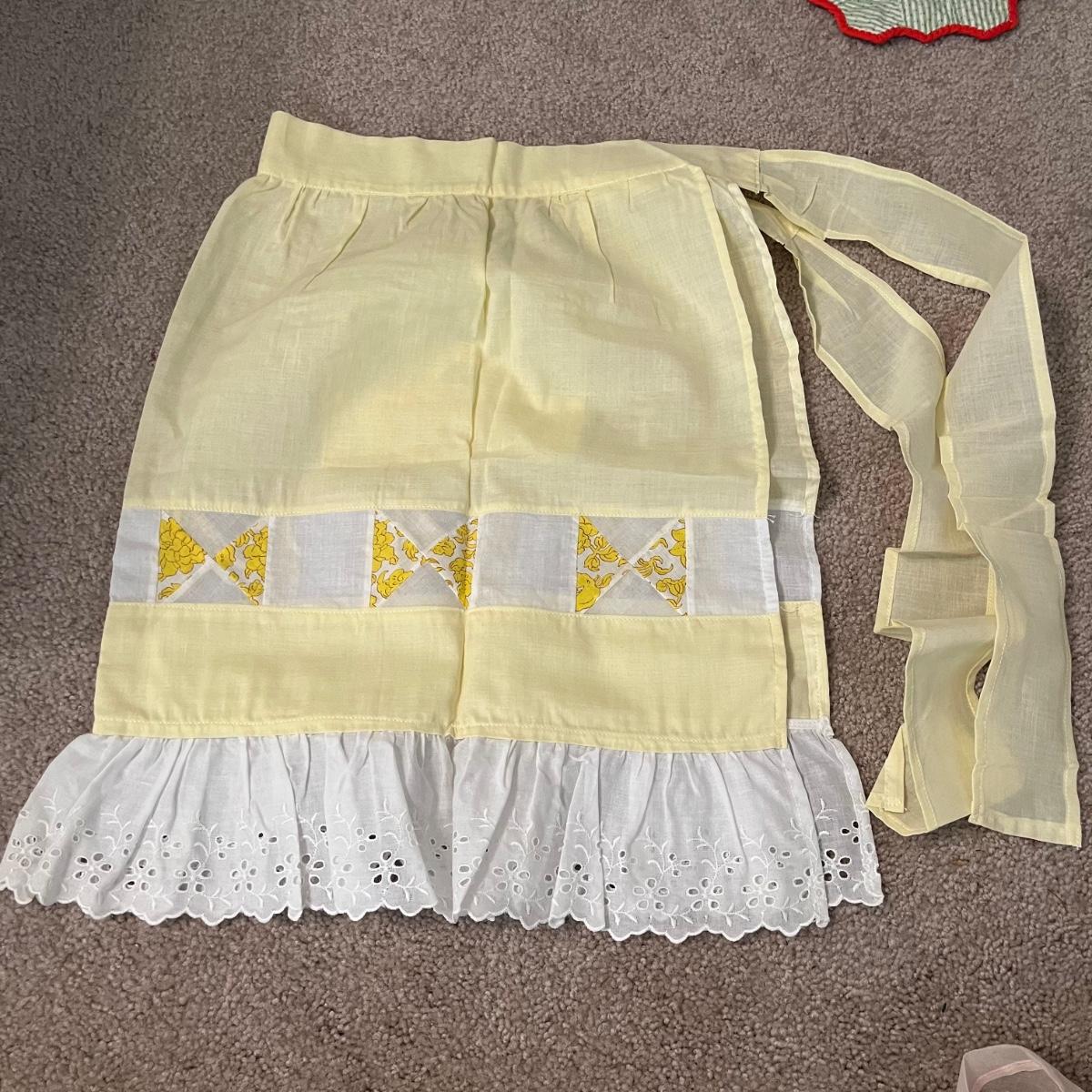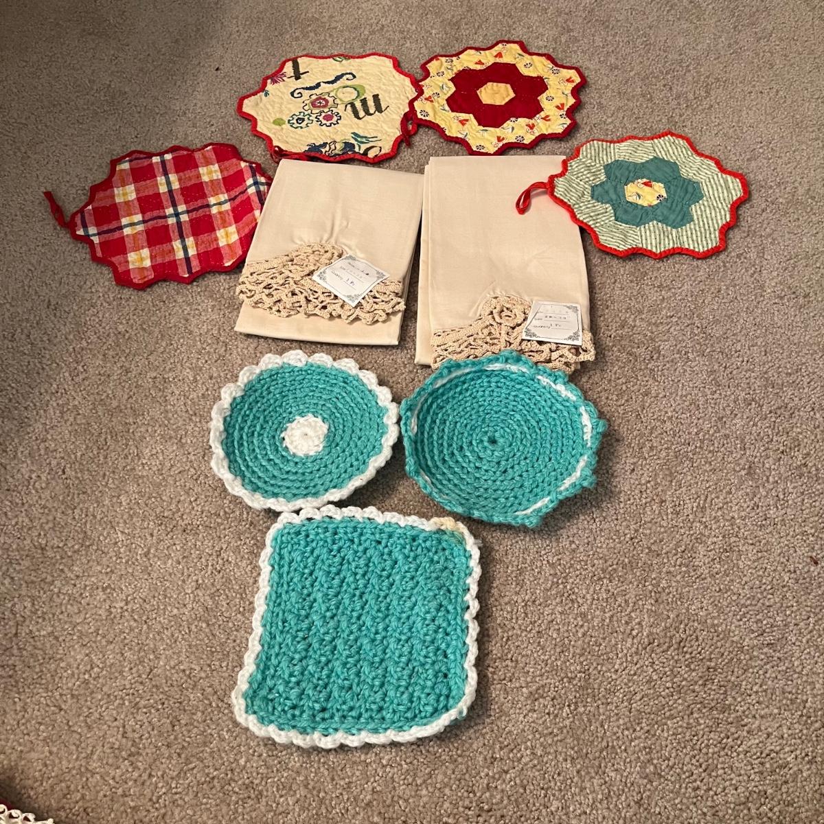 Lot contains a selection of linens that includes two aprons, table cloth, napkins, pot holders and more. Tablecloth measures 44” x 48”.