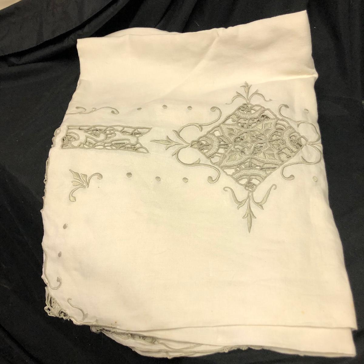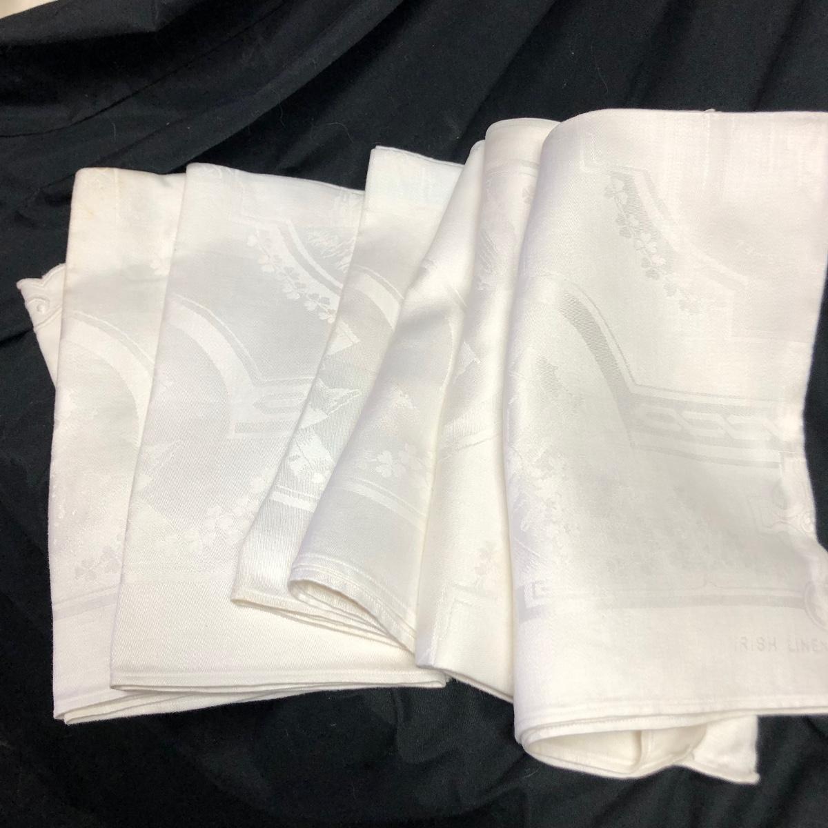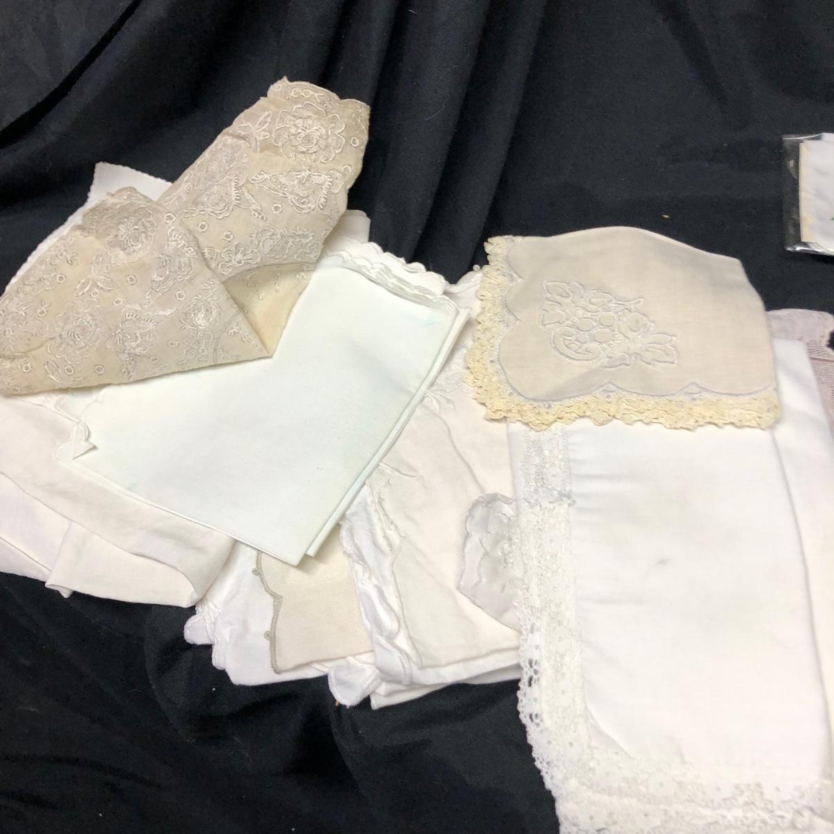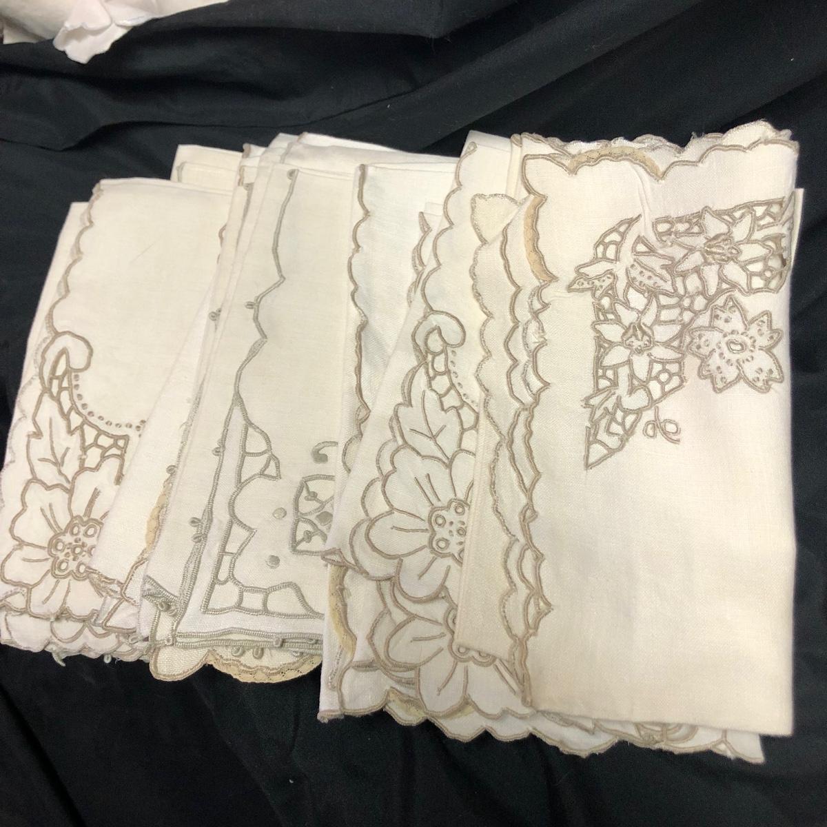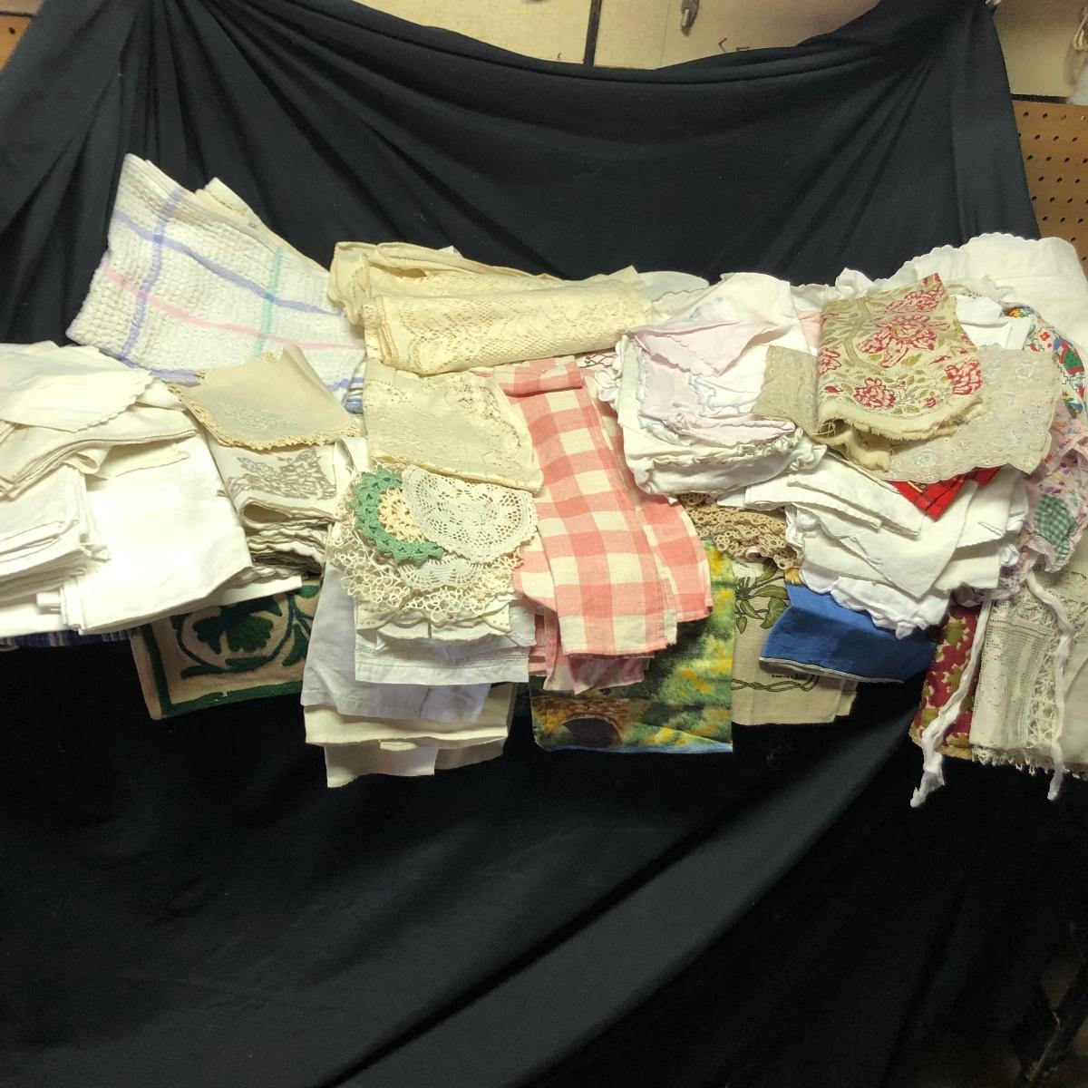 Lot includes a plethora of table linens in a variety of colors and materials. There is Irish linen, hand loomed rug, doilies, an apron, cloth napkins, and more. Largest tablecloth measures 64” x 84”.