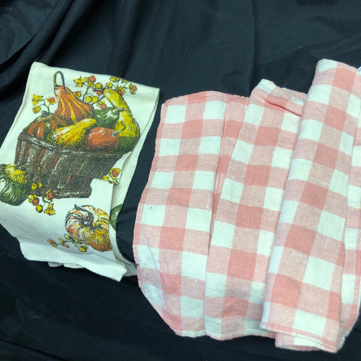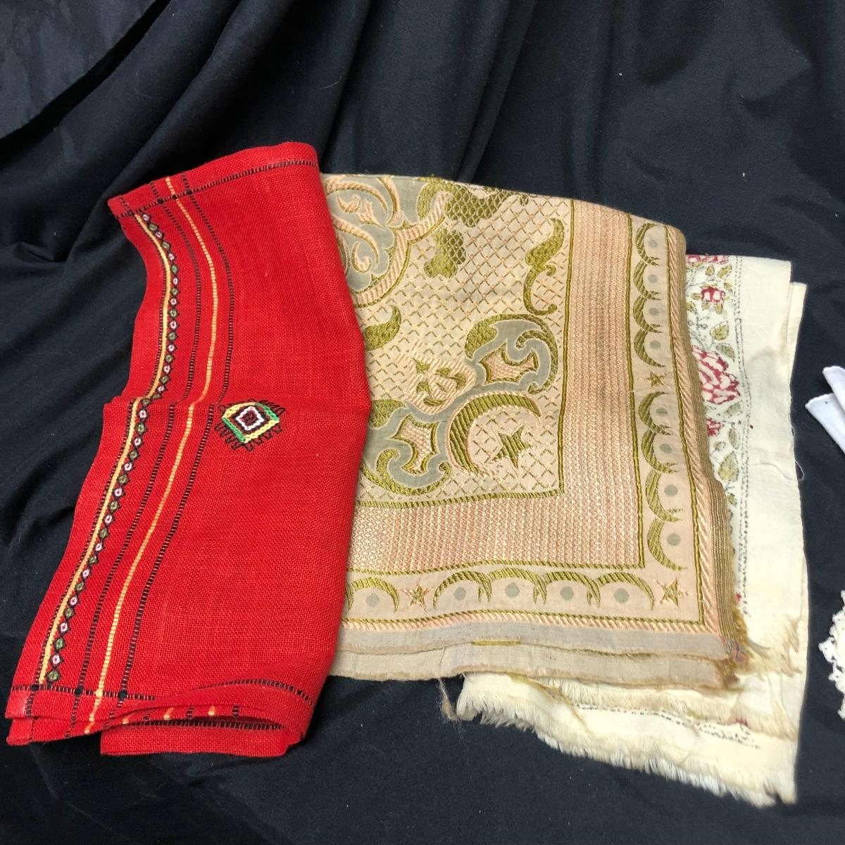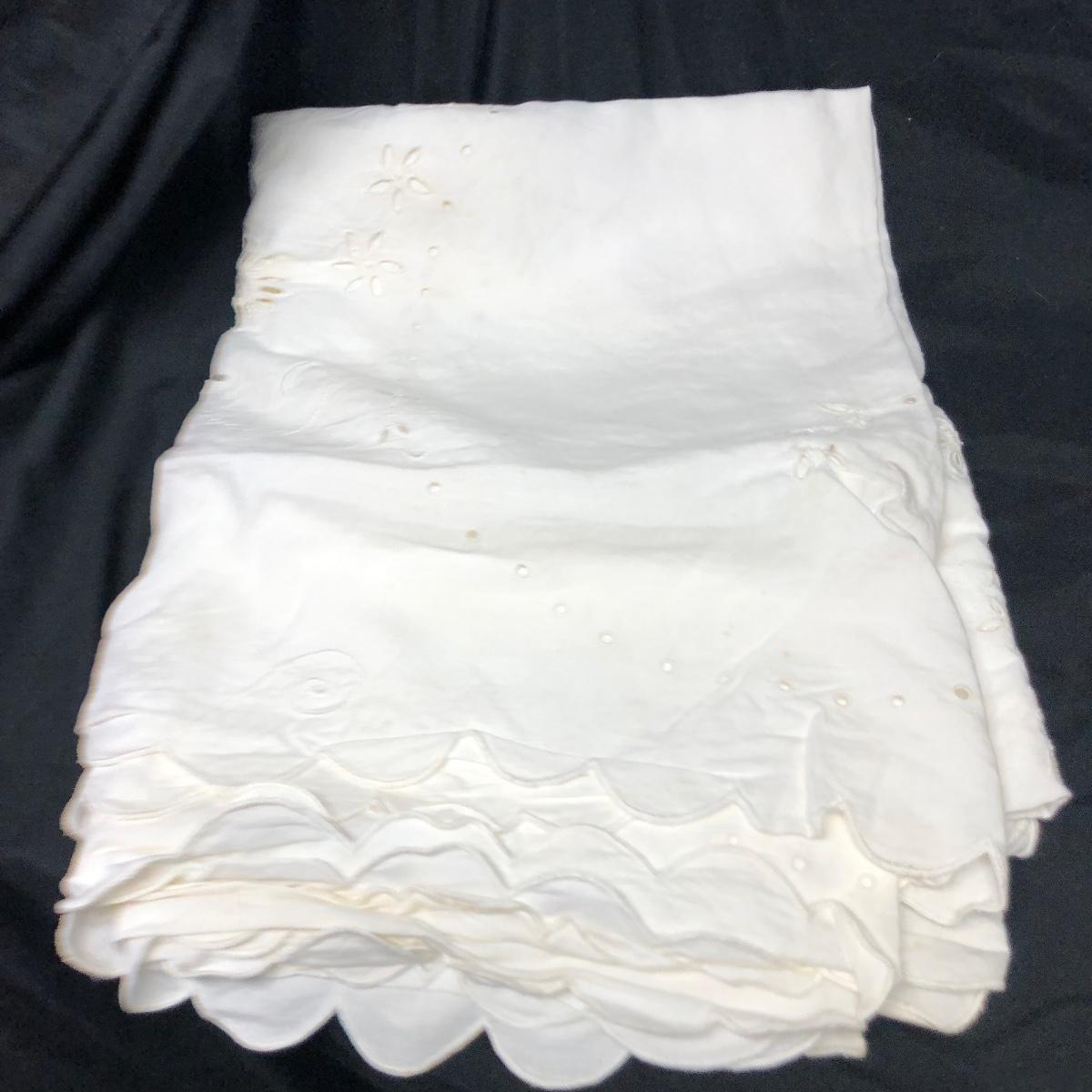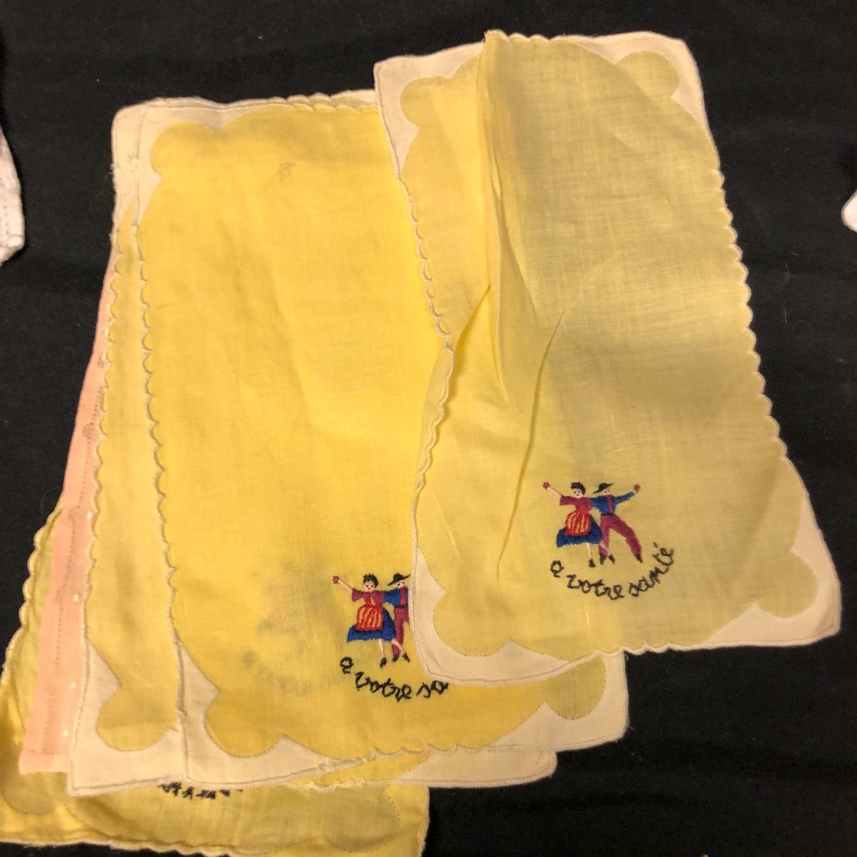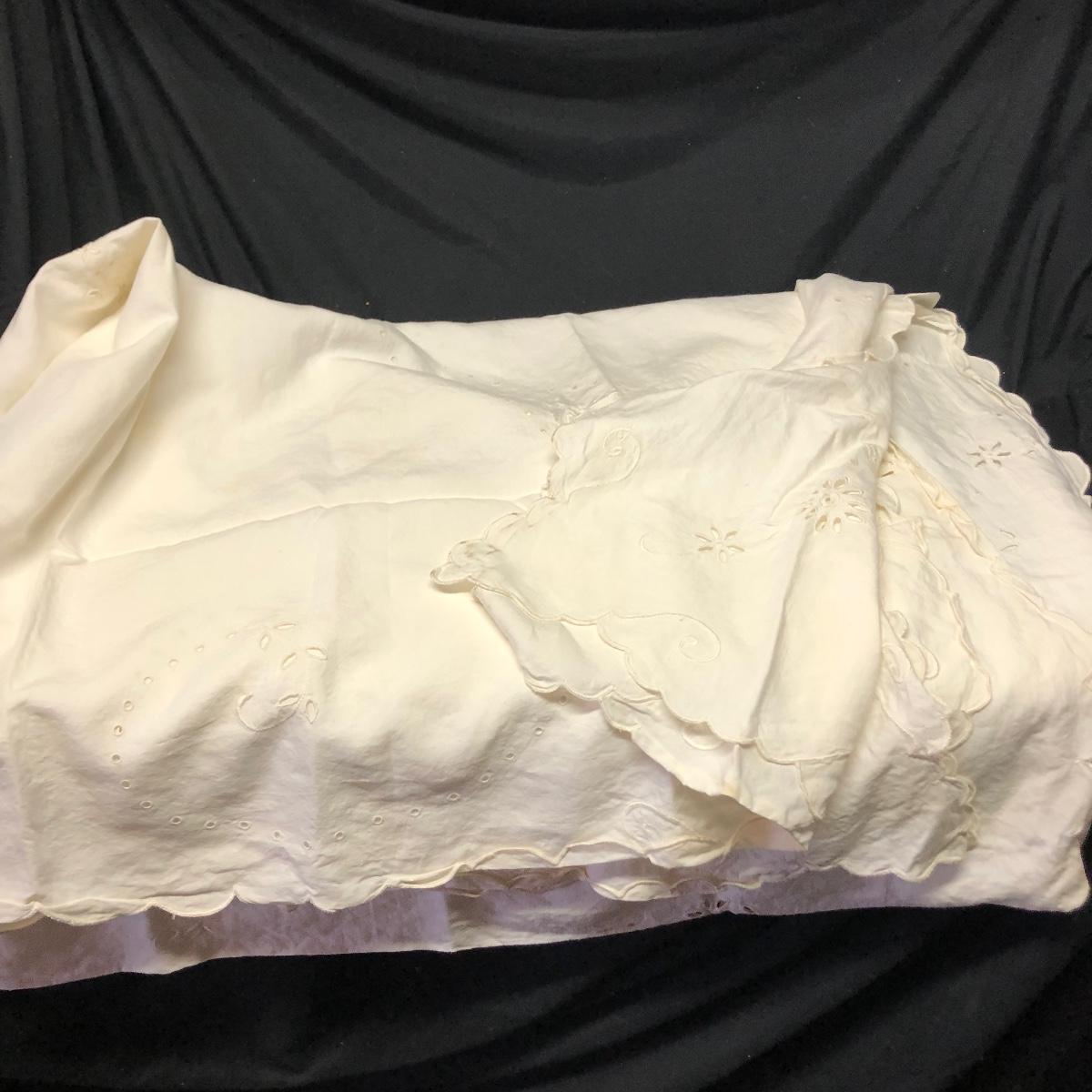 Lot includes a plethora of table linens in a variety of colors and materials. There is Irish linen, hand loomed rug, doilies, an apron, cloth napkins, and more. Largest tablecloth measures 64” x 84”.
