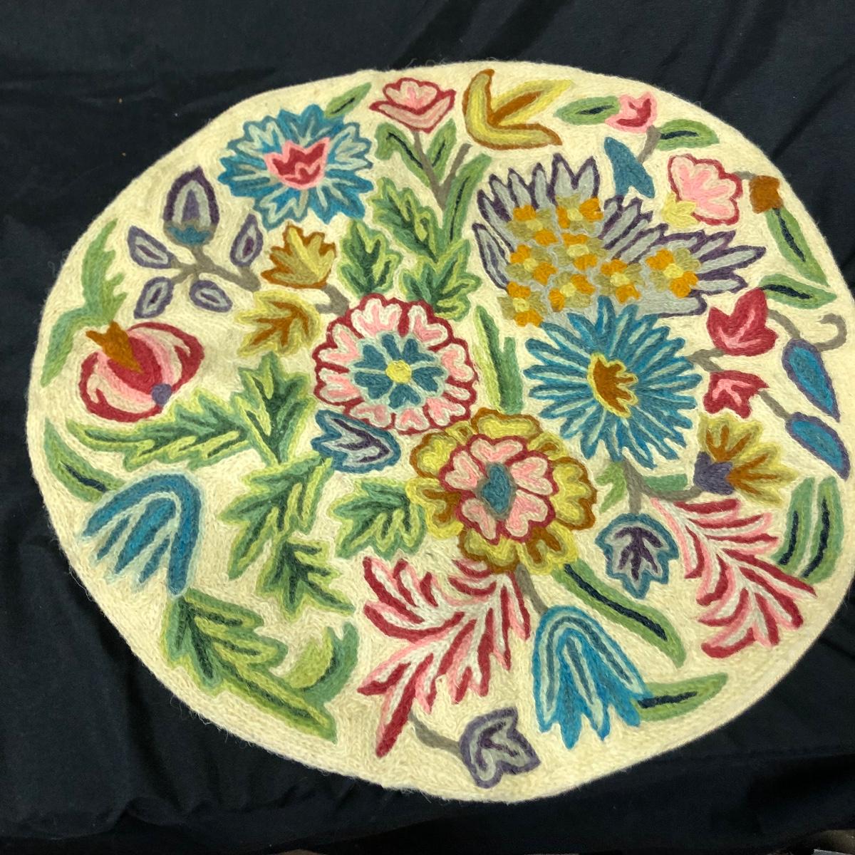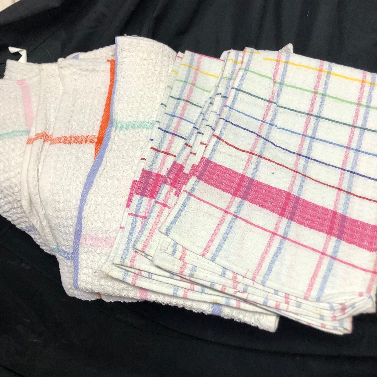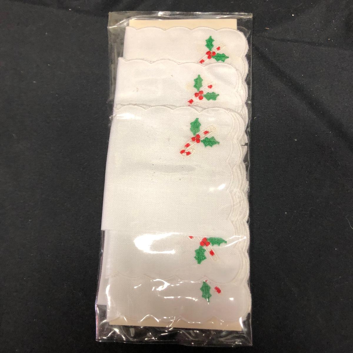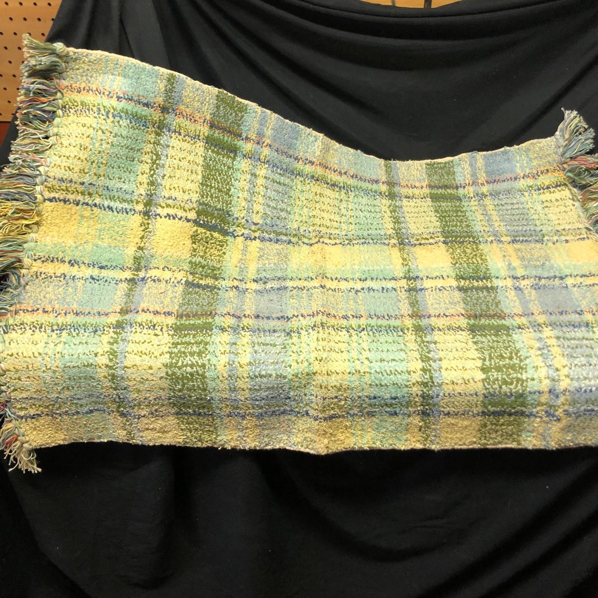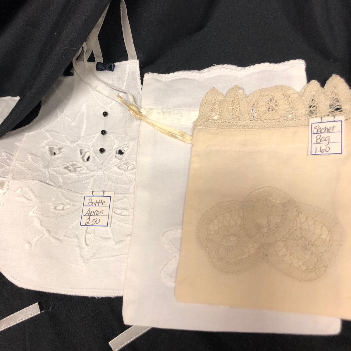 Lot includes a plethora of table linens in a variety of colors and materials. There is Irish linen, hand loomed rug, doilies, an apron, cloth napkins, and more. Largest tablecloth measures 64” x 84”.