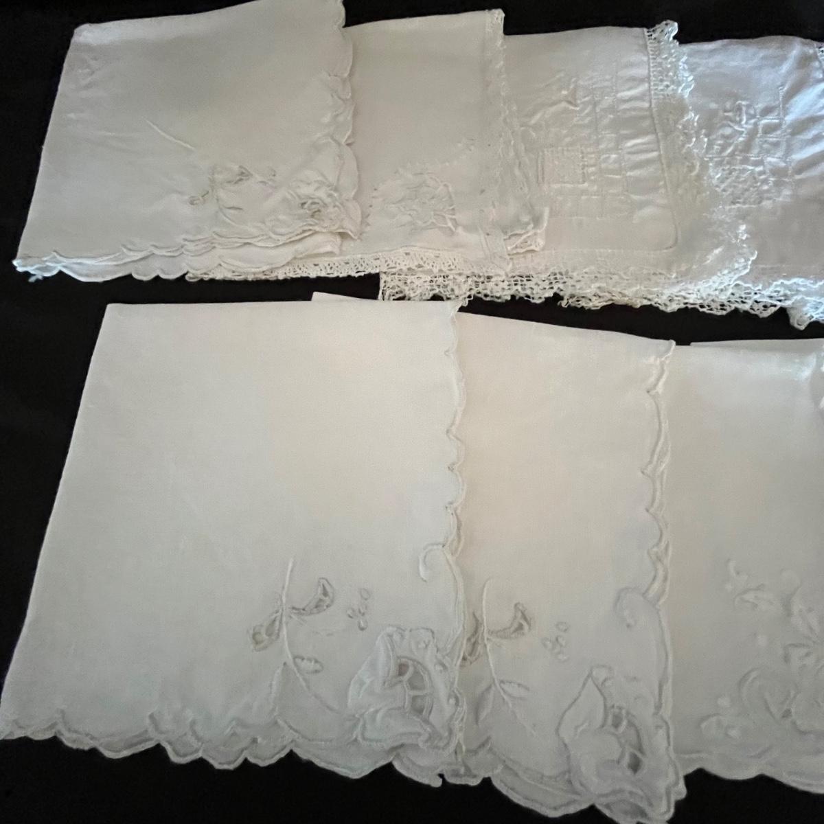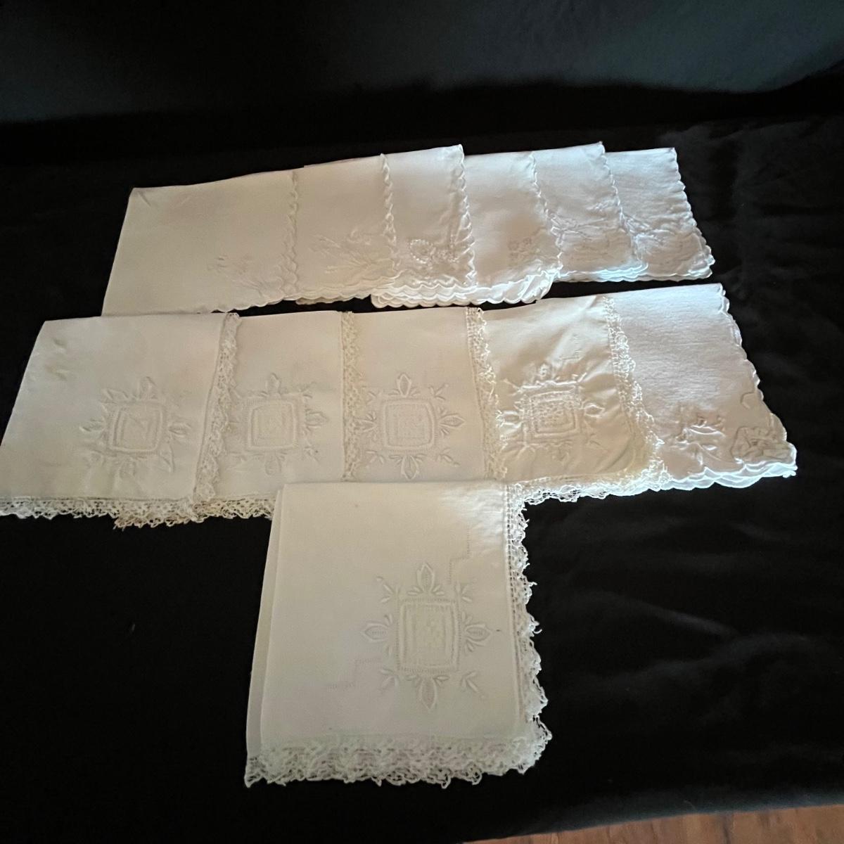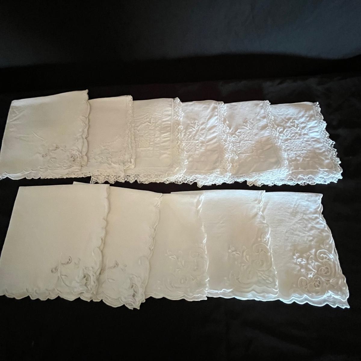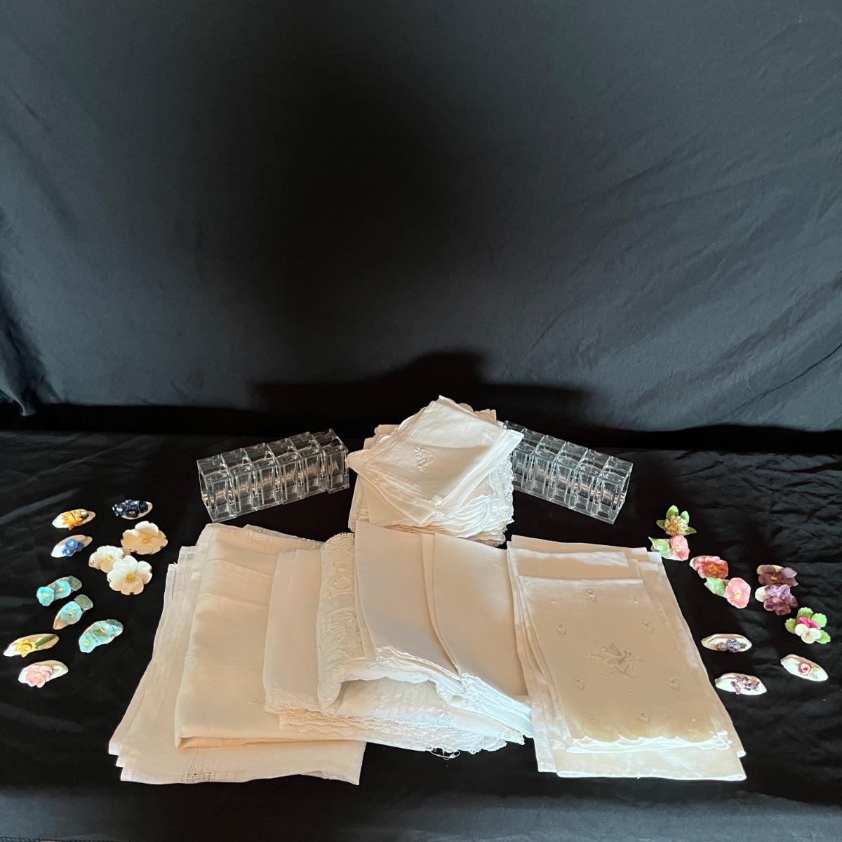 Lot includes a large variety of linens in many sizes. Also includes ceramic flower place card holders, two bone China flowers, twelve plastic napkin rings, a table runner, and two small table cloths. Largest cloth measures 33” x 33”.