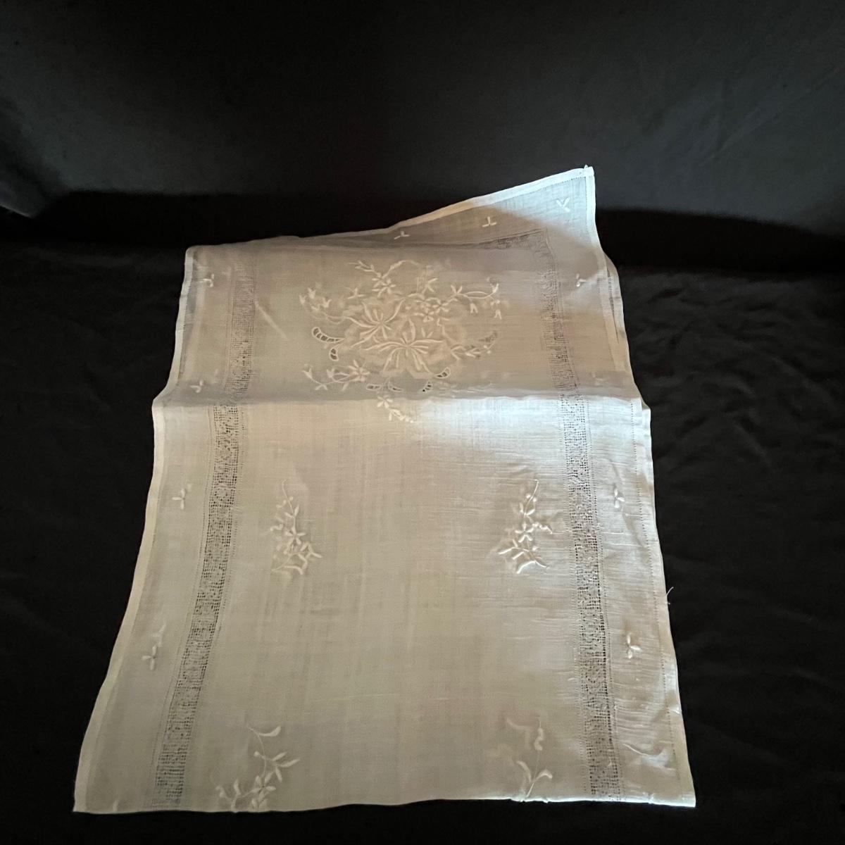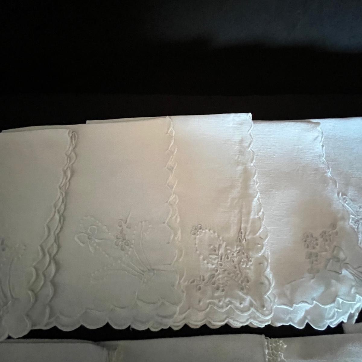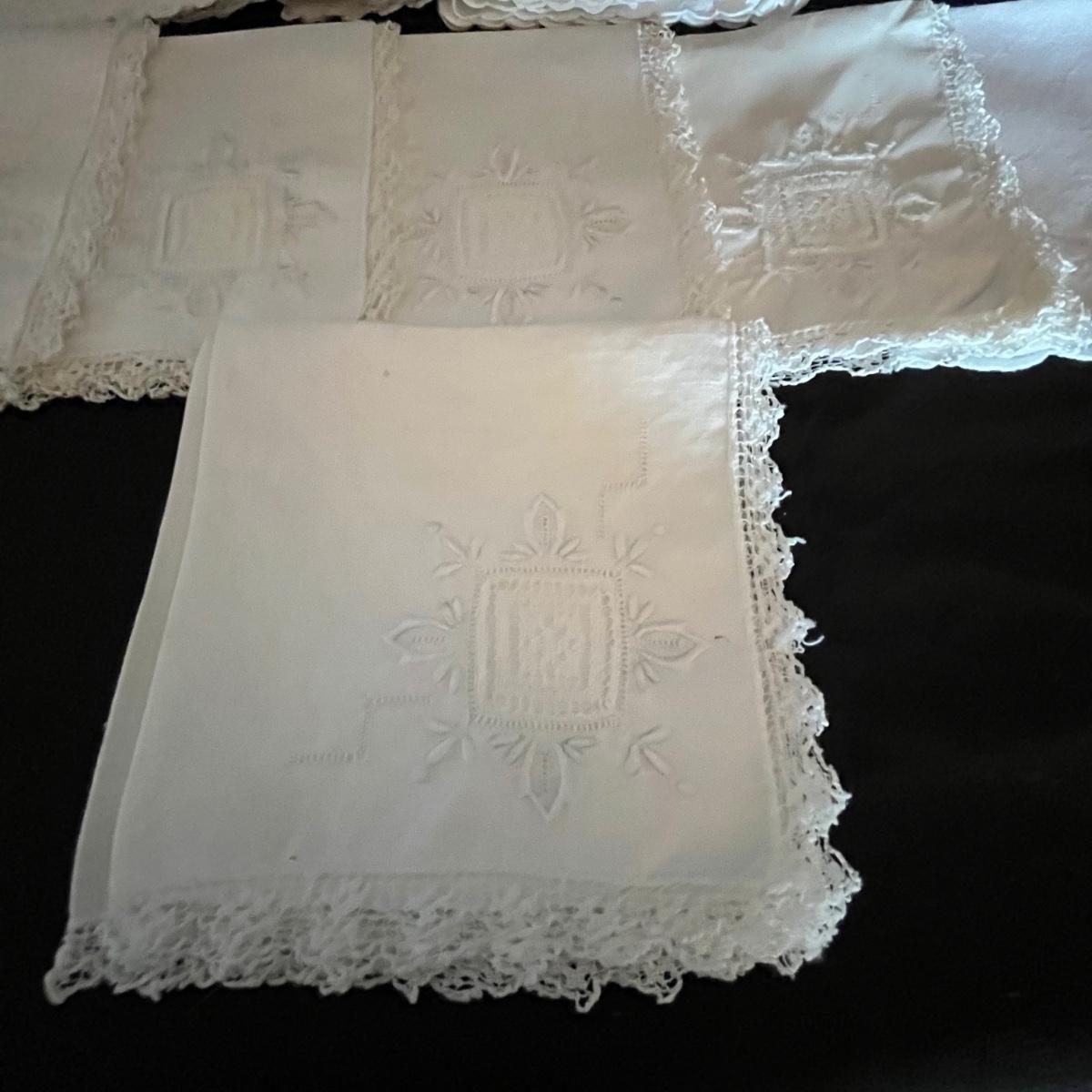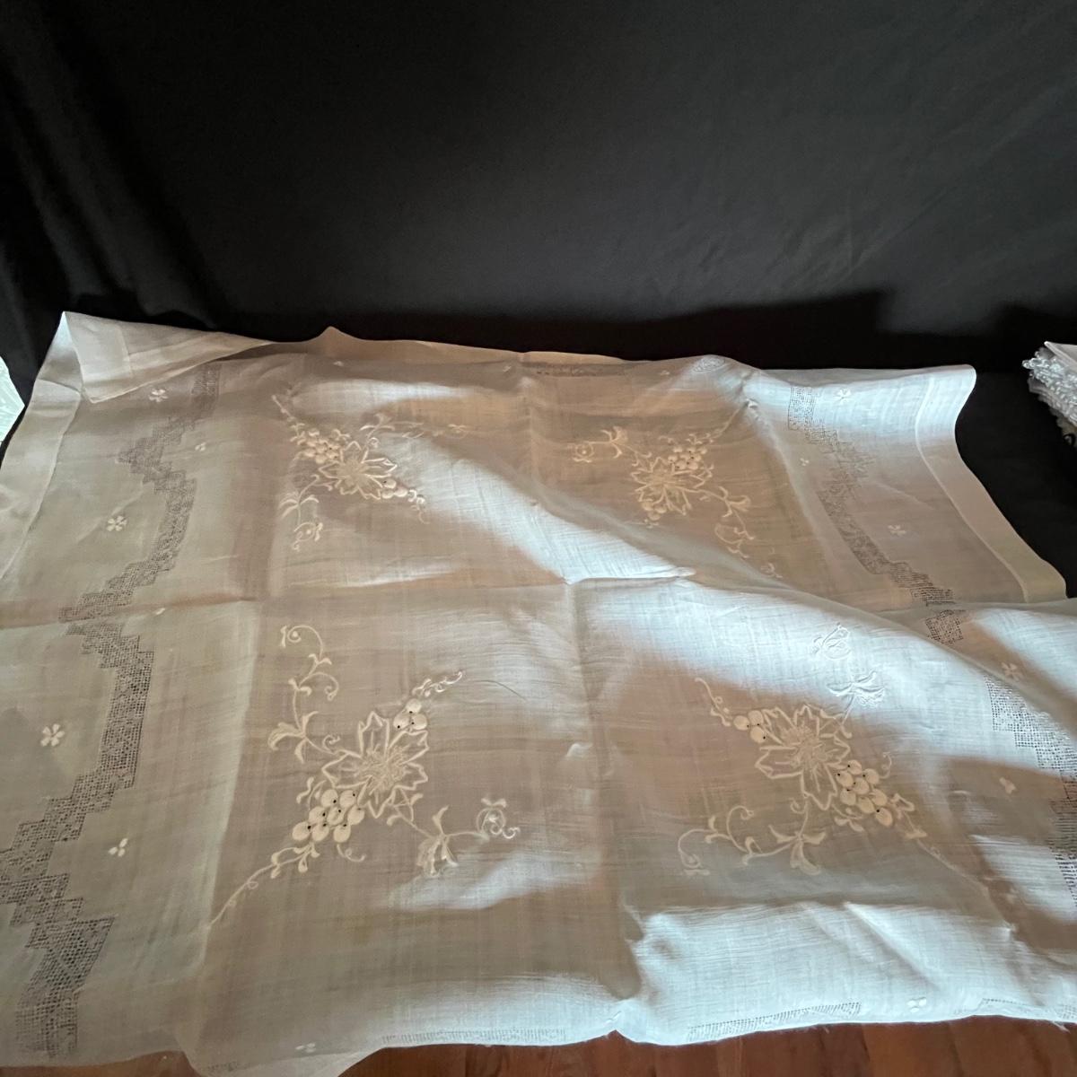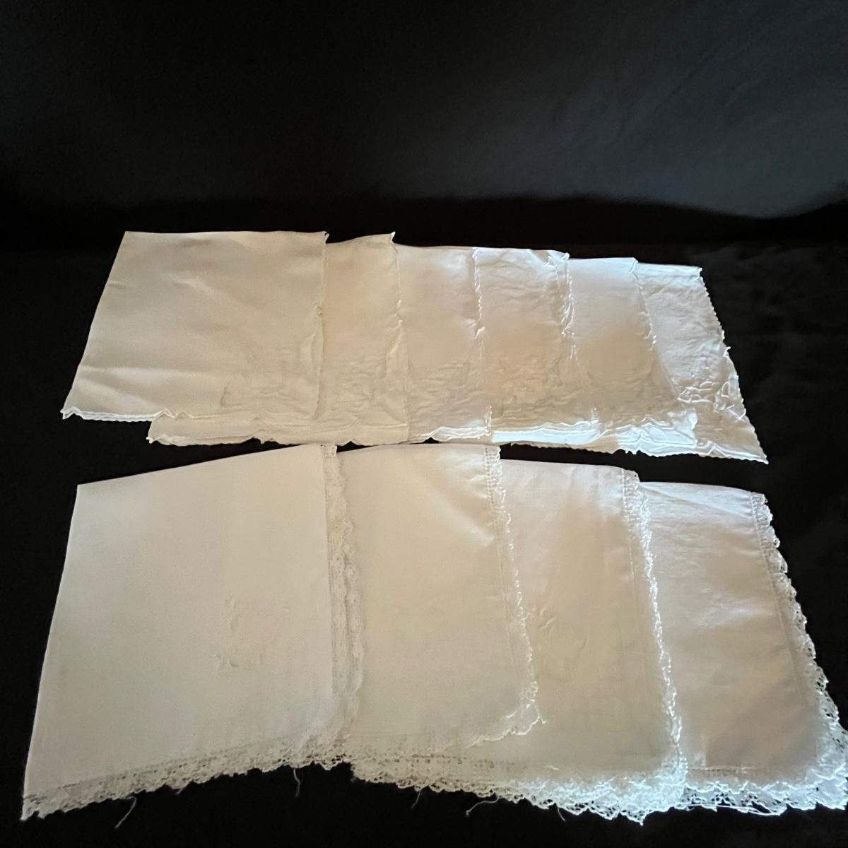 Lot includes a large variety of linens in many sizes. Also includes ceramic flower place card holders, two bone China flowers, twelve plastic napkin rings, a table runner, and two small table cloths. Largest cloth measures 33” x 33”.
