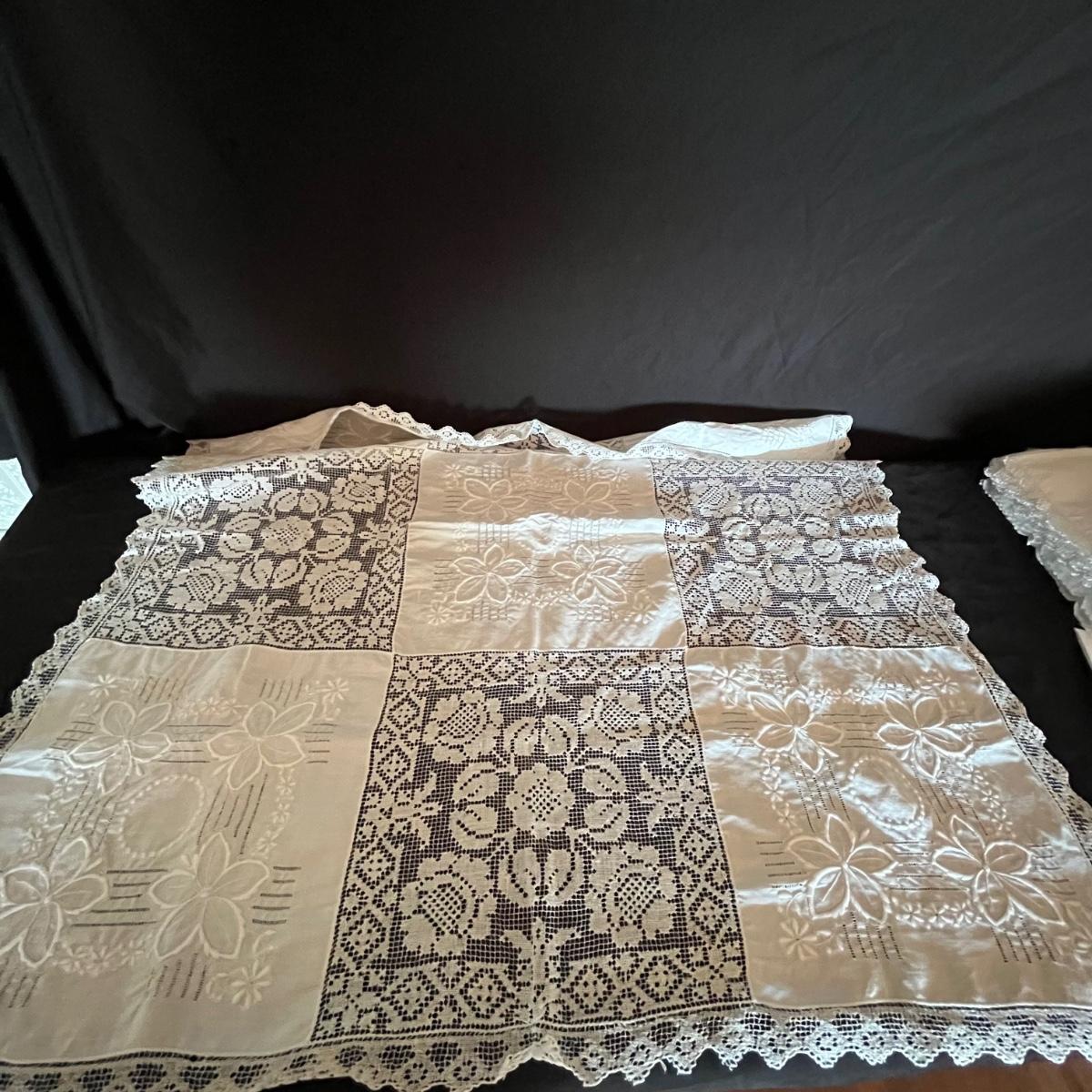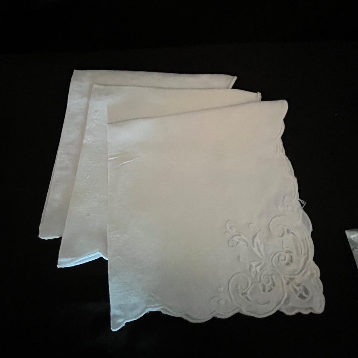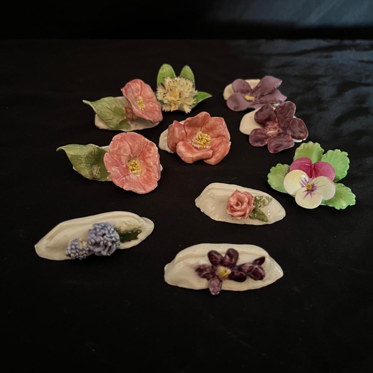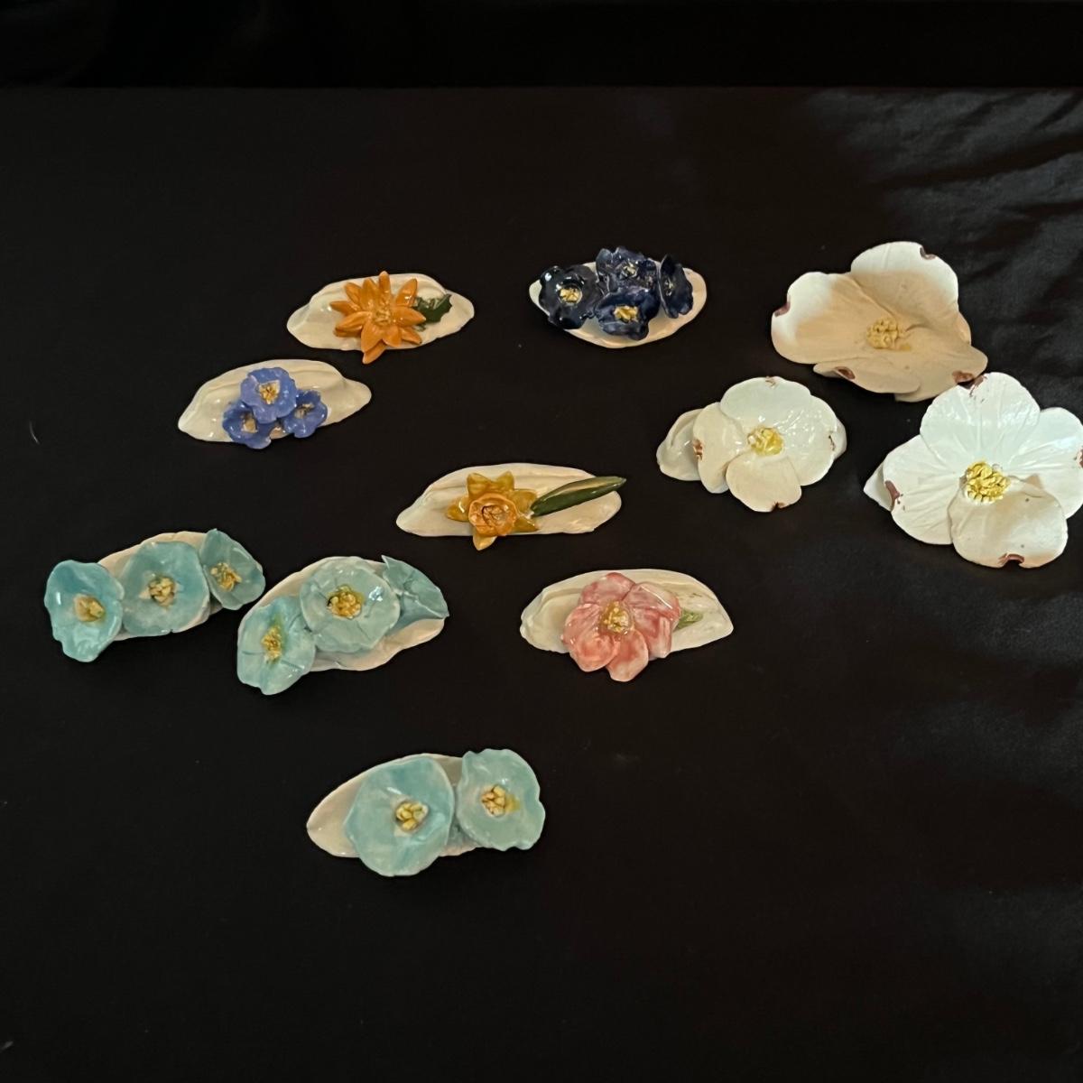 Lot includes a large variety of linens in many sizes. Also includes ceramic flower place card holders, two bone China flowers, twelve plastic napkin rings, a table runner, and two small table cloths. Largest cloth measures 33” x 33”.