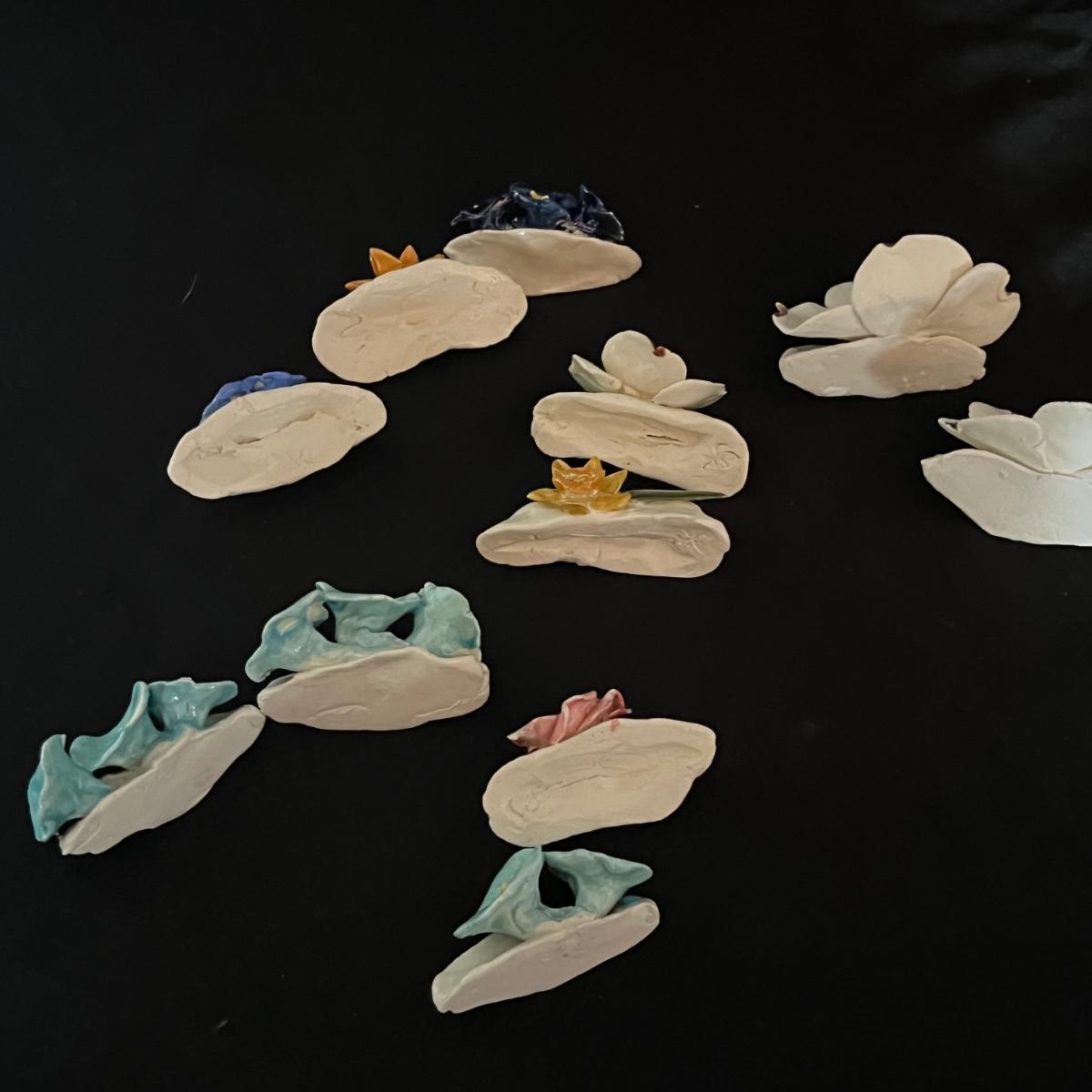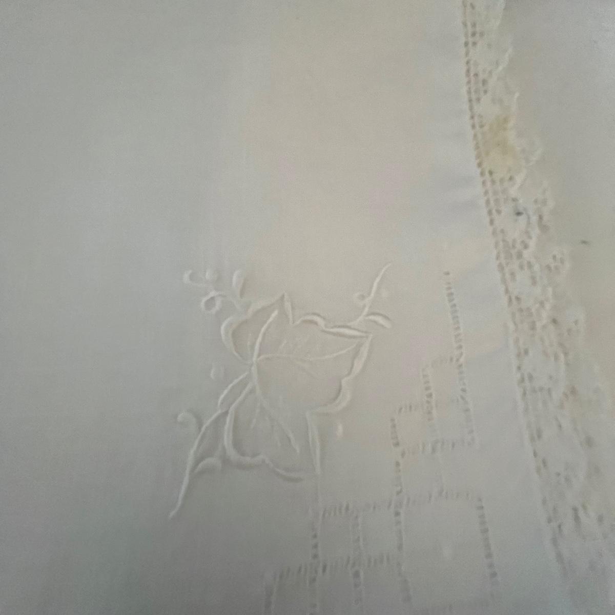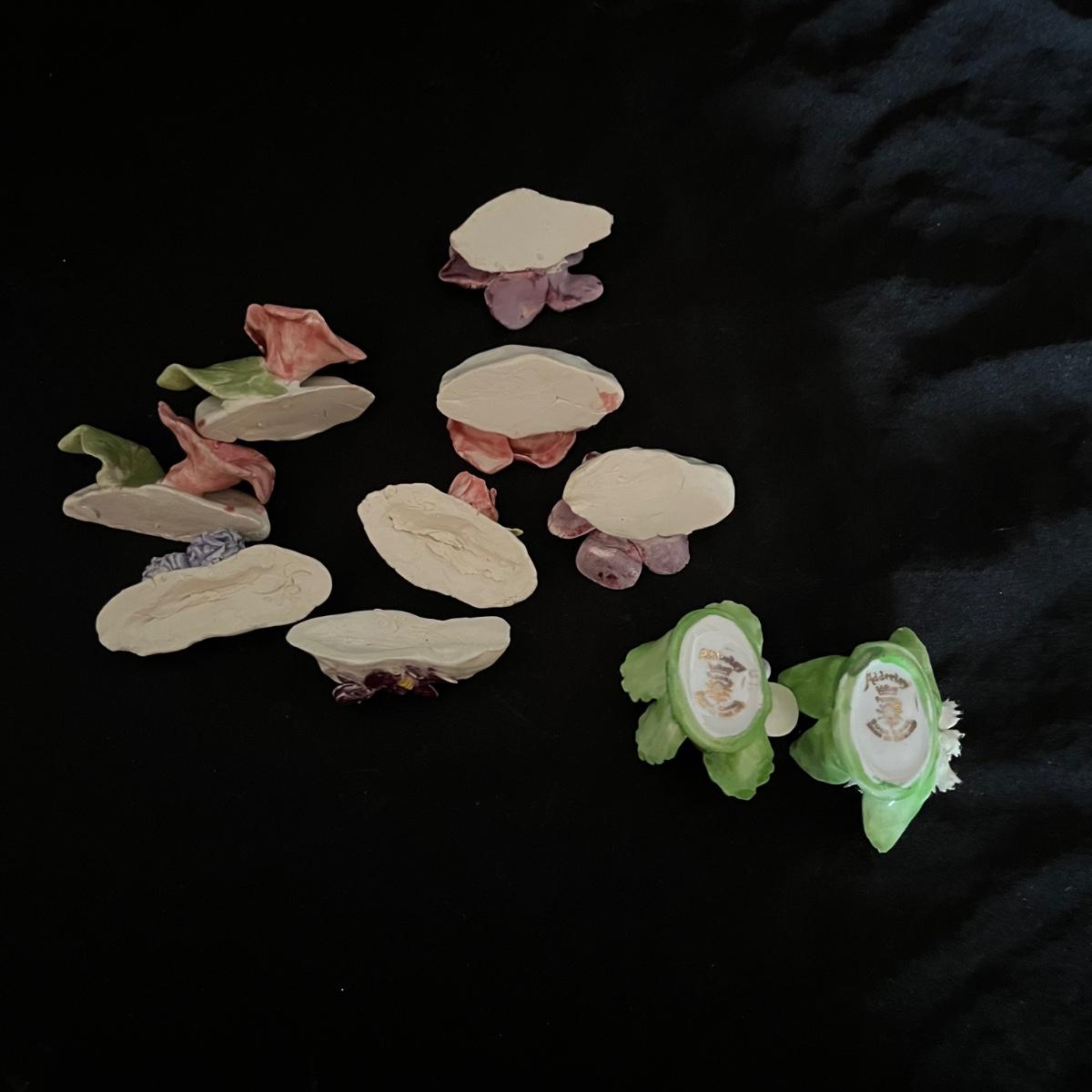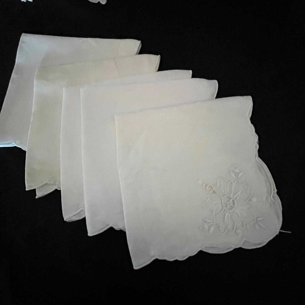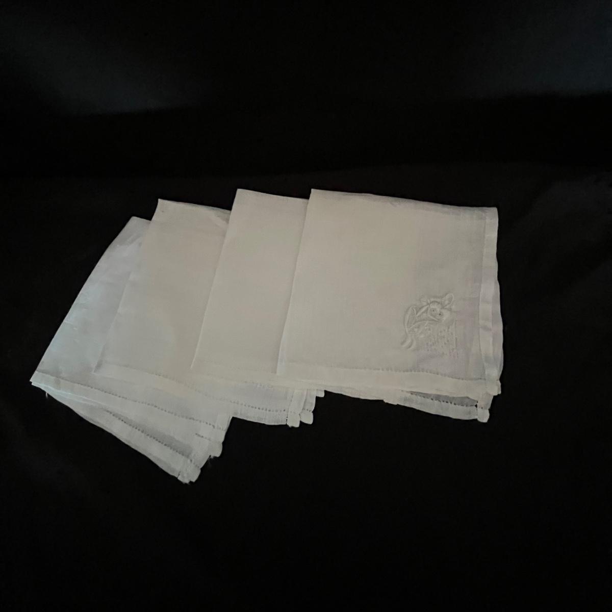 Lot includes a large variety of linens in many sizes. Also includes ceramic flower place card holders, two bone China flowers, twelve plastic napkin rings, a table runner, and two small table cloths. Largest cloth measures 33” x 33”.