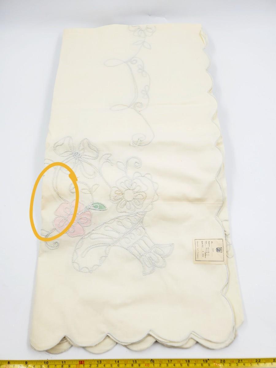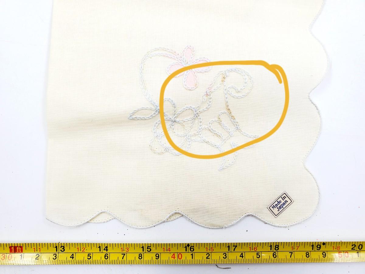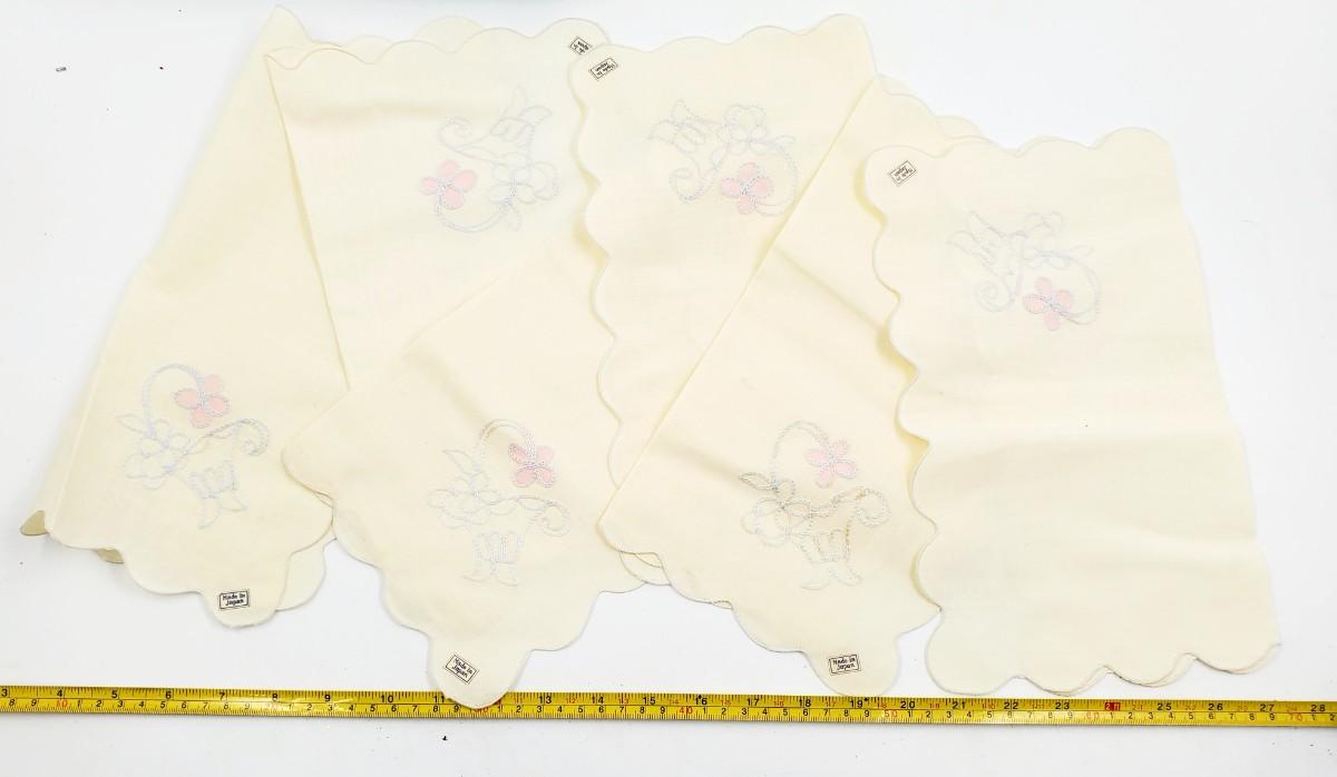 Pastel linen embroidered tablecloth and matching napkins, tablecloth has a small area of discoloration, and one napkin has discoloration, see photo.
