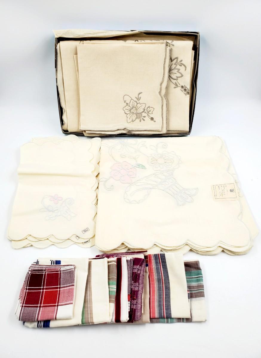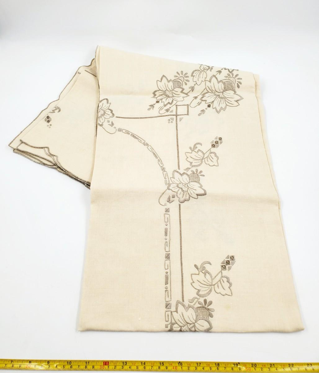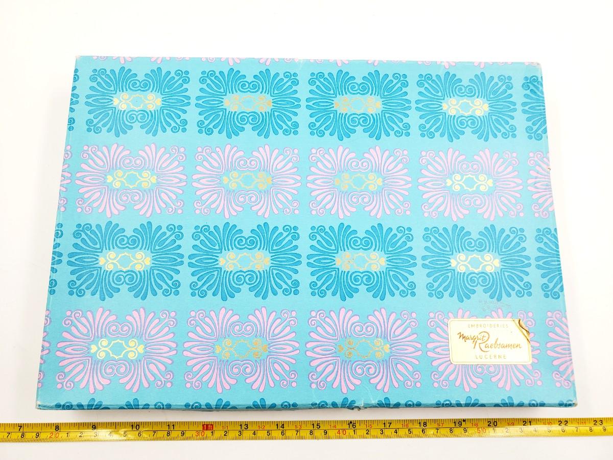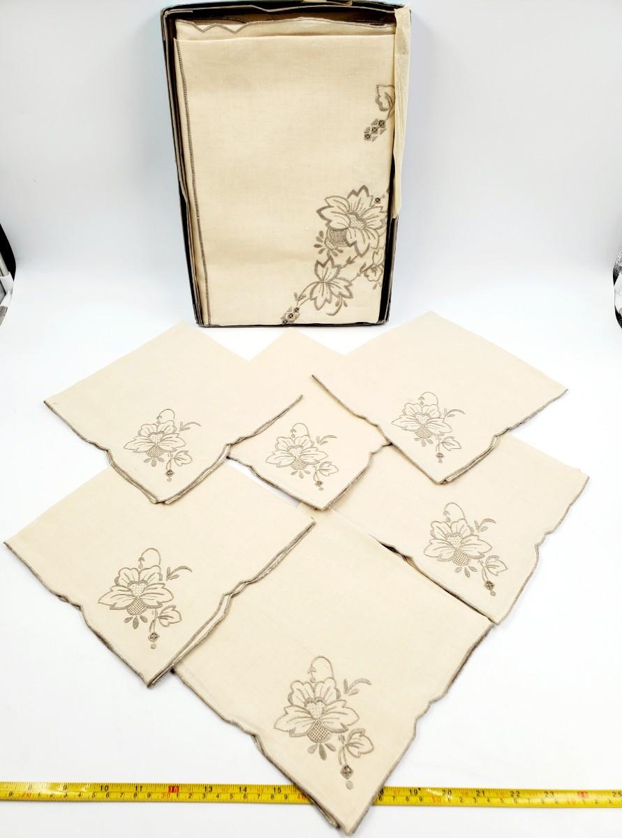 Very pretty boxed Margrit Raebsamen Embroidered Linens, tablecloth and napkins. Good condition, approximately 68in by 48in