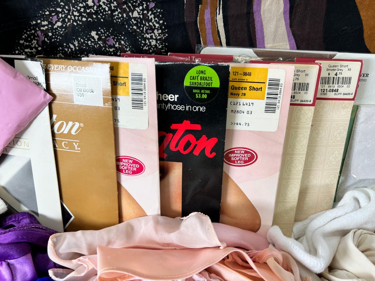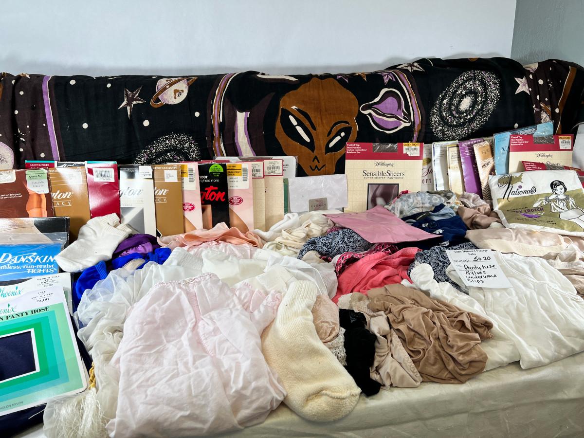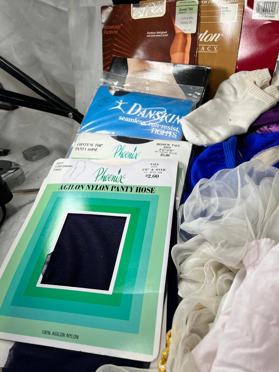 Many pairs of nylon panty hose mostly Queen Short, Fun Alien printed throw, clothing vintage, new and used.