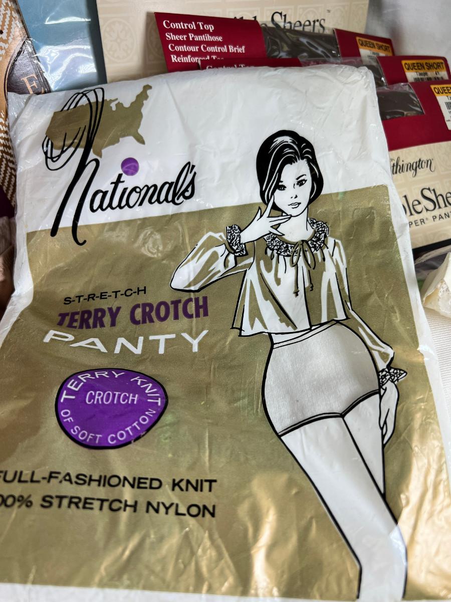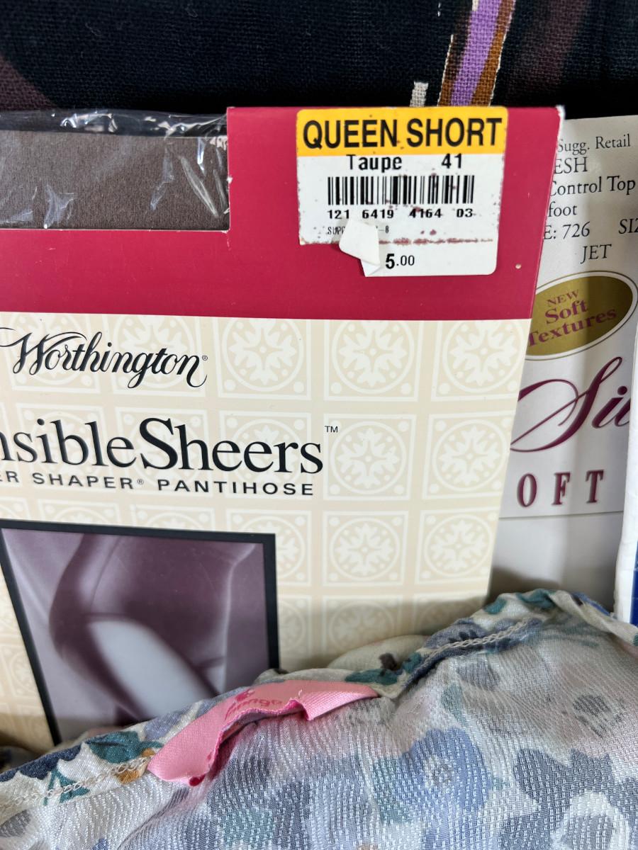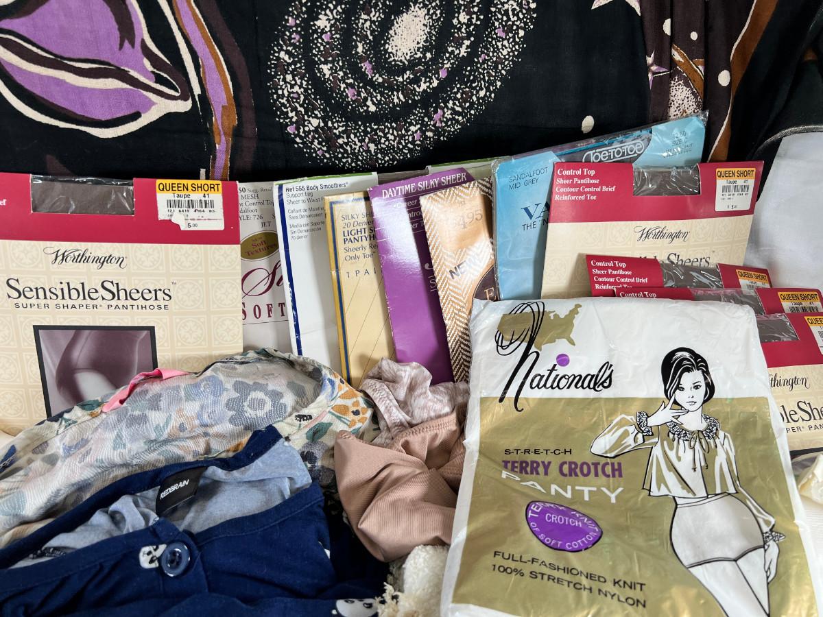 Many pairs of nylon panty hose mostly Queen Short, Fun Alien printed throw, clothing vintage, new and used.